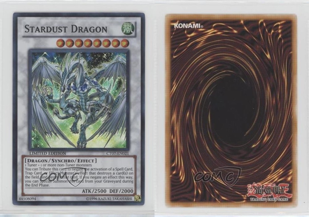 2010 Yu-Gi-Oh! Series 7 - Collectors Tins Limited Edition Promos #CT07-EN021 Stardust Dragon COMC Item: 172653387 - YuGiOh Card - Featuring Stardust Dragon Search for more: 2010 Yu-Gi-Oh! Series 7 Search for more: 2010 Yu-Gi-Oh! Series 7 - Collectors Tins Limited Edition Promos View all of our Listings Auctions Buy It Now About Us Located in the beautiful Pacific Northwest, COMC (Check Out My Cards) is the world's largest consignment service for trading card singles. More than 10,000 people have used our consignment service to list over 50 million trading cards. Find out how we can help you consign your items on eBay by contacting us through eBay messaging. COMC -- "The Safe & Easy Way to Buy & Sell" Raw Condition for Modern Cards Unless otherwise noted, raw modern cards are listed in Near Mint-Mint condition or better. A NM-MT card appears to be Mint at first glance, but upon closer inspection, may exhibit some of the following: minor print defects (e.g. roller marks, print line, dimple), minor scratches, slight edge wear, and slight corner wear. Centering is clearly visible in the images provided and does not factor into our condition assessment. Raw Condition for Vintage Cards Unless otherwise noted, raw vintage cards are listed in Excellent condition or better. An EX card may exhibit some of the following: minor rounding of corners, surface wear, print defects, light scratches, and slight edge wear/chipping. Centering is clearly visible in the images provided and does not factor into our condition assessment. Domestic Shipping Combined shipping for multiple items is available. To receive combined shipping, please ensure all desired items are in your eBay shopping cart before proceeding to checkout. eBay limits orders to 40 items per order. We automatically combine multiple orders placed on the same day. If you place multiple orders on the same day, please contact us to request a refund of applicable shipping costs. Signature confirmation may be required on invoices over $400. All cards are protected and shipped securely. International Shipping COMC offers eBay's International Shipping (EIS) for international orders under $2,500* (see country exceptions below). All duties and import fees are paid at checkout; in the rare event that there are additional import fees upon delivery, these are borne by the buyer. EIS packages route through a shipping hub in Erlanger, KY before shipping to their final destination. Please note that EIS does not allow for combined shipments. The shipping rates are determined by eBay and cannot be adjusted. *Maximum sale price exceptions: Colombia, Kuwait ($2,000); Taiwan ($1,539); Chile, Costa Rica, Guatemala, Honduras, Trinidad and Tobago ($1,000); Antigua and Barbuda, Aruba, Belize, Dominica, Grenada, Philippines, Saint Kitts and Nevis, Saint Lucia, Montserrat, Turks and Caicos Islands ($500); Dominican Republic, El Salvador ($200). Please request a shipping quote through eBay messaging for orders that exceed the maximum sale price supported by eBay's International Shipping. You will be responsible for all duties and import fees for international orders shipped outside the EIS. All cards are protected and shipped securely. Payment COMC does not accept offers on our cards through our eBay storefront. COMC utilizes eBay’s managed payments system. If you are experiencing difficulties making a payment, please contact eBay for assistance. Return Policy Returns are only accepted on the rare occasion the item is not as described. If you are making a return, please initiate the return process through eBay so a mailing label can be provided for you. Prior to listing, our expert team carefully assessed this item to represent it accurately. Please review the description and high-definition images prior to purchasing to ensure this item meets your satisfaction. We welcome you to contact us if you have further questions about this item. Trust and Integrity COMC carefully assesses each item consigned to us to prevent fraudulent items from entering the marketplace. If you believe an item offered on COMC may be fraudulent, please contact us with details so we can investigate the issue. Items we determine are outside our supported items policy may be removed. Last Modified: 6/17/2025 5:07:27 PM PDT
