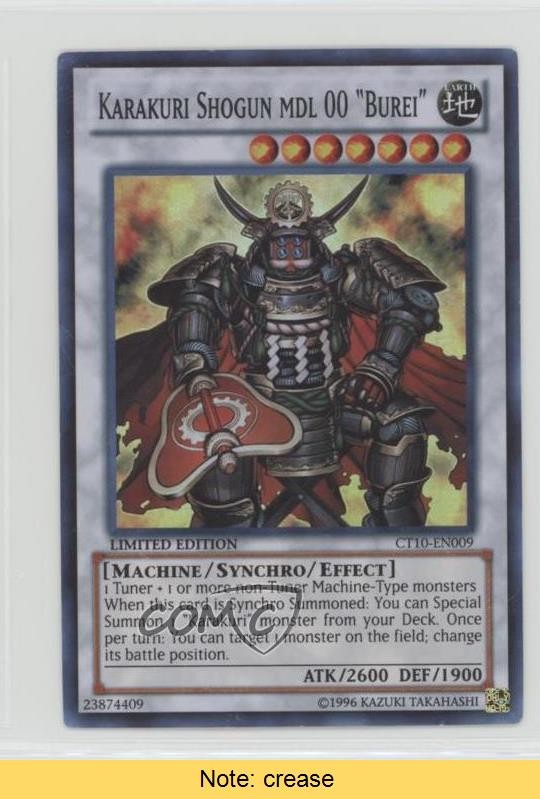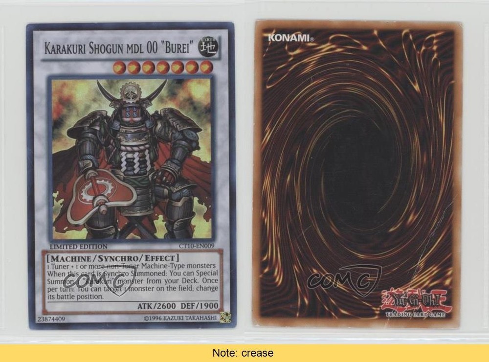 This Karakuri Shogun Burei card is a must-have for any Yu-Gi-Oh! collector—even with the minor crease, it's a great addition to a deck or display. The 2013 limited edition promo still holds up well, and COMC's reliable service makes buying easy. Love the Karakuri archetype, and this card delivers solid playability while keeping that nostalgic Series 10 charm. Perfect for fans of the era!