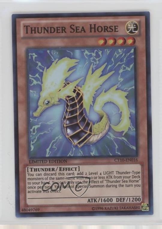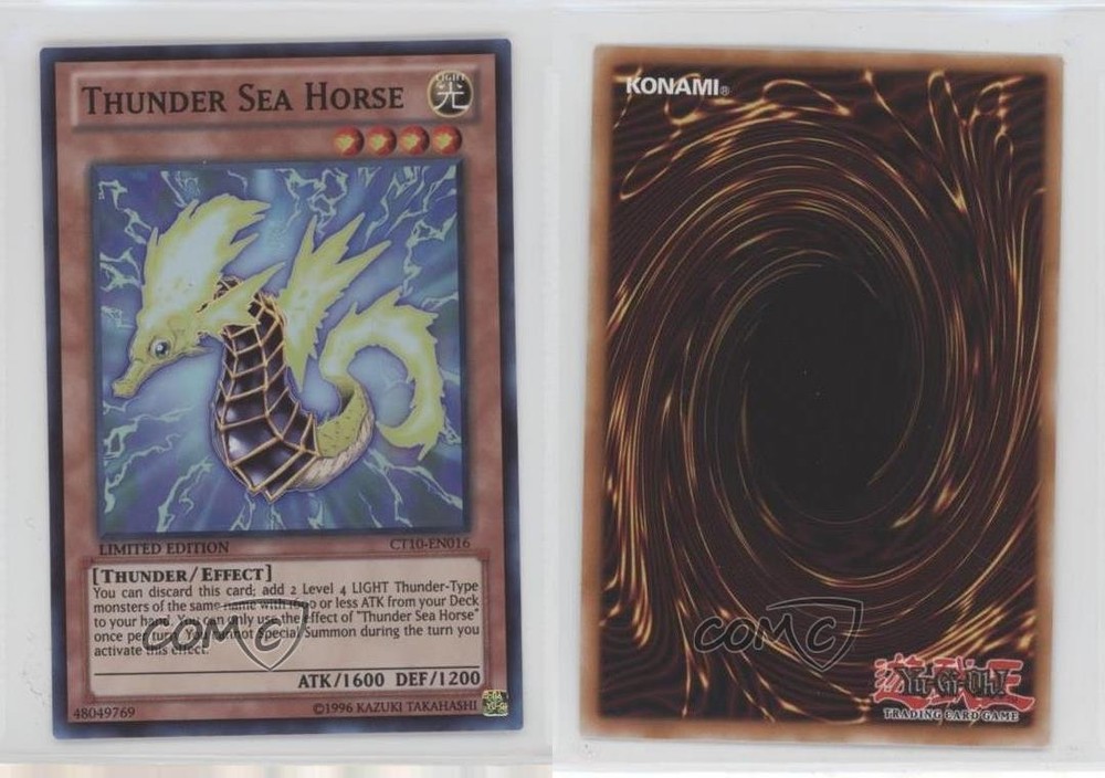 2013 Yu-Gi-Oh! Series 10 - Collectors Tins Limited Edition Promos #CT10-EN016 Thunder Sea Horse COMC Item: 172300457 - YuGiOh Card - Featuring Thunder Sea Horse Search for more: 2013 Yu-Gi-Oh! Series 10 Search for more: 2013 Yu-Gi-Oh! Series 10 - Collectors Tins Limited Edition Promos View all of our Listings Auctions Buy It Now About Us Located in the beautiful Pacific Northwest, COMC (Check Out My Cards) is the world's largest consignment service for trading card singles. More than 10,000 people have used our consignment service to list over 50 million trading cards. Find out how we can help you consign your items on eBay by contacting us through eBay messaging. COMC -- "The Safe & Easy Way to Buy & Sell" Raw Condition for Modern Cards Unless otherwise noted, raw modern cards are listed in Near Mint-Mint condition or better. A NM-MT card appears to be Mint at first glance, but upon closer inspection, may exhibit some of the following: minor print defects (e.g. roller marks, print line, dimple), minor scratches, slight edge wear, and slight corner wear. Centering is clearly visible in the images provided and does not factor into our condition assessment. Raw Condition for Vintage Cards Unless otherwise noted, raw vintage cards are listed in Excellent condition or better. An EX card may exhibit some of the following: minor rounding of corners, surface wear, print defects, light scratches, and slight edge wear/chipping. Centering is clearly visible in the images provided and does not factor into our condition assessment. Domestic Shipping Combined shipping for multiple items is available. To receive combined shipping, please ensure all desired items are in your eBay shopping cart before proceeding to checkout. eBay limits orders to 40 items per order. We automatically combine multiple orders placed on the same day. If you place multiple orders on the same day, please contact us to request a refund of applicable shipping costs. Signature confirmation may be required on invoices over $400. All cards are protected and shipped securely. International Shipping COMC offers eBay's International Shipping (EIS) for international orders under $2,500* (see country exceptions below). All duties and import fees are paid at checkout; in the rare event that there are additional import fees upon delivery, these are borne by the buyer. EIS packages route through a shipping hub in Erlanger, KY before shipping to their final destination. Please note that EIS does not allow for combined shipments. The shipping rates are determined by eBay and cannot be adjusted. *Maximum sale price exceptions: Colombia, Kuwait ($2,000); Taiwan ($1,539); Chile, Costa Rica, Guatemala, Honduras, Trinidad and Tobago ($1,000); Antigua and Barbuda, Aruba, Belize, Dominica, Grenada, Philippines, Saint Kitts and Nevis, Saint Lucia, Montserrat, Turks and Caicos Islands ($500); Dominican Republic, El Salvador ($200). Please request a shipping quote through eBay messaging for orders that exceed the maximum sale price supported by eBay's International Shipping. You will be responsible for all duties and import fees for international orders shipped outside the EIS. All cards are protected and shipped securely. Payment COMC does not accept offers on our cards through our eBay storefront. COMC utilizes eBay’s managed payments system. If you are experiencing difficulties making a payment, please contact eBay for assistance. Return Policy Returns are only accepted on the rare occasion the item is not as described. If you are making a return, please initiate the return process through eBay so a mailing label can be provided for you. Prior to listing, our expert team carefully assessed this item to represent it accurately. Please review the description and high-definition images prior to purchasing to ensure this item meets your satisfaction. We welcome you to contact us if you have further questions about this item. Trust and Integrity COMC carefully assesses each item consigned to us to prevent fraudulent items from entering the marketplace. If you believe an item offered on COMC may be fraudulent, please contact us with details so we can investigate the issue. Items we determine are outside our supported items policy may be removed. Last Modified: 7/20/2025 9:34:52 AM PDT
