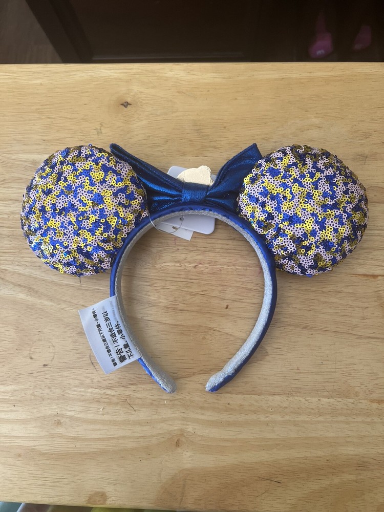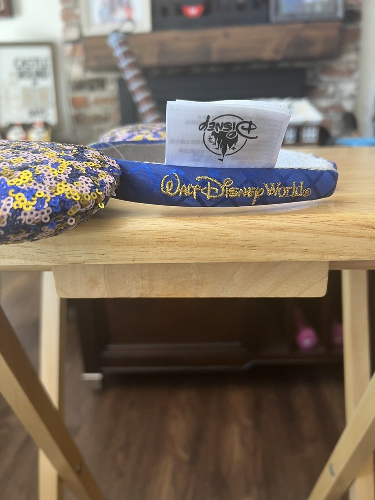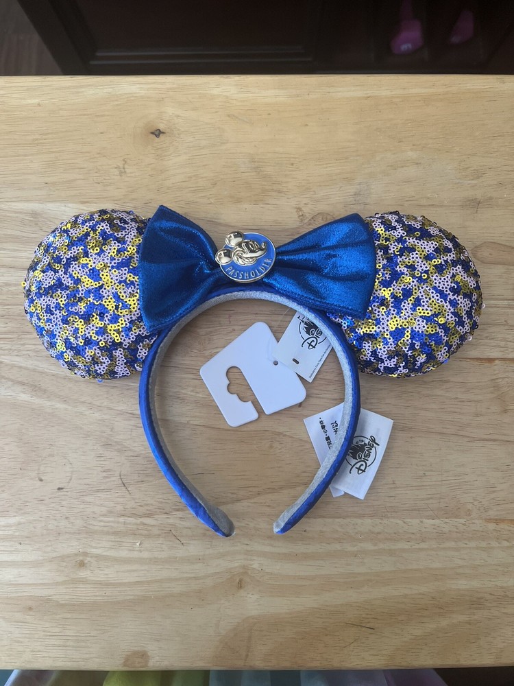 2021 Disney Parks World WDW Annual Passholder Blue Sequined Minnie Mouse Ears. The ears are covered in blue, gold, and pink sequins. The headband is topped with a shimmer bow, held together with a Mickey Mouse Passholder charm. The large charm has Mickey shining in bright gold. “Walt Disney World” is embroidered on one side of the blue headband The headband has a criss-cross royal blue pattern. The inside of the headband is silver. Your item is in hand and will be shipped safely, and with care. I recycle boxes and packing materials. If you have any questions, please feel free to ask prior to purchase. Comes from my smoke free home. Will also ship international via eBay‘s Global Shipping Program. Thank you for looking at my listing and please check out my other listings of collectibles! 😊