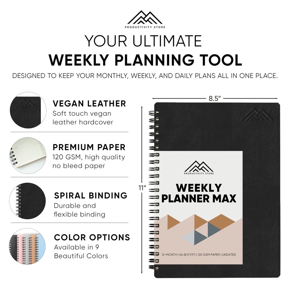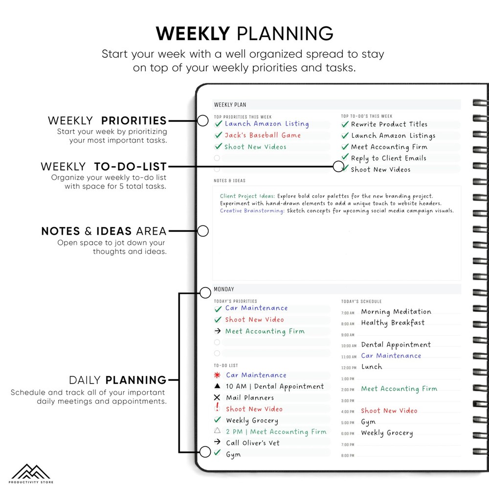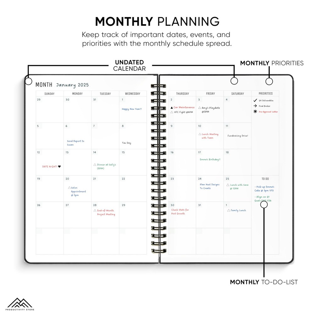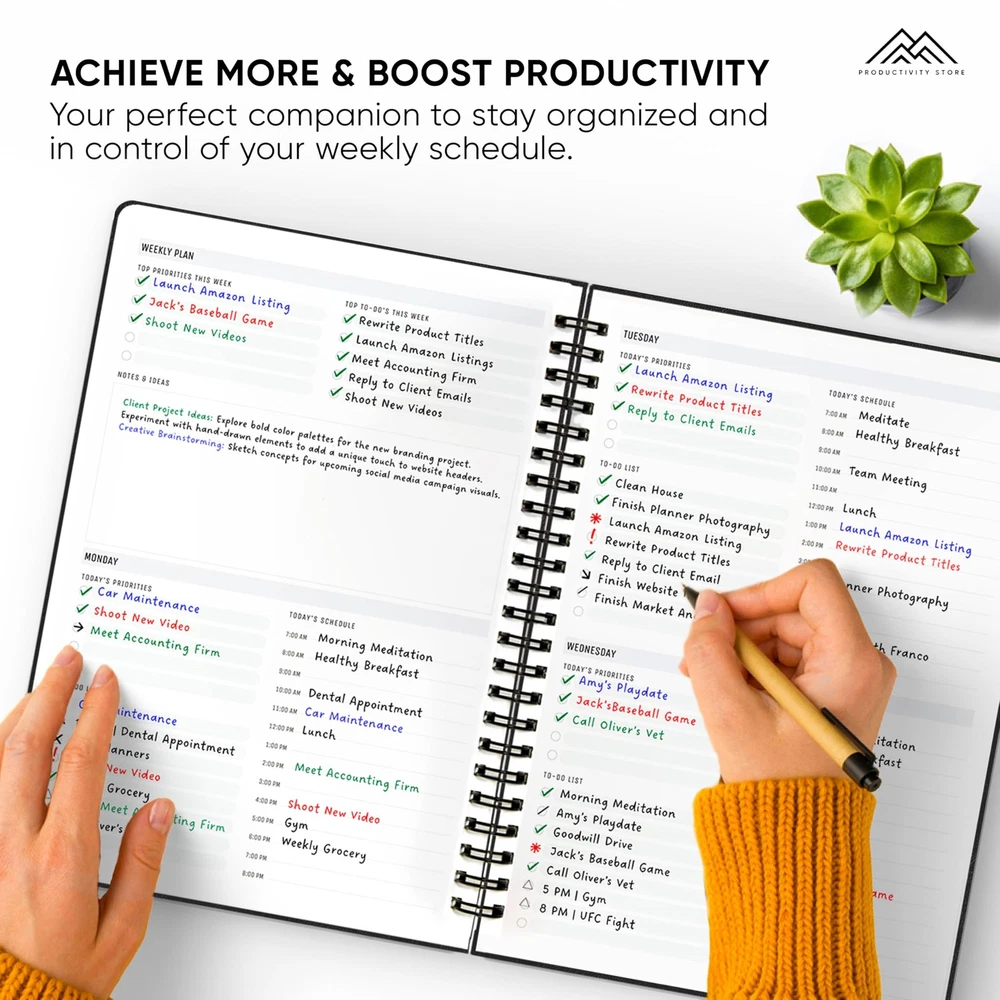 Undated & Versatile: This undated spiral planner is more than just a calendar—it’s your all-in-one daily, weekly, and monthly planner. Designed to enhance productivity, this planner serves as a goal planner, to-do list organizer, and gratitude journal, ensuring you stay on top of your tasks throughout 2025 and beyond. Proven Planning System: We’ve crafted our spiral-bound planner based on successful strategies used by high achievers. Align your long-term goals with daily targets using our unique workflow system. This planner empowers you to manage and accomplish your objectives, making it your ideal partner for growth and success. Plan, Track & Reflect: With dedicated sections for daily tasks, weekly reflections, and a mood tracker, this planner keeps you accountable and motivated. Experience our “Top 3” tasks feature, which prioritizes what matters most each day, ensuring you make the most of every moment. Ample Space for Your Needs: Our planner includes plenty of space for all your planning requirements—appointments, notes, and daily to-do lists. Enjoy 52 weeks and 365 days of thoughtfully designed pages that help you maintain focus and achieve your best results. Bonus Features & Inspirational Touches: Enhance your planning experience with 5 exciting bonuses, including planner stickers, a habit tracker, weekly inspirational quotes, and additional note-taking space. This planner is perfect for everyone—men and women alike. Stylish Design & Quality Materials: Crafted with curated materials and handpicked colors, our brass spiral-bound planner is not only functional but also visually appealing. Its sleek design encourages you to dream bigger and strive for your best. 60-Day Money-Back : At , we stand behind our products. If you’re not completely satisfied, return it within 60 days for a full —no questions asked. Undated & Versatile: This undated spiral planner is more than just a calendar—it’s your all-in-one daily, weekly, and monthly planner. Designed to enhance productivity, this planner serves as a goal planner, to-do list organizer, and gratitude journal, ensuring you stay on top of your tasks throughout 2025 and beyond. Proven Planning System: We’ve crafted our spiral-bound planner based on successful strategies used by high achievers. Align your long-term goals with daily targets using our unique workflow system. This planner empowers you to manage and accomplish your objectives, making it your ideal partner for growth and success. Plan, Track & Reflect: With dedicated sections for daily tasks, weekly reflections, and a mood tracker, this planner keeps you accountable and motivated. Experience our “Top 3” tasks feature, which prioritizes what matters most each day, ensuring you make the most of every moment. Ample Space for Your Needs: Our planner includes plenty of space for all your planning requirements—appointments, notes, and daily to-do lists. Enjoy 52 weeks and 365 days of thoughtfully designed pages that help you maintain focus and achieve your best results. Stylish Design & Quality Materials: Crafted with curated materials and handpicked colors, our brass spiral-bound planner is not only functional but also visually appealing. Its sleek design encourages you to dream bigger and strive for your best. 60-Day Money-Back : At , we stand behind our products. If you’re not completely satisfied, just let us know, we will make it right!