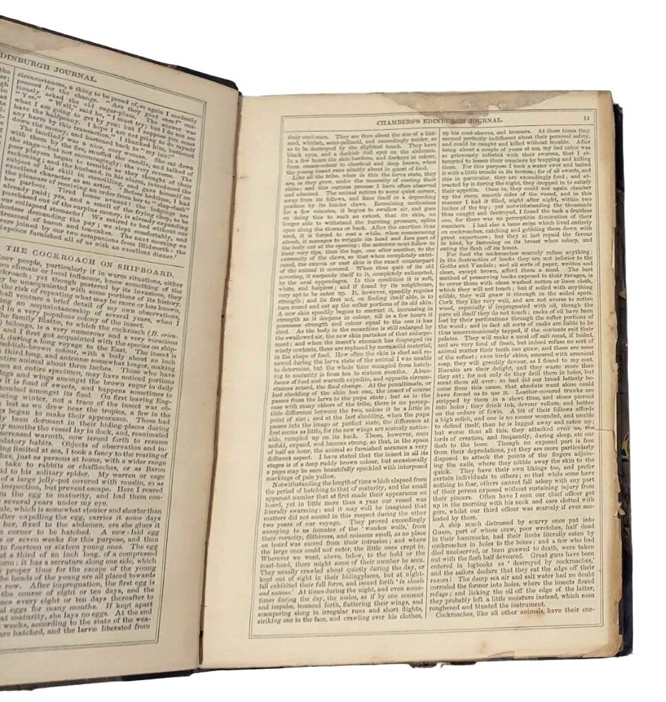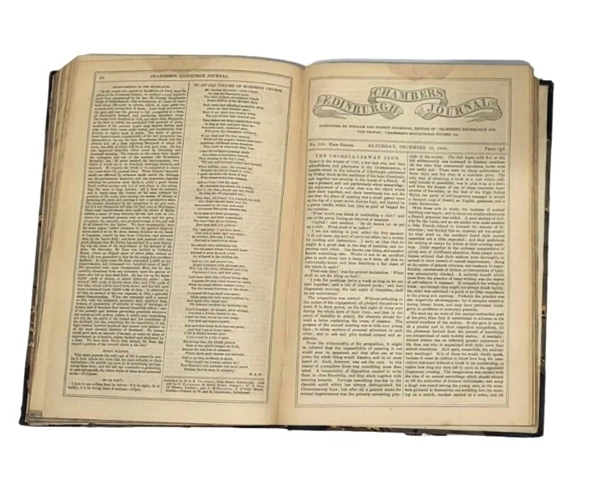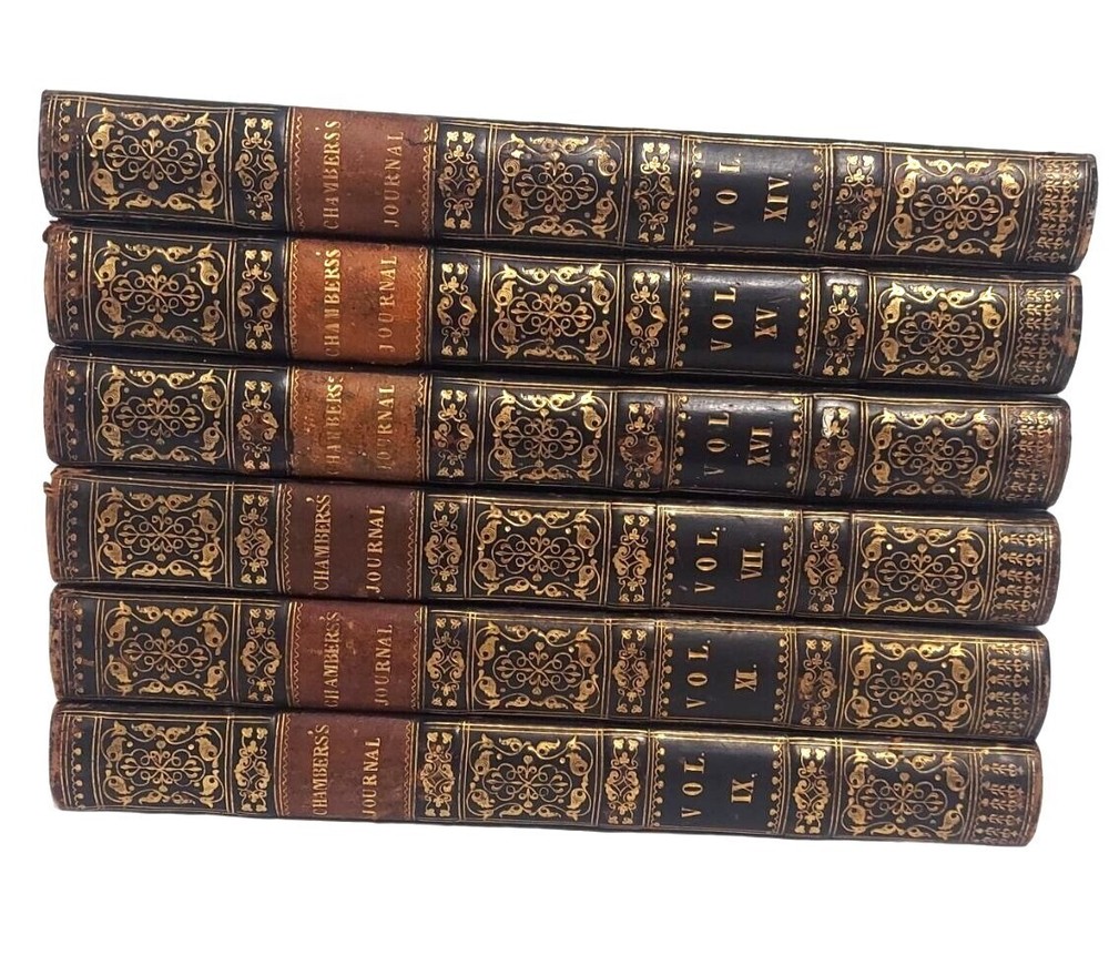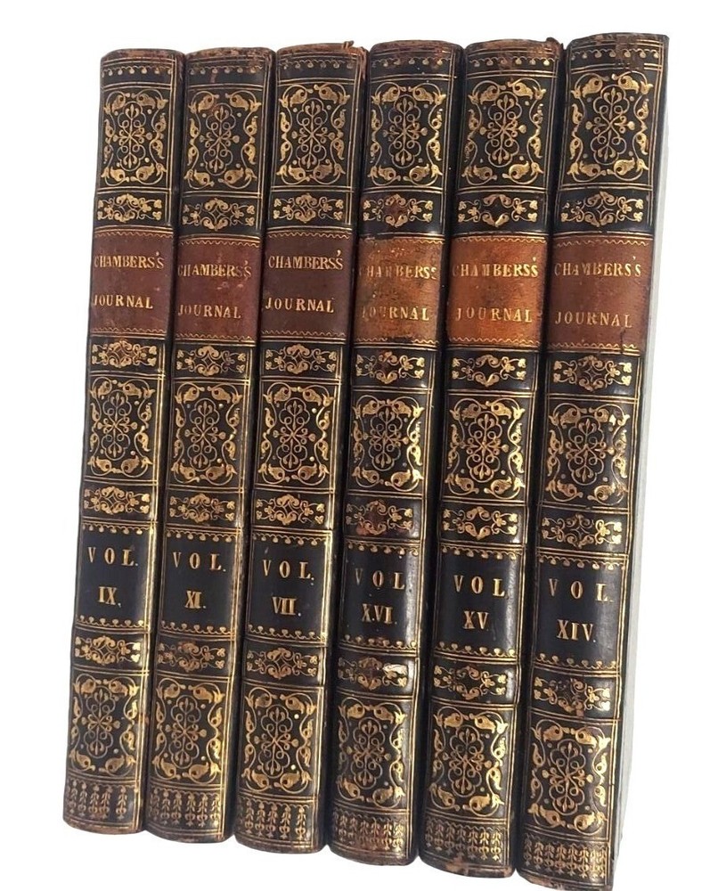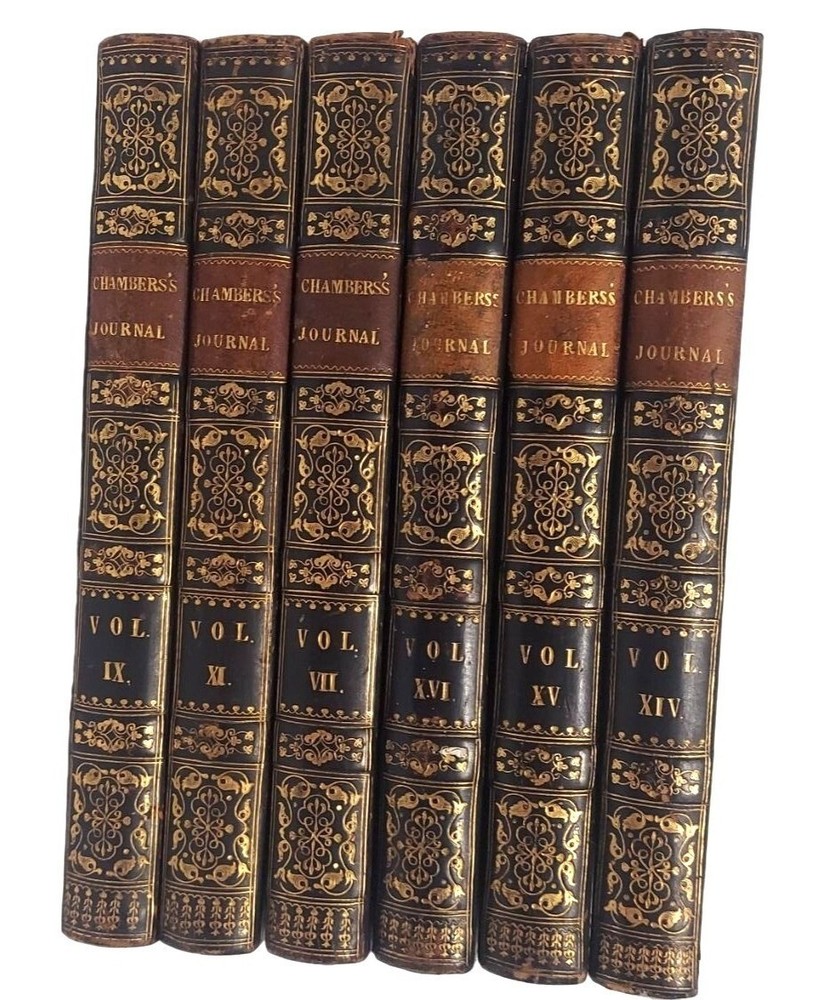 6 bound volume of Chamber's Edinburgh Journal Conducted by William and Robert Chambers Volume VII (Jan. to June 1847) Volume IX (Jan. to June 1848) Volume X (July to Dec. 1848) (spine is marked Vol. XI - title page is marked Vol. X) Volume XIV (July to Dec. 1850) Volume XV (Jan. to June 1851) Volume XVI ( July to Dec. 1851) Each weekly volume is full of essays, short stories / tales, scientific/historical articles, poetry, and anecdotes. Hardcover with leather spine and corners. Decorative covers. Plain paper end pages. Gilt accents. Decorative patterns on the edges of the closed page block. This is one of several books we are currently listing in this or a similar type of binding. Would be stunning grouped together in an office or library. Each hardcover is over 400 pages. Each is printed in London. A few of the stories and articles included in these volumes include: Cancer Said to be Cured by Mesmerism To an Old Volume of Robinson Crusoe (poem) The Cretan Daughter The Two Homes: A Story for Wives The Death Warning: A Legend of Saco Island Hint to Temperance Societies Police Statistics of Manchester The Lentil in Scotland The Sheep - Farmer in Australia Ridicule as a Weapon Tales of the Coast Guard Condition: Good condition. Antique volumes. Covers have rubbing and wear to the decorative boards. Age toning to the pages. Pages are not brittle but they need to be handled with caution - they are printed on a paper closer to newsprint than other books I have listed. Corner tips and spine ends have wear and the boards are exposed in places. A few pages have creased corners. Volume X/XI has a loose page that is laid into place (page 15-16) and this page has a tear in the edge along with some chips on the edges. Page 245-6 of volume VII has a short tear in the gutter with a long crease across the page. Pages 135-7 of Vol. XIV have short tears with creasing. Otherwise tight binding. Please view all photographs and consider them as part of the description.