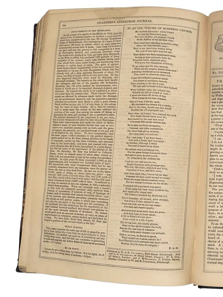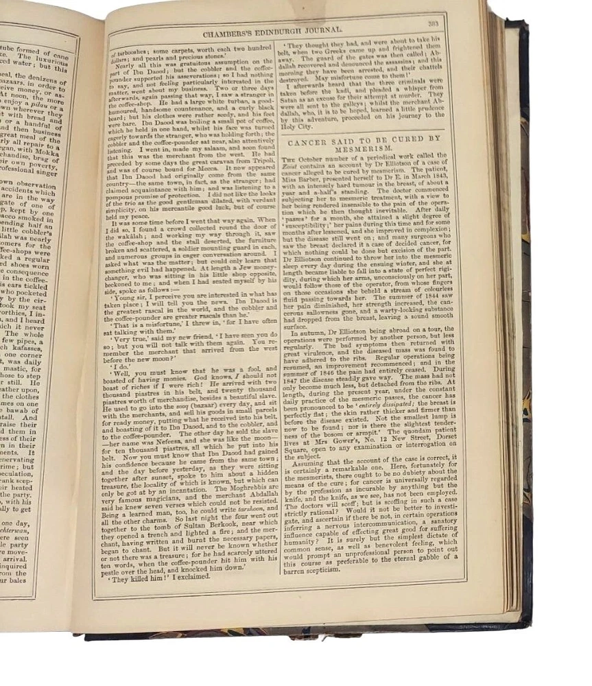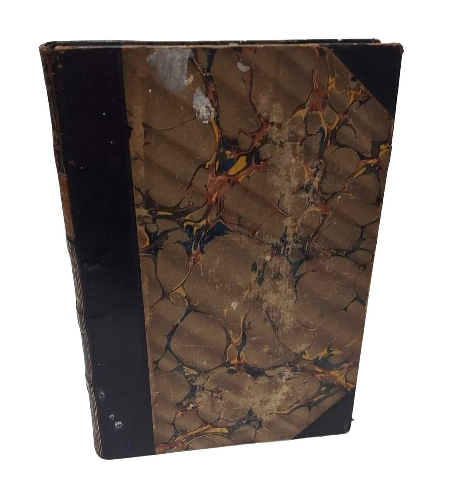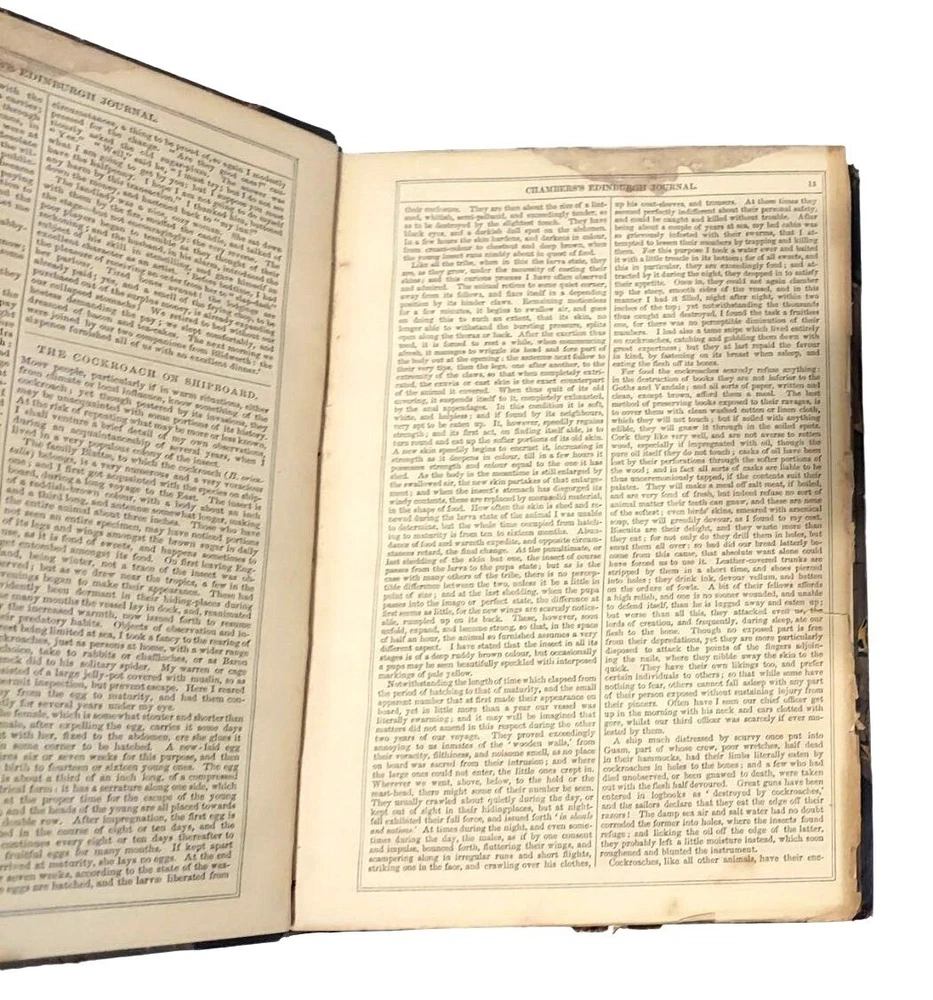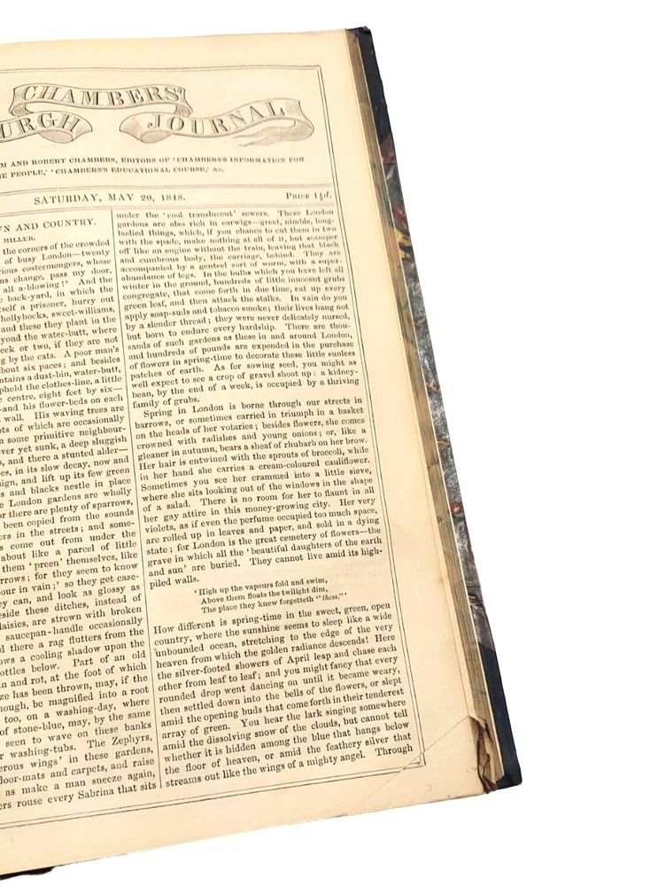 6 bound volume of Chamber's Edinburgh Journal Conducted by William and Robert Chambers Volume VII (Jan. to June 1847) Volume IX (Jan. to June 1848) Volume X (July to Dec. 1848) (spine is marked Vol. XI - title page is marked Vol. X) Volume XIV (July to Dec. 1850) Volume XV (Jan. to June 1851) Volume XVI ( July to Dec. 1851) Each weekly volume is full of essays, short stories / tales, scientific/historical articles, poetry, and anecdotes. Hardcover with leather spine and corners. Decorative covers. Plain paper end pages. Gilt accents. Decorative patterns on the edges of the closed page block. This is one of several books we are currently listing in this or a similar type of binding. Would be stunning grouped together in an office or library. Each hardcover is over 400 pages. Each is printed in London. A few of the stories and articles included in these volumes include: Cancer Said to be Cured by Mesmerism To an Old Volume of Robinson Crusoe (poem) The Cretan Daughter The Two Homes: A Story for Wives The Death Warning: A Legend of Saco Island Hint to Temperance Societies Police Statistics of Manchester The Lentil in Scotland The Sheep - Farmer in Australia Ridicule as a Weapon Tales of the Coast Guard Condition: Good condition. Antique volumes. Covers have rubbing and wear to the decorative boards. Age toning to the pages. Pages are not brittle but they need to be handled with caution - they are printed on a paper closer to newsprint than other books I have listed. Corner tips and spine ends have wear and the boards are exposed in places. A few pages have creased corners. Volume X/XI has a loose page that is laid into place (page 15-16) and this page has a tear in the edge along with some chips on the edges. Page 245-6 of volume VII has a short tear in the gutter with a long crease across the page. Pages 135-7 of Vol. XIV have short tears with creasing. Otherwise tight binding. Please view all photographs and consider them as part of the description.