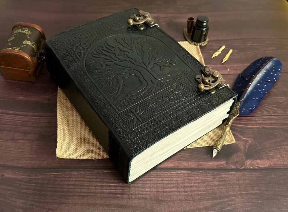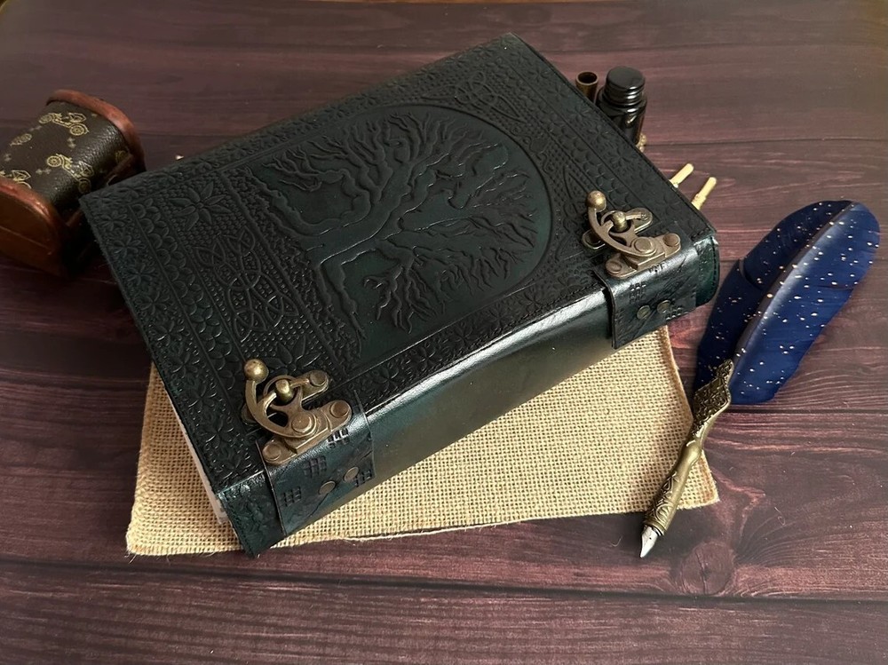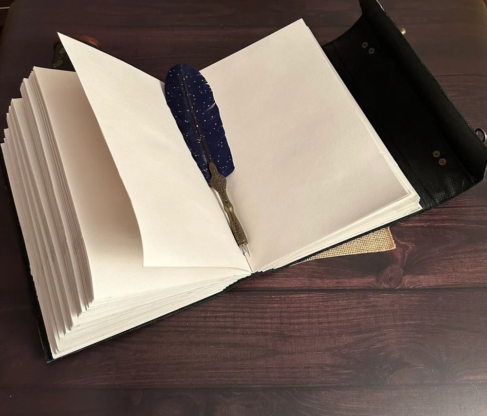 This handcrafted leather journal is a beautifully designed piece, perfect for capturing your thoughts, plans, and ideas. Here are the detailed features: Dimensions and Build Dimensions: 4 (H) x 10 (L) x 7 (W) inches Pages: 600 pages on both sides Leather: Soft, supple, and pliable genuine leather with a natural leather scent Tanning: Naturally tanned with special oil, providing a unique and luxurious feel Paper and Usability Ideal Size: Large 10 X 7 inches, large enough for creative expression Paper Quality: Smooth craft paper that allows the pen to glide effortlessly across the page Recycled Cotton Pages: Perfect for mini notes, with a total of 600 pages to fill Design and Security Locks: Two vintage-style bronze C locks to keep your notebook safe and organized Design: Exquisitely crafted, making it an ideal gift for book lovers or those who appreciate literature This handcrafted leather diary is a perfect blend of functionality and artistry, making it a treasured keepsake for anyone who loves to pen their thoughts, sketch, or keep detailed notes.