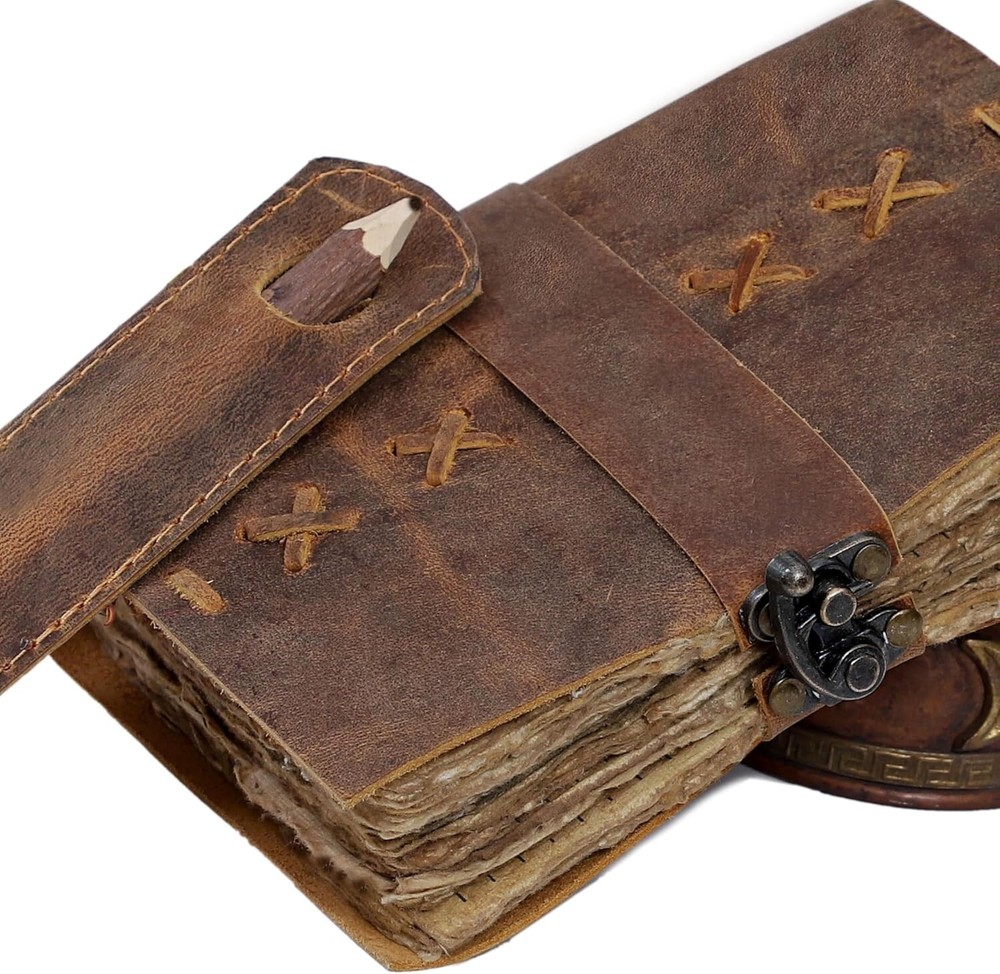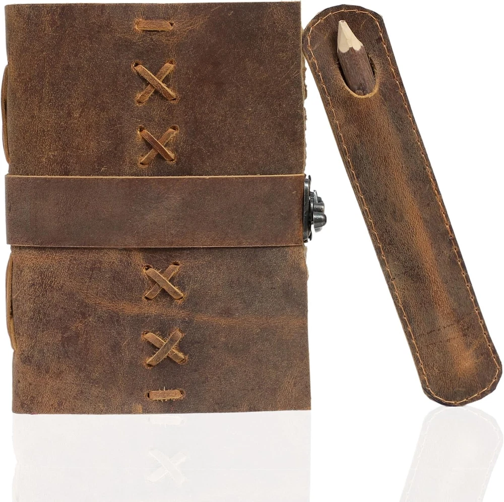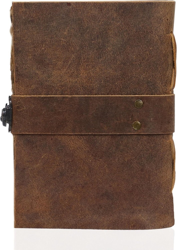 SIZE : 6" (L)x 4" (W) VINTAGE LEATHER JOURNAL: A Perfect Journal for Women and Men by Vintage Couture. This Vintage Journal is Made from Genuine Buffalo Leather which is naturally tanned with oils and is chrome free. As these Daily Journals are made with genuine Cruelty free leather so each vary in look and shade producing a unique item. JOURNAL NOTEBOOKS WITH STURDY BINDING: Belt Wrap around closure with Antique Bras lock to keep the papers of the journal safe when not being used. A sturdy hand stitched binding to make sure that no paper comes out loose. WATERCOLOR PAPER: This leather Sketchbook comes with handmade deckle edges paper which is made from recycled cotton waste these old Paper are No Bleed Scrapbook Paper. The Mixed Media Sketchbook is Suitable for Writing, Watercolor, Acrylic Colors, Pastel Color and all Dry & Wet Mediums. Use it like Sketch Pad, Watercolor Sketchbook etc. PERFECT GIFT: This vintage-inspired journal serves as an exquisite and timeless gift suitable for a diverse range of recipients, including women, men, teen girls, boys, and cherished grandparents. A lovely treat for your loved ones for an anniversary, birthday or graduation present, or for someone starting a new adventure