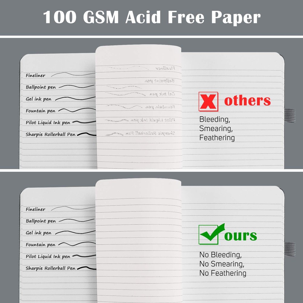 GREAT CLASSIC HARDCOVER RULED NOTEBOOK: Professional black durable faux leather notebook journals. The leather feels soft and smooth, will protect your journal to last for years, the pages are thick and cut evenly, minimal ghosting / bleeding. Easy to lay out flat for comfortable writing and reading. Navy navy navy deep blue deepblue deep blue deep blue deep blue Faux Leather Hardback Journal: Premium vegan leather makes durable and sturdy covers to keep your journal safe for years and create comfortable touch in hands. 7 Classic colors leather bound journal for options, perfect for school, office, home and travel. Fountain Pen Paper: No Bleeding through for most ink pen is our paper's rigorous standard. After hundreds of test, we apply upgraded 100 GSM off-white Acid Free Paper, which helps write smoothly without ghosting, smearing and avoid eyes tiredness. Numbered Pages Notebook: 156 Pages (78 Sheets), End to end lined pages come with Table of Contents, page numbers, and 2 different colored ribbon bookmarks to help you organize content and easily find it out. 2 Stickers for the spine and cover of notebook to archive. Handy All-in-one Journal: Medium notebook, 5.3" x 8.4", suitable in bag and handy in hand; 1 Solid expandable back pocket and 1 front pocket for loose leaf paper, bills, receipts; 1 Elastic pen loop for various szies’ pens; 1 Elastic band to keep notebook closed. BRAND GUARANTEED: is committed to offering a high quality journal for you to have a excellent writing experience. Pack of 7 deep blue journal, Perfect gift for you and your families, friends and colleagues. Please email us if there is any problem or question to 100% satisfactory solved.