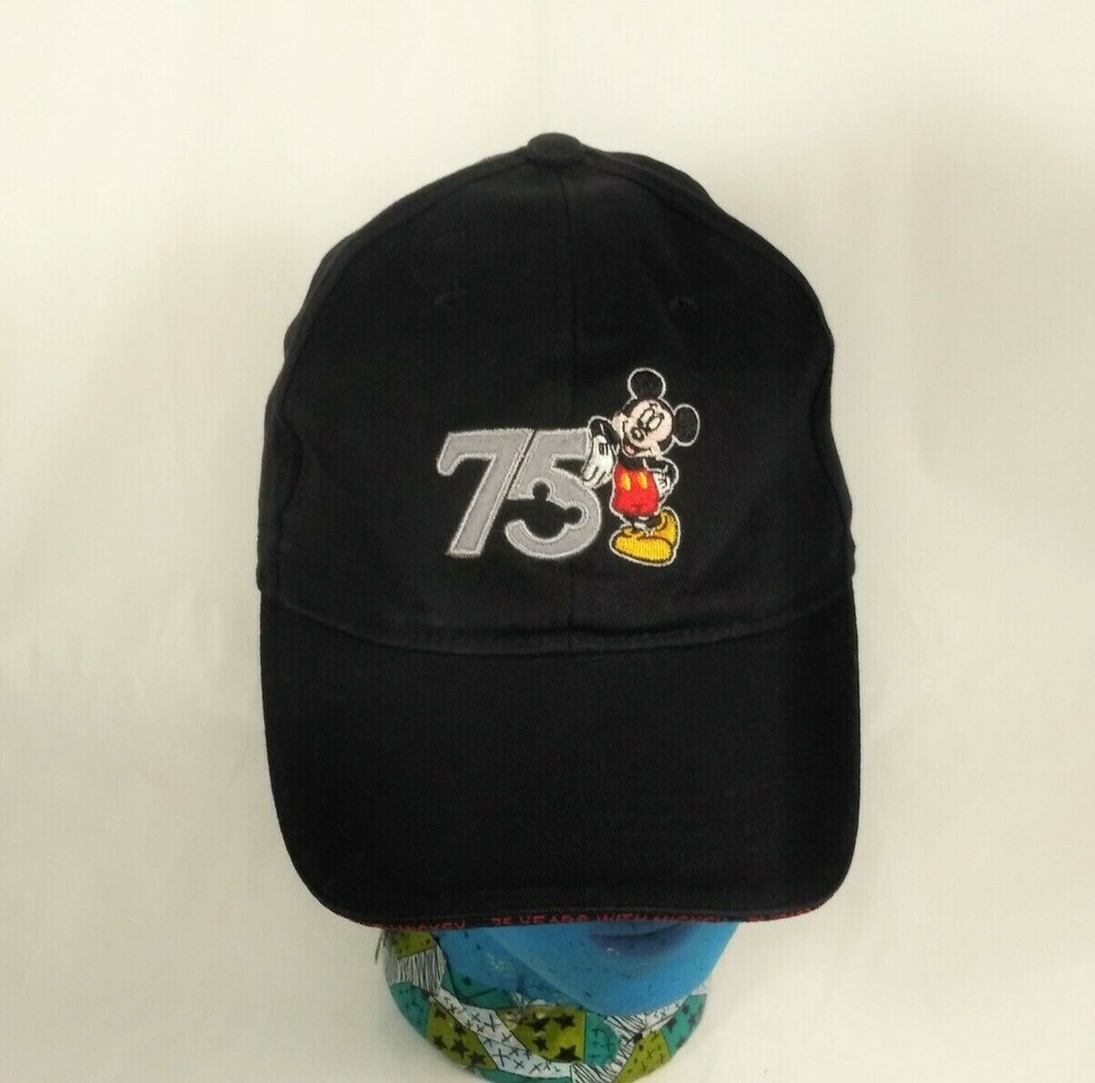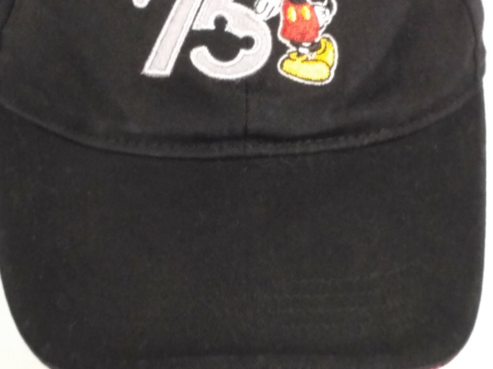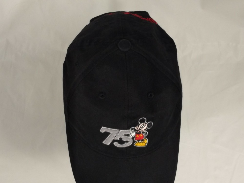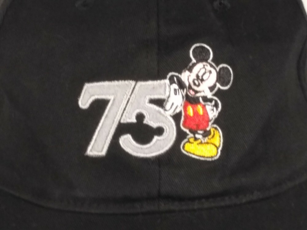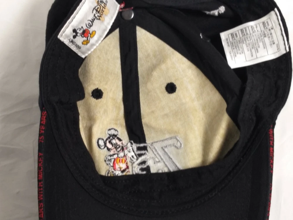 Item: 75 Mickey Walt Disney World Black Hat Size Adult Condition: There is some overall wear to the hat from use.The inside part is yellowed. Markings/Measurements: The size is Adult and the tag says Walt Disney World. Please look at pictures for more details about the item. M ost of what I sale is used and I do not know what type of house it came out of (smoking, etc). If you have any questions please message me. If you run into any problems with transaction/item I am happy to try to resolve a problem . Thanks, Amelia