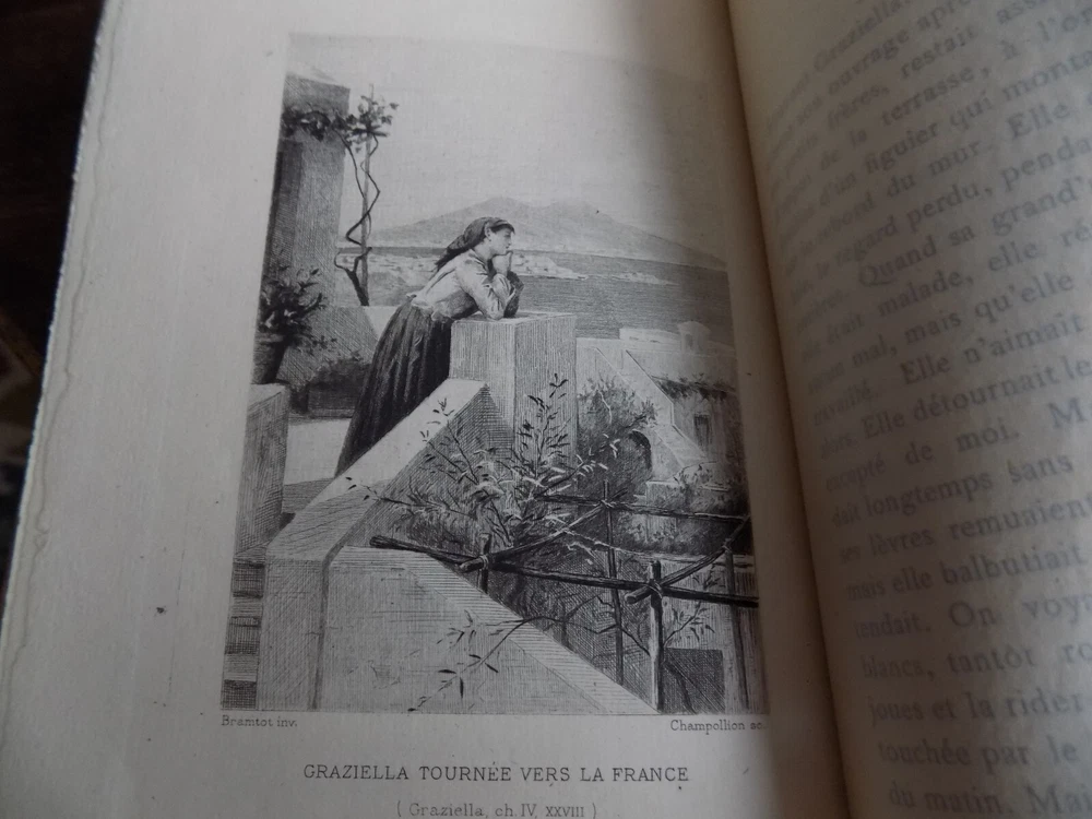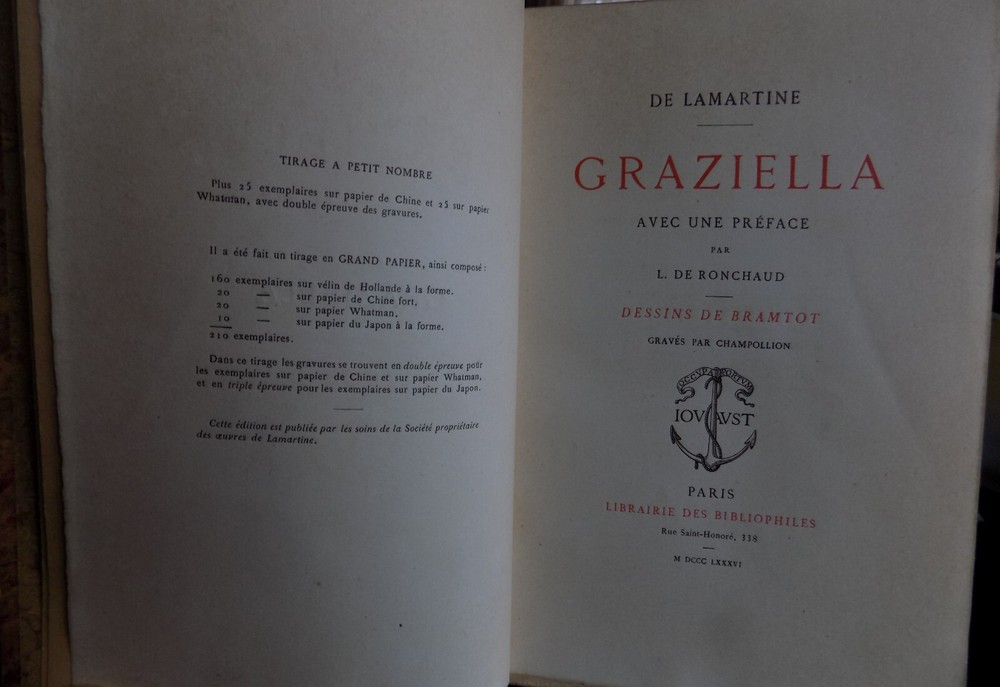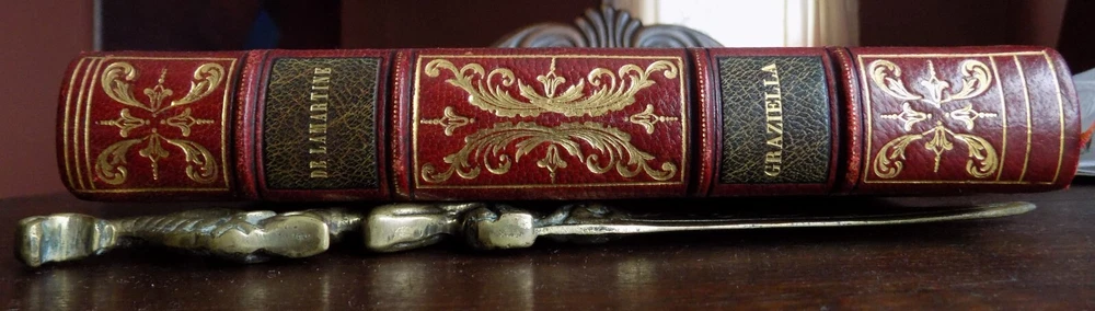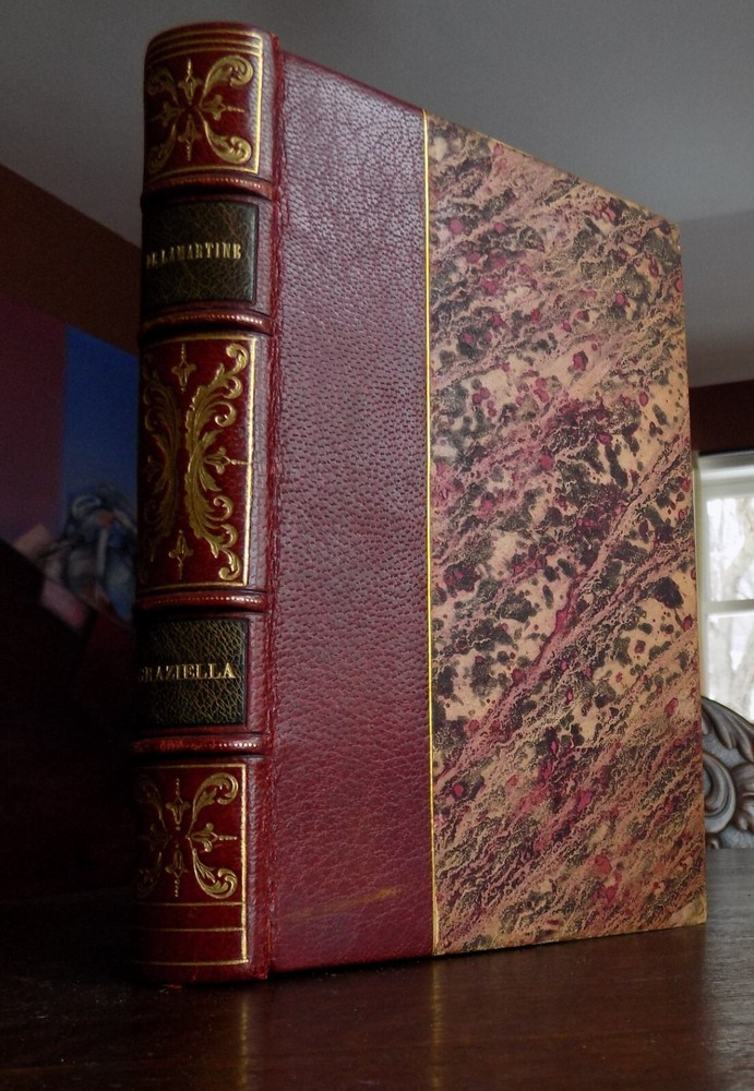 Graziella, A de Lamartine, Librairie des Bibliophiles, 1886, leather condition: excellent; binding by R. and R. Mativet . French text. A lovely copy of this famous novel. 'Graziella' tells the tale of a young French man who falls for a fisherman's granddaughter, Graziella. They are separated when the man has to leave Naples and return to France. The girl soon dies. The novel is based on Lamartine's experiences with a tobacco-leaf folder in Naples. It was first written as a journal and intended to be a commentary for his poem 'Le Premier Regret'. In the original French. Alphonse de Lamartine was a French writer, poet and politician. He was important in the foundation of the Second Republic of France and the continuation of the Tricolore flag. In a quarter morocco binding with marbled paper boards. Externally, excellent . Internally, firmly bound.