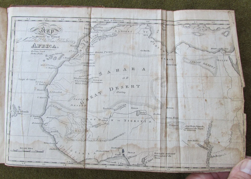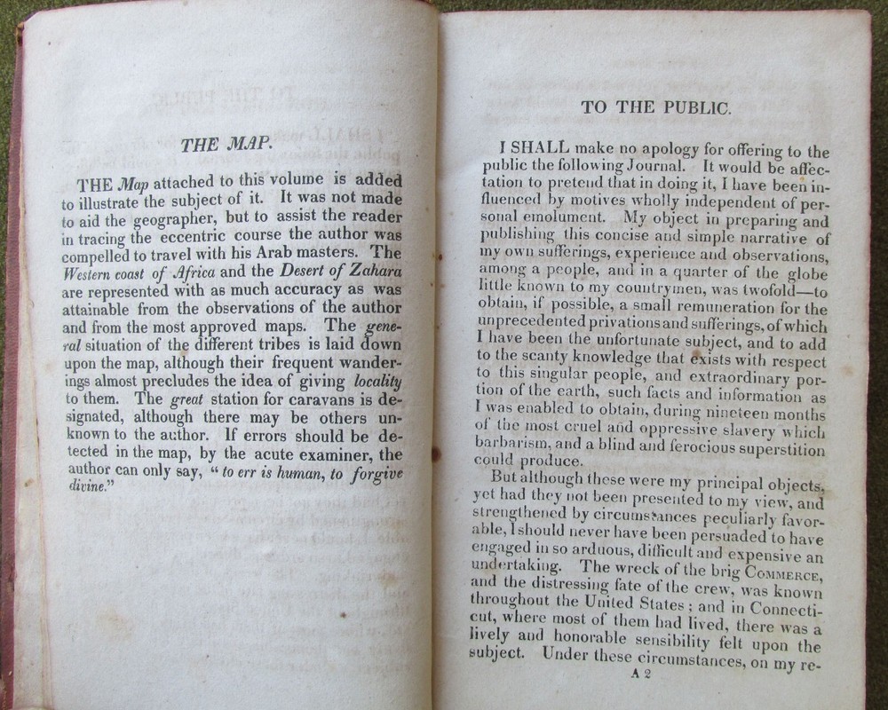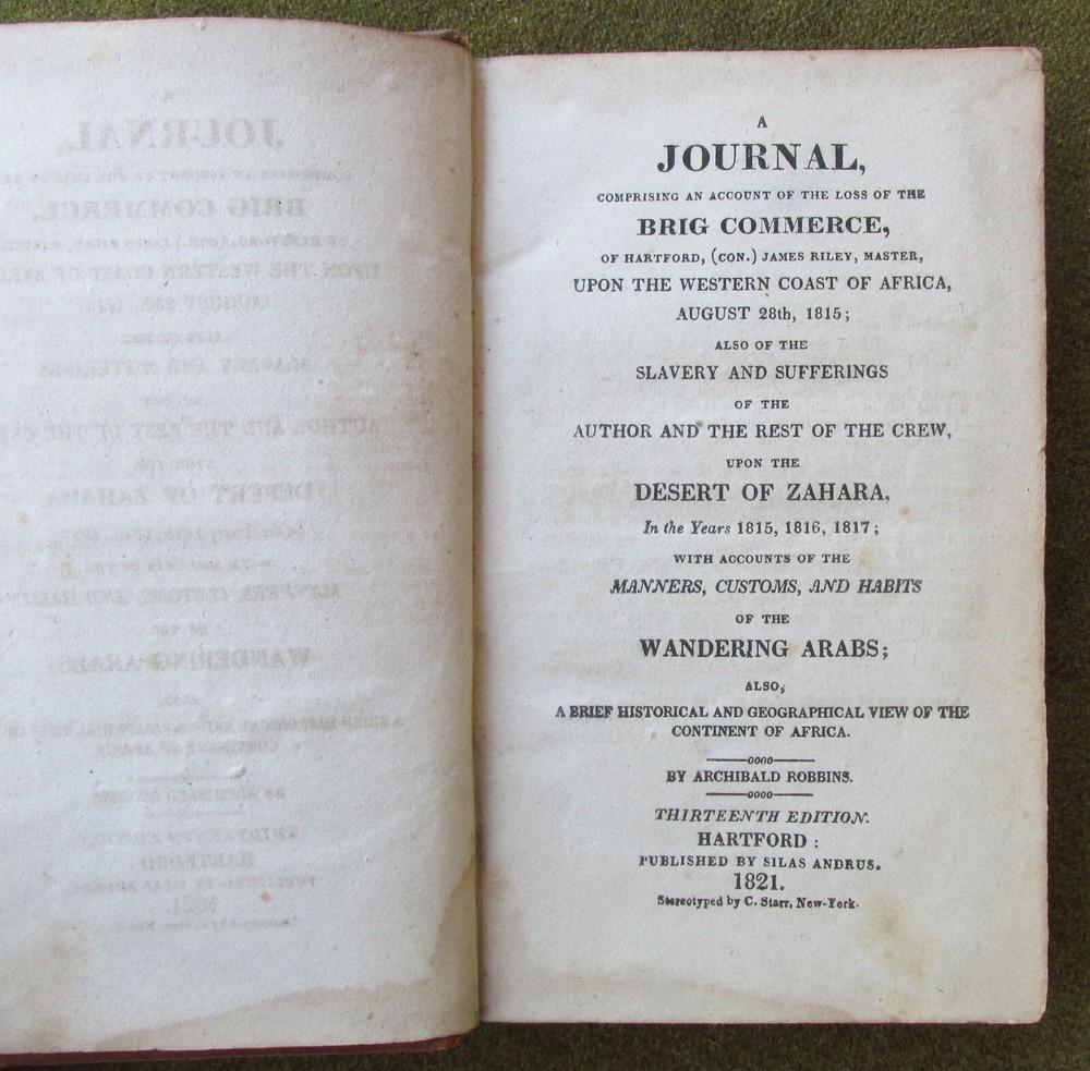 Leather bound, 275 pages in good condition, A JOURNAL COMPRISING AN ACCOUNT OF THE LOSS OF THE BRIG COMMERCE, OF HARTFORD, (CON.) JAMES RILEY, MASTER, UPON THE WESTERN COAST OF AFRICA, AUGUST 28TH, 1815; ALSO OF THE SUFFERINGS OF THE AUTHOR AND THE REST OF THE CREW, UPON THE DESERT OF ZAHARA, IN THE YEARS 1815, 1816, 1817; WITH ACCOUNTS OF THE WANDERING ARABS; ALSO A BRIEF HISTORICAL AND GEOGRAPHICAL VIEW OF THE CONTINENT OF AFRICA. By Archibald Robbins, 13th Edition, Hartford: Published by Silas Andrus. 1821. Map of Africa inside rear cover, minor folds and light stains. Buyer adds $12.00 Priority Mail.