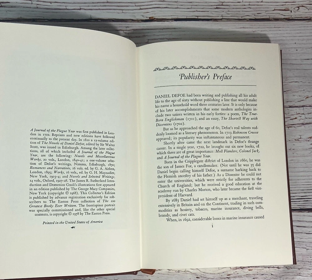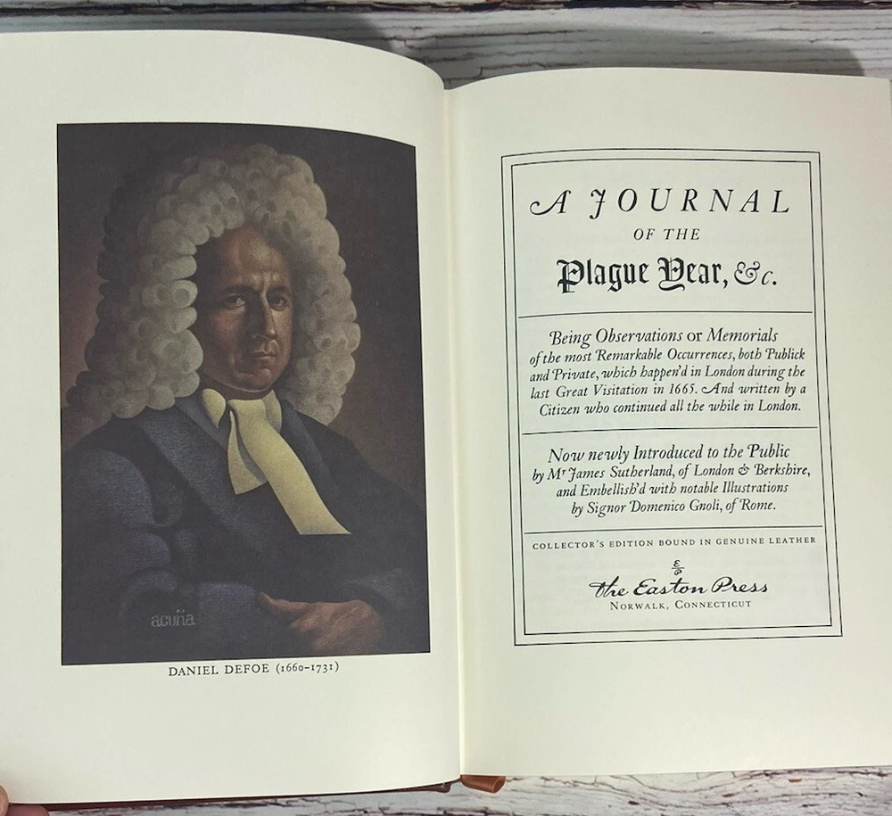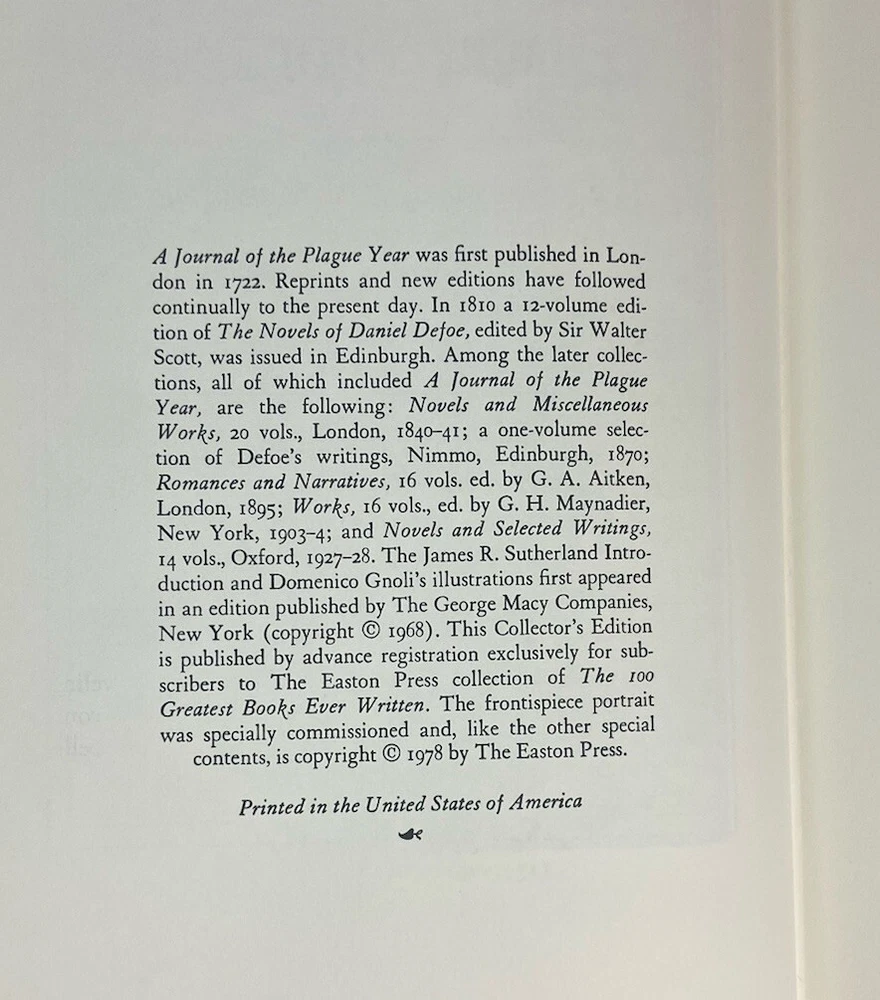 A Journal of The Plague Year 1665 Daniel Dafoe Easton Press Leather Bound 1978 In very nice condition Binding is still very good. Pages are clean and clear. Ribbon bookmark looks unused. COLLECTOR'S EDITION BOUND IN GENUINE LEATHER The Easton Press NORWALK, CONNECTICUT Please see all pictures. Please contact me with any questions. Thank you!