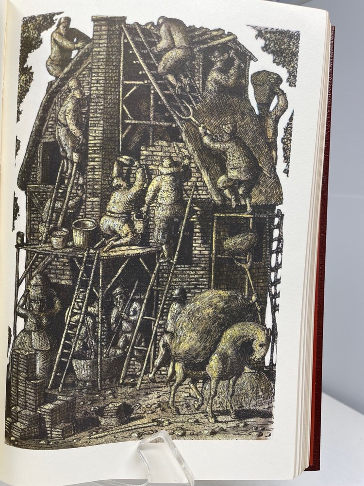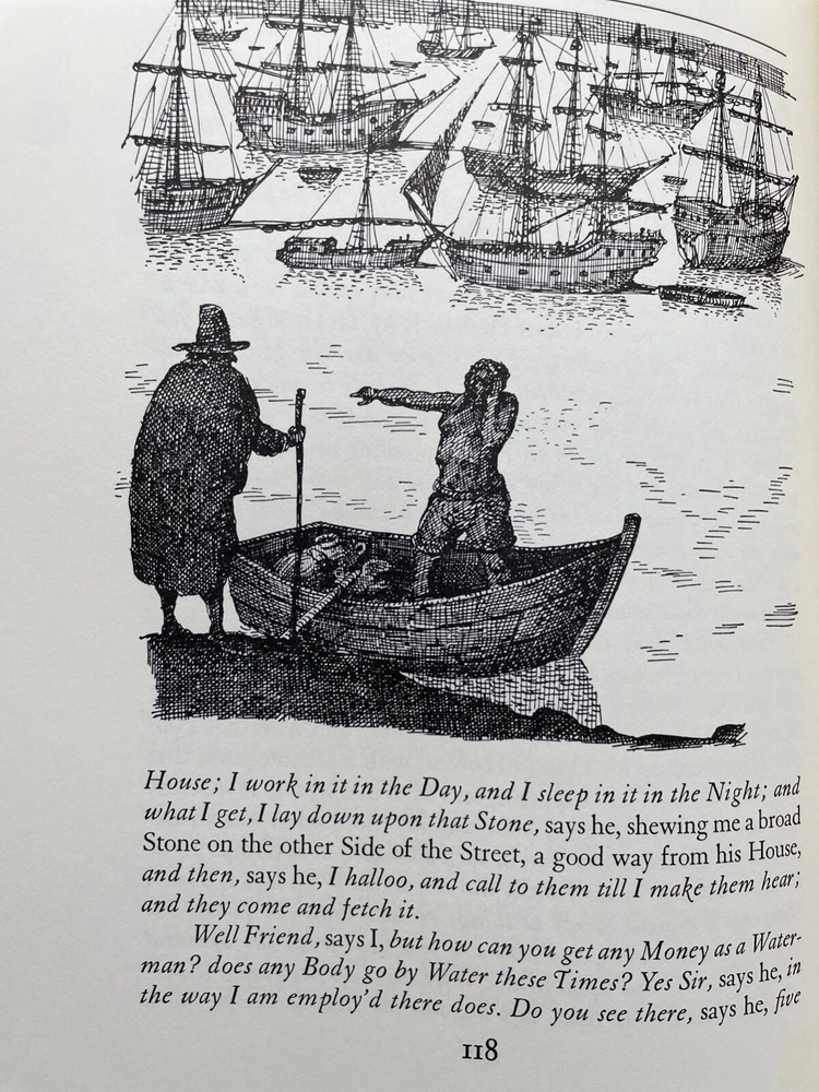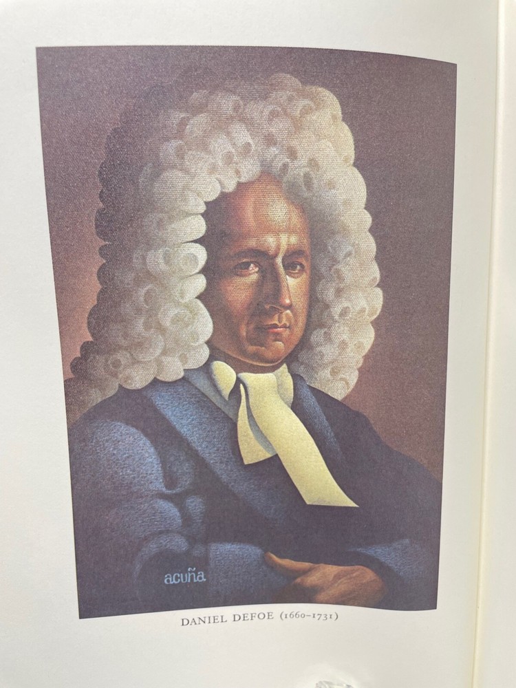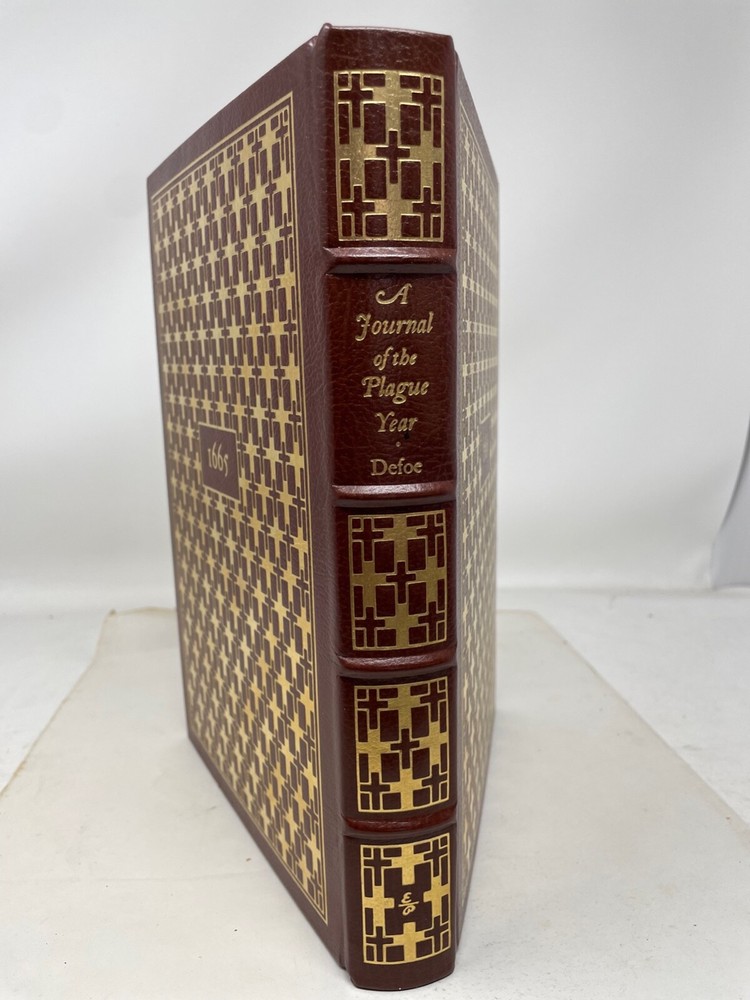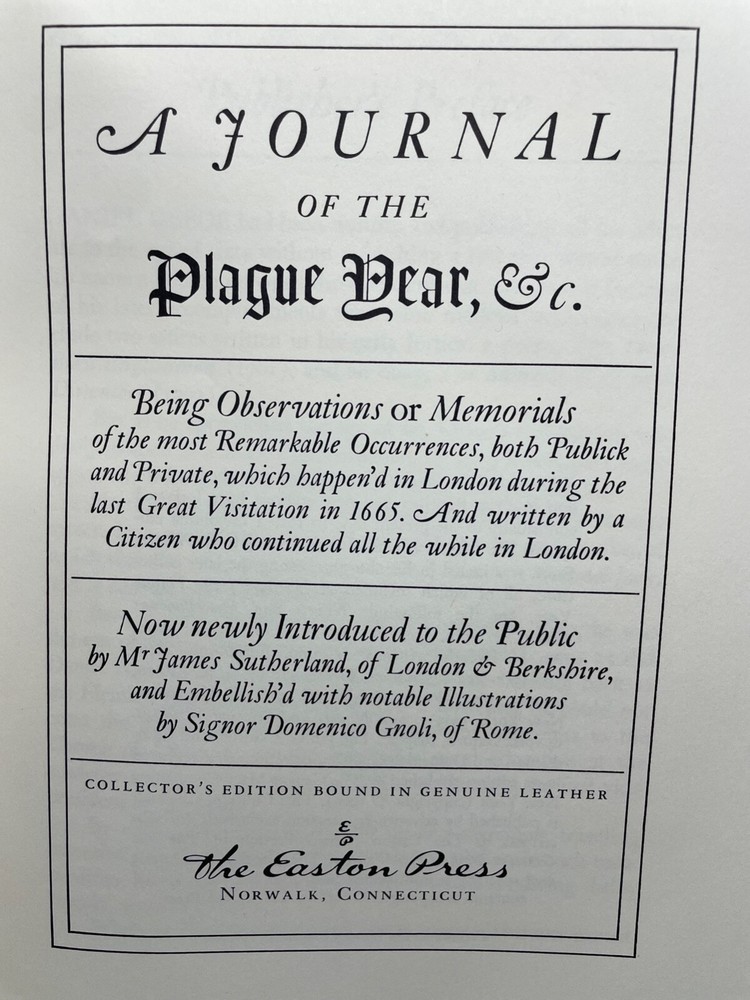 Daniel Defoe’s (1660-1731), “A Journal of the Plague Year," has been wrongly described as merely a “historical look at the bubonic plague that ravaged London in 1665.” In fact, Defoe’s nonfiction novel predates Truman Capote’s pioneering literary work, “In Cold Blood,” by nearly 250 years. In a 1966 interview with George Plimpton, Capote said “It seemed to me that journalism reportage, could be forced to yield a serious new art form: the ‘nonfiction novel.’” Traditionally it was said that “journalism is only literary photography, and unbecoming to the serous writer’s artistic dignity.” He went on to say that “the reporter must be able to empathize with personalities outside his usual imaginative range, mentalities unlike his own.” It has been suggested that Defoe closely identified himself with H.F., the narrator of this story (suggesting the author's uncle Henry Foe as its primary source), and so introduced an autobiographical element that is absent from Capote’s work. Although Defoe closely studied historical material, this work, written in 1722, three years after the publication of “Robinson Caruso,” is clearly fiction - and compelling fiction at that. Defoe’s episode of the three poor men, the Biscuit-Baker, the Sail-Maker and the Joiner, trying to escape - “the Plague grows hot in the City and encreases (sic) this way,” “who wandered from Wapping [i.e. East London on the Thames], not knowing whether to go, or what to do,” is a masterpiece of his imagination. While this Eaton Press special collector’s edition of Defoe’s celebrated book is known for the excellence of its binding and of its tooled and its 22 karat gold gilded leather covers, it is also distinguished by the quality of its art. The Eaton Press was formed in 1975 when it purchased the Heritage Press and Publishing Company, which owned the rights to republish the catalogue of the Limited Editions Club (LEC). George Macy (1900-1956) founded the LEC in 1929 to publish very high quality, hand-bound, leather covered books in limited numbers (usually 1500 copies) for subscription members which contained specially commissioned art works from the world’s leading artists. In 1935 Macy started Heritage Press to publish the same LED contents but in unlimited and less expensive editions. In 1968 LED published Defoe’s, “A Journal of the Plague Year,” with 8 full color plates and numerous black and white in-text drawings done by a young vibrant Italian artist, Domencio Gnoli (1933-70). Born in 1933 in Rome to an artistic family, Gnoli early exhibited his talent for drawing, and he later studied stage design at the Accademia di Belle Arti. He moved to New York City where critics commented on his surrealistic imagery and his monochromatic palette (mulberry, olive and purple). A reviewer said that “Gnoli‘s deceptively prosaic subject matter belies his wholly original virtuosity, which is heightened by astounding angles and poetic perspective.” An examination of Gnoli’s work in this volume certainly confirms this judgment. In 1978 Eaton released this deluxe edition of Defoe’s work, complete with Gnoli’s original art work, complemented with a marvelous new frontispiece portrait of the author by American artist, Ed Acuna. This book is beautiful to look at, beautiful to touch and engrossing to read - Truman Capote would highly approve of this 18th century nonfiction novel.