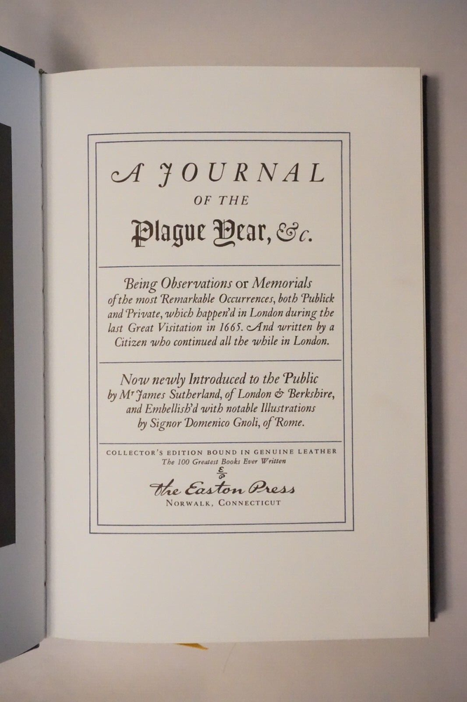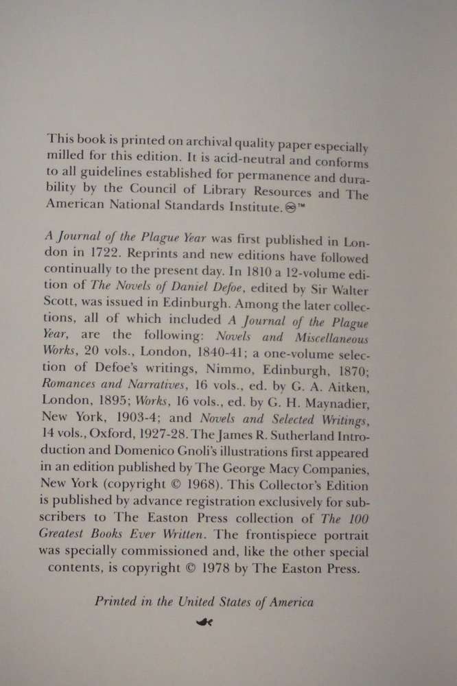 Wonderful vintage copy of A Journal of the Plague Year by Danial Defoe. Published in 1978 by Easton Press of Norwalk, Connecticut. The leatherbound book is in very good condition for its age, with minimal wear to the cover and edges. Great find at a great price! Please note the S&H charges, which include USPS postage, materials, and handling. Pictured bookends are not included in the sale. View our other eBay listings at Weiss Lane Books! https://www.ebay.com/str/Weiss-Lane-Books
