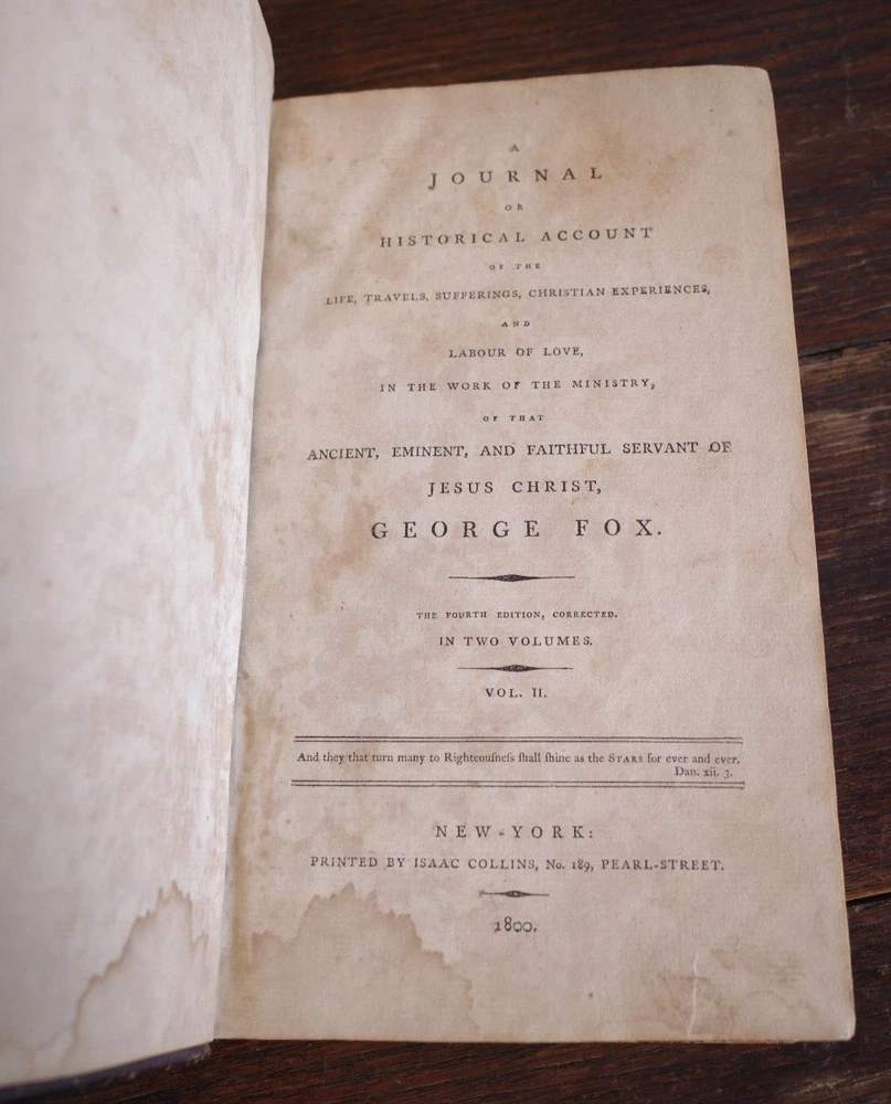 Good condition but with much general wear and heavy foxing. Good condition considering it is 224 years old. 464 pages plus an index. Full title reads, A Journal or Historical Account of the Life, Travels, Sufferings, Christian Experiences, and Labour of Love, in the Work of the Ministry, of that Ancient, Eminent, and Faithful Servant of Jesus Christ, George Fox. This appears to be volume 2 of a 2 volume edition.