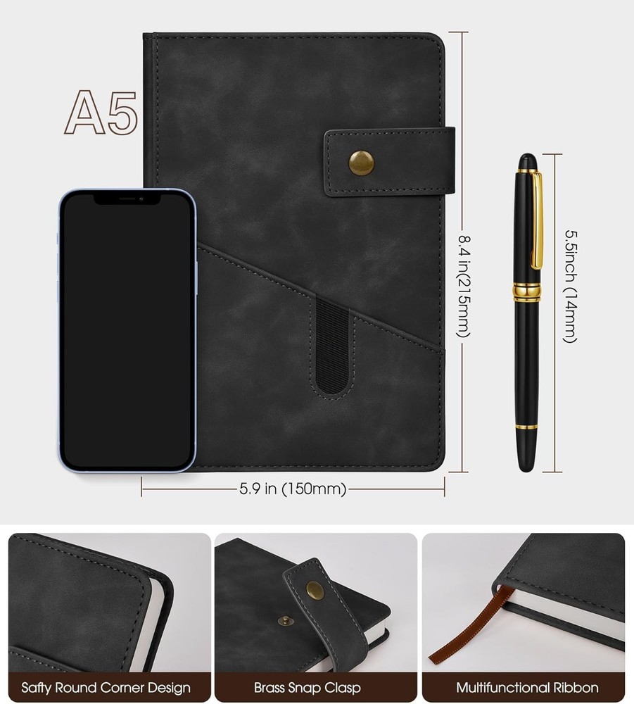 A5 Lined Leather Journal Notebook,Hardcover A5, Black with Gift Box Product Details Manufacturer: vfaejll Brand: vfaejll Item Weight: 3.53 ounces Product Dimensions: 8.4 x 5.9 x 0.78 inches Item model number: vfaejll155881 Color: Black with Gift Box Cover Material: Leather Number of Items: 1 Size: A5 Ruling: Ruled Sheet Size: A5 Manufacturer Part Number: vfaejll155881 Brand: vfaejll Color: Black with Gift Box Theme: Book Sheet Size: A5 Pages: 200 Pages Cover Material: Leather Style: Lined Journal Notebook Ruling Type: Ruled Special Feature: Hard Cover Product Dimensions: 8.2"L x 5.7"W x 0.78"Th ★【Value of Money Hardcover Journal Set】- Classic black ruled notebook, journals are elegant, quality crafted books available at a surprisingly competive price and quality. A huge choice for everyday use, provides plenty of space for notes, lists, musings, and more. And each notebook will give away a luxury metal pen、exquisite gift box packaging and bags,This is one of our best journal gifts. ★ 【Premium Thick Paper】- 5.9 X 8.4 inch journal notebook with 200 pages 100 gsm lined paper, thicker 30% than normal, this black notebook is designed to avoid feathering and the paper is ink-proof, suit for most pens, but the wettest pen inks. Archival-quality pages made from acid-free paper-resists damage from light and air, the cream paper is easy on eyes.Let your creation more freedom on the wide ruled journal to write in. ★ 【Soft Faux Leather Journal Notebook】- This elegant journal notebook has suede hardcover but feel soft in hand, just like a baby's skin. Fashion but reliable cover adapts to the movements of body without damage. The notebook's hard cover protects the pages inside and doubles as a convenient writing surface. Great gift for any. ★ 【Gusseted Design】- Gusseted pocket design and cardboard bound cover,metal buckle helps keep notebook securely closed, making it easy to write in the notebook from just about anywhere. This notebook provide you a high quality writing experience.Expandable gusseted pocket for stashing loose notes,business cards, receipts, mobile phone, or other small items. ★ 【Great Use & Perfect Journal Gifts】Ideal for all office,school and home use,including for taking notes and keeping work in order,as a diary or journal for brainstorming ideas,creative writing or just doodling and drawing to your hearts content.This personalized journal notebook is a great birthday,mothers day,fathers day,children's day,graduation,Christmas journal gifts.It is an ideal gift for mom,dad, teachers,classmates,colleagues,wife,husband,friends,daughters,sons and granddaughter.