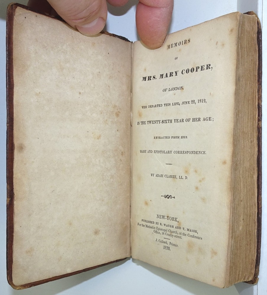 DETAILS: Title: Memoirs of Mrs. Mary Cooper, of London, Who Departed This Life, June 22, 1812, in The Twenty-Sixth Year of Her Age; Extracted From Her Diary And Epistolary Correspondence. Date Published: 1832 . Place Published: New York . Published By: B. Waugh and T. Mason . Size: Approx 5 1/4" x 3 1/2" x 5/8". CONDITION: Overall: Good. Publisher's original hardcover boards. Neatly rebacked! Pages: Good with some (mostly) light foxing / soiling, (please see pictures) . Binding: Very good, still sound . Hinges: Excellent / replaced . Hardcovers: Good to very good with some wear, (please see pictures) . Spine: Excellent / replaced . WHY SHOULD YOU BUY FROM US? 1. Honest descriptions. 2. Efficient communication. 3. Sympathetic and patient packaging, using appropriate materials. 4. Fast order dispatch, usually within one business day. 5. A sincere commitment to 100% customer satisfaction. IF FOR ANY REASON YOU HAVE A CONCERN WITH OUR PRODUCT OR SERVICE, PLEASE CONTACT US SO WE CAN MAKE IT RIGHT! THANK YOU FOR YOUR INTEREST!