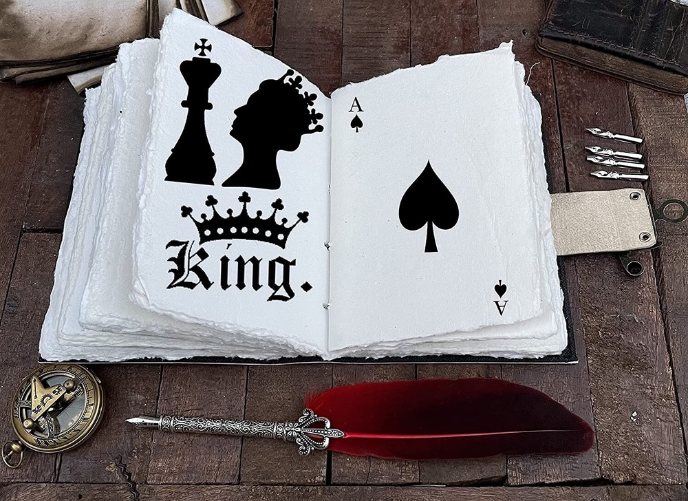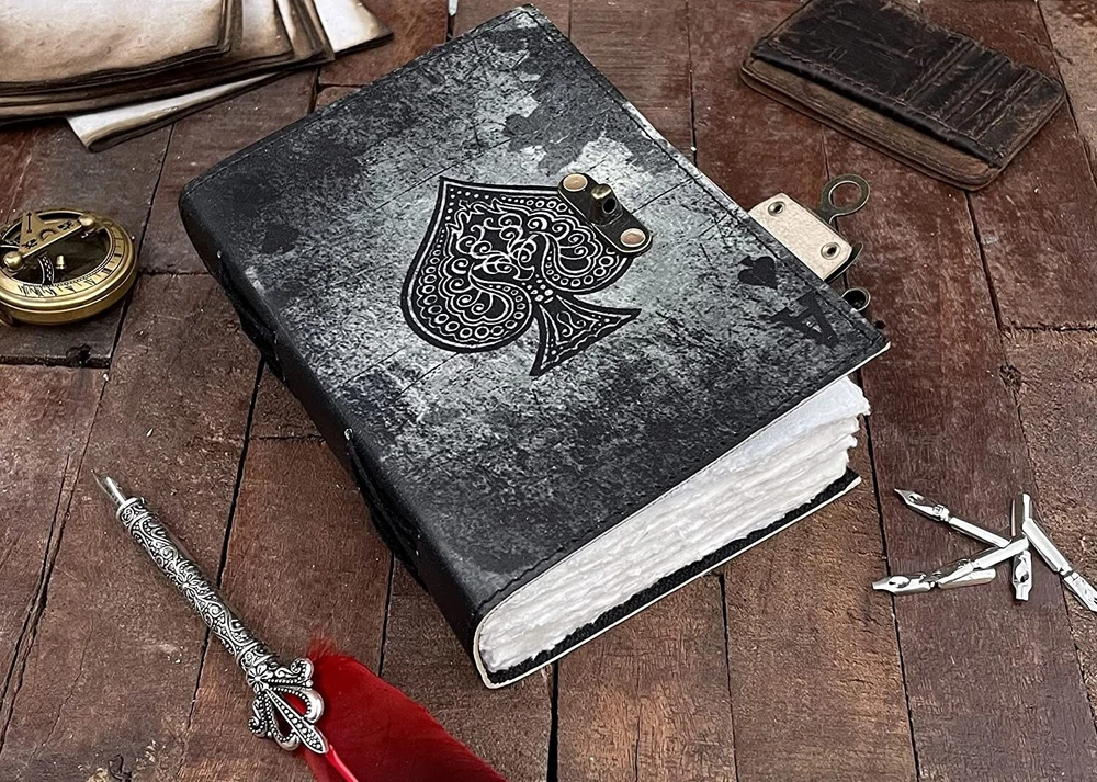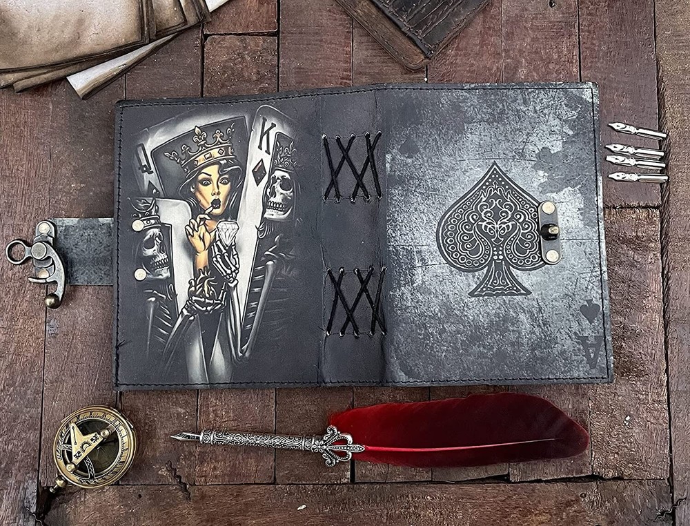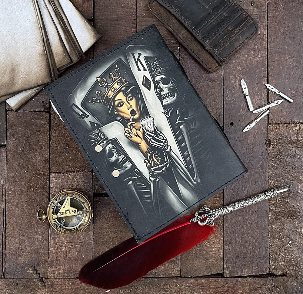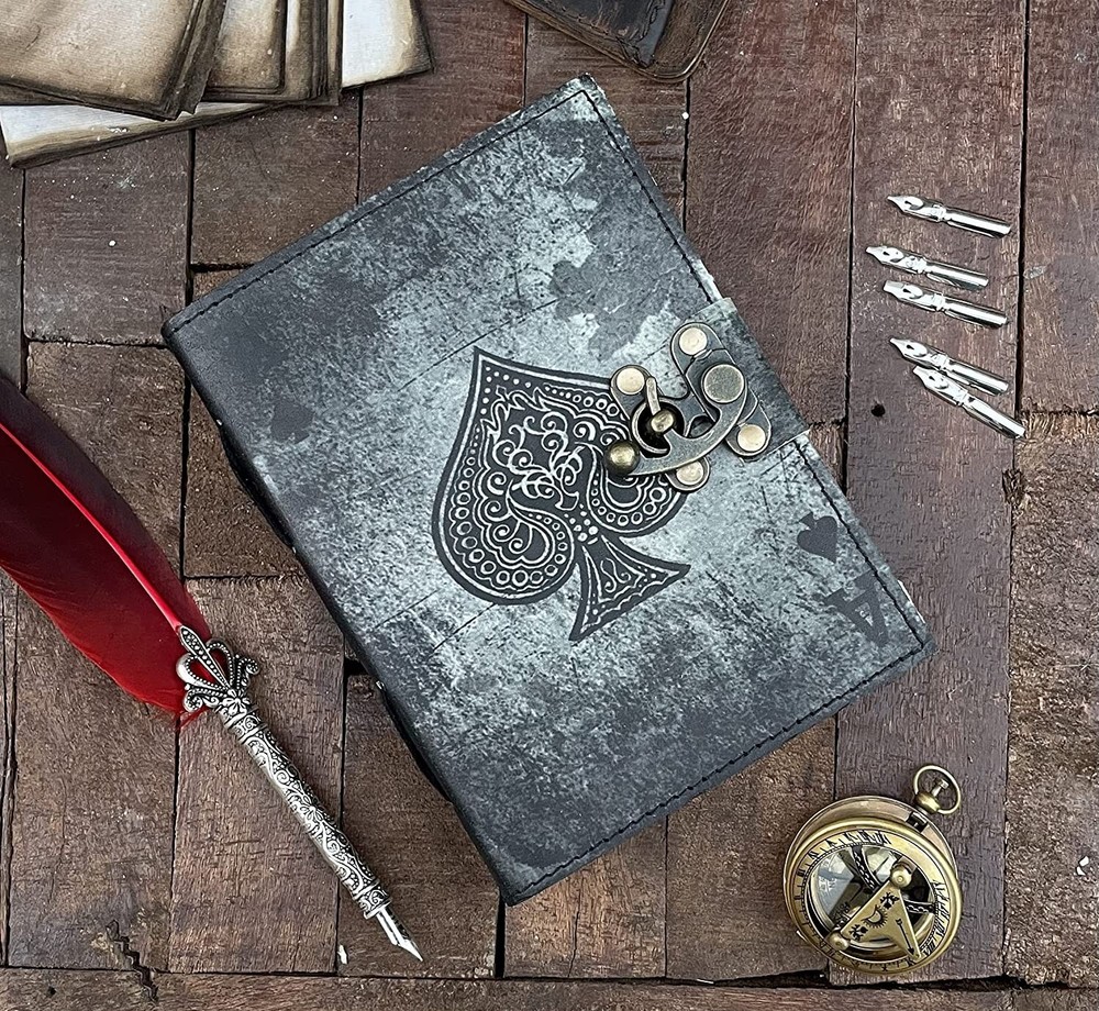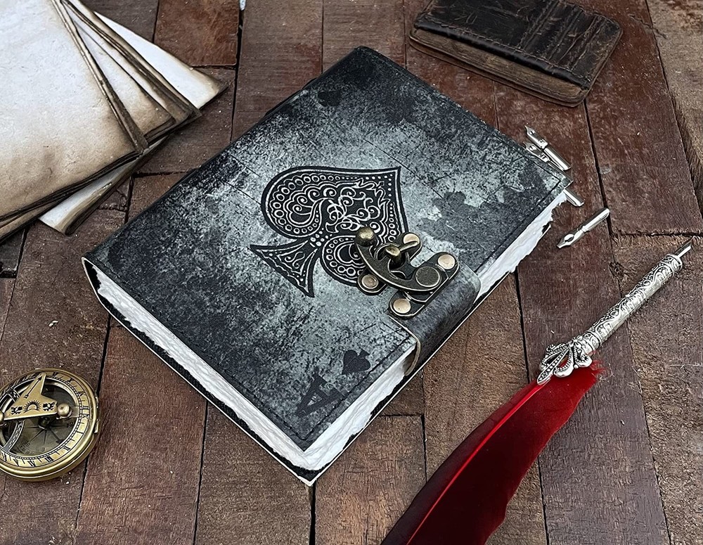 BEAUTIFULLY CRAFTED: Our handmade artisan leather bound spell book grimoire journals are crafted from genuine leather. The black colouring gives it a beautiful antique vintage feel. Being hand-made from natural leather. The cover features a beautiful Deer designing. VINTAGE LOCK AND STURDY BINDING - The vintage clasp lock will keep all your valuable writing locked inside. Sturdy hand stitched binding to make sure that no paper comes out loose from your Spell BOOK. PERFECT FOR GIVING: Suitable for both men or women to write in, this locking diary daily travelers notebook is perfect for an avid writer, or Harry Potter fan looking for a magic spell book. Ideal to give as a birthday gift, valentines, halloween, graduation or wedding anniversary present. Spell Book Tarot Journal Merchandise Popsocket Grimoire Wiccan Witch Prop Spells Decor Skull Lovers Blank Notebook Gift Props Spellbook Blanks With Clasp Coloring Books For Men Women Adult and you can keep this journal at your bedside as like memory of your loved ones.. USE ANY KIND OF PEN - Size: 5"X7" This Gothic gifts Sketch, Doodle, Write on your Book with a Calligraphy Pen Fountain Pen, Brush Pen, Ball Pen, Acrylic Colours, Watercolor and many more. We guarantee no bleed through. SIZE - 5X7 Inch. OUR PROMISE: We are positive you will love our products, but if you don't for any quality reason, we will replace or refund for up to 30 days after purchase. Our friendly customer service team are always available to answer any questions you might have. MANY USES - This aesthetic Lovers Journal Can be used as a Hocus Pocus gifts , the lovers tarot journal, gothic notebook, skull journal, spell books halloween decorations, book of spells halloween decor. grimoire spell book, drawing or sketching and compact for carrying in your bag. Ideal for alternative Artist Sketchbooks, Photo Album, Traveling Notes, Business Executive, Logbook, hocus pocus spell book , Journalists, Food Planner, old spell notebook, antique handmade skull journal