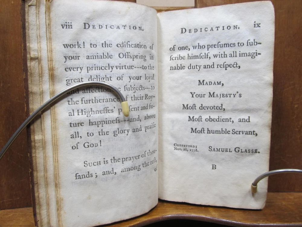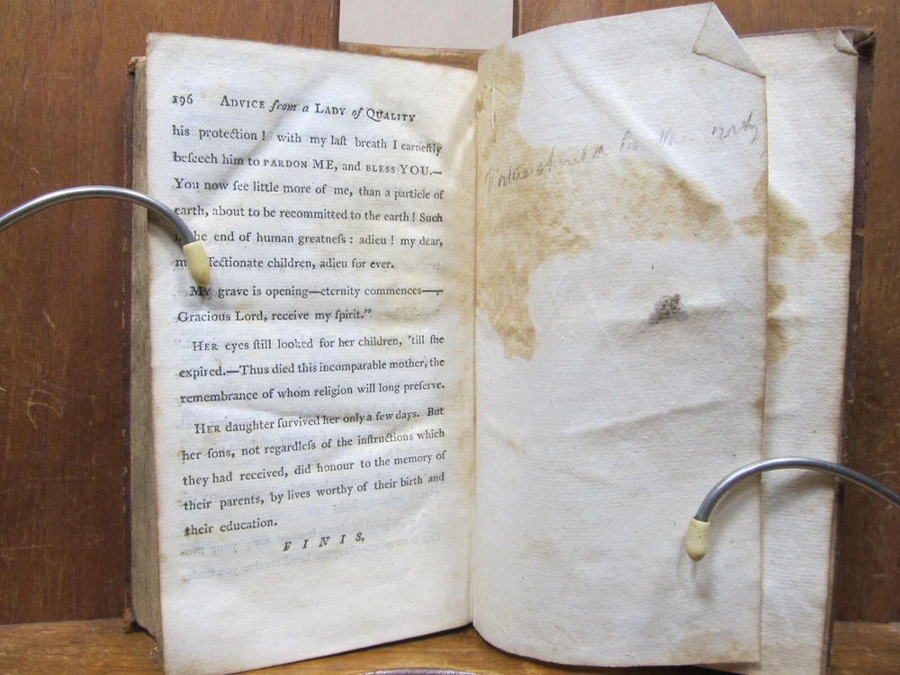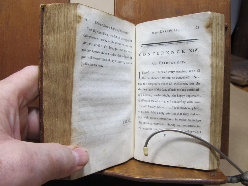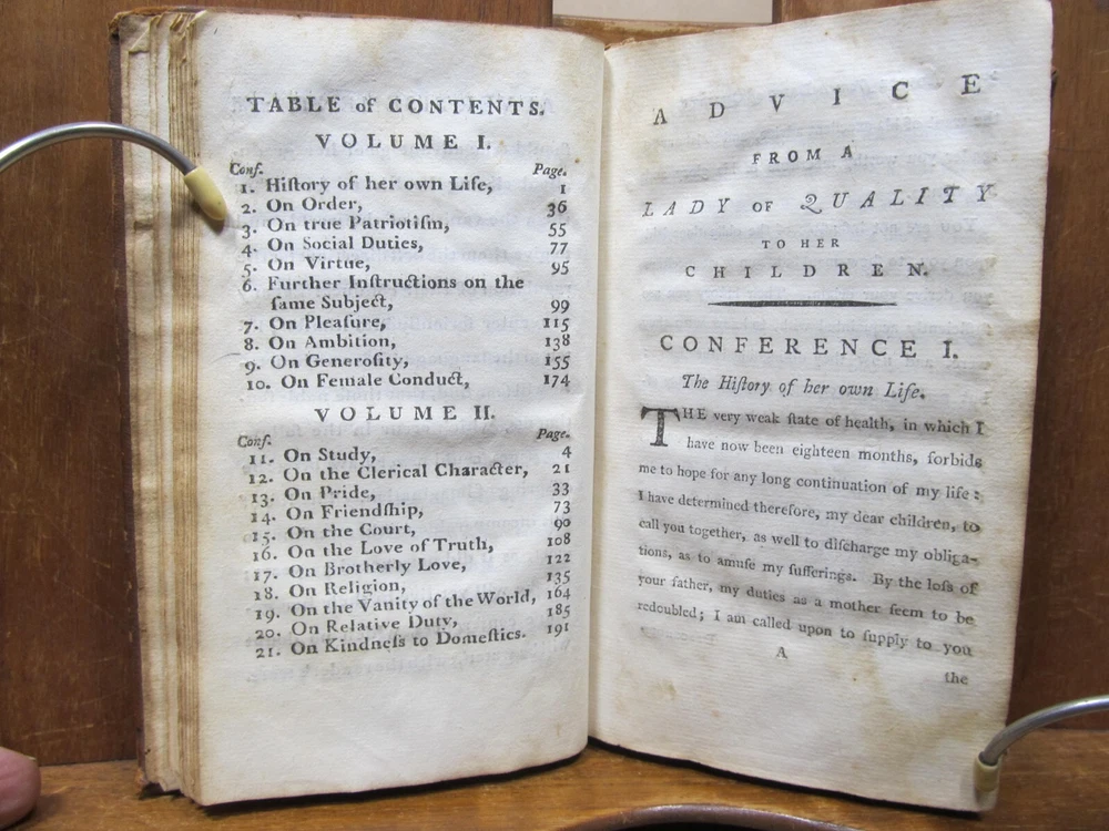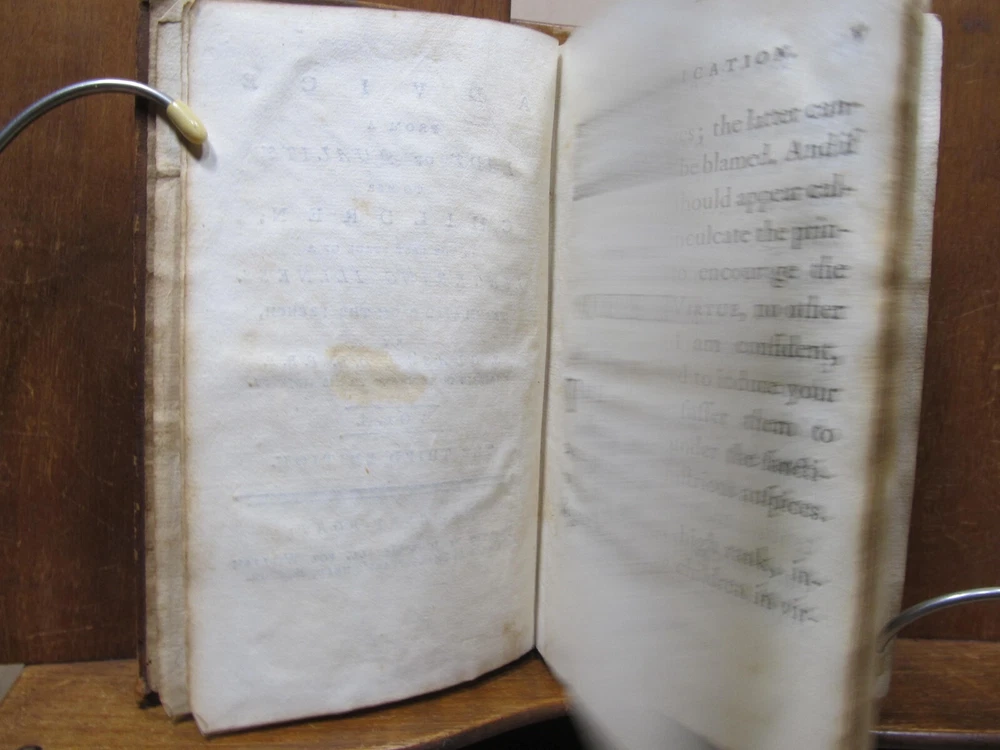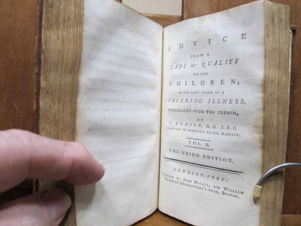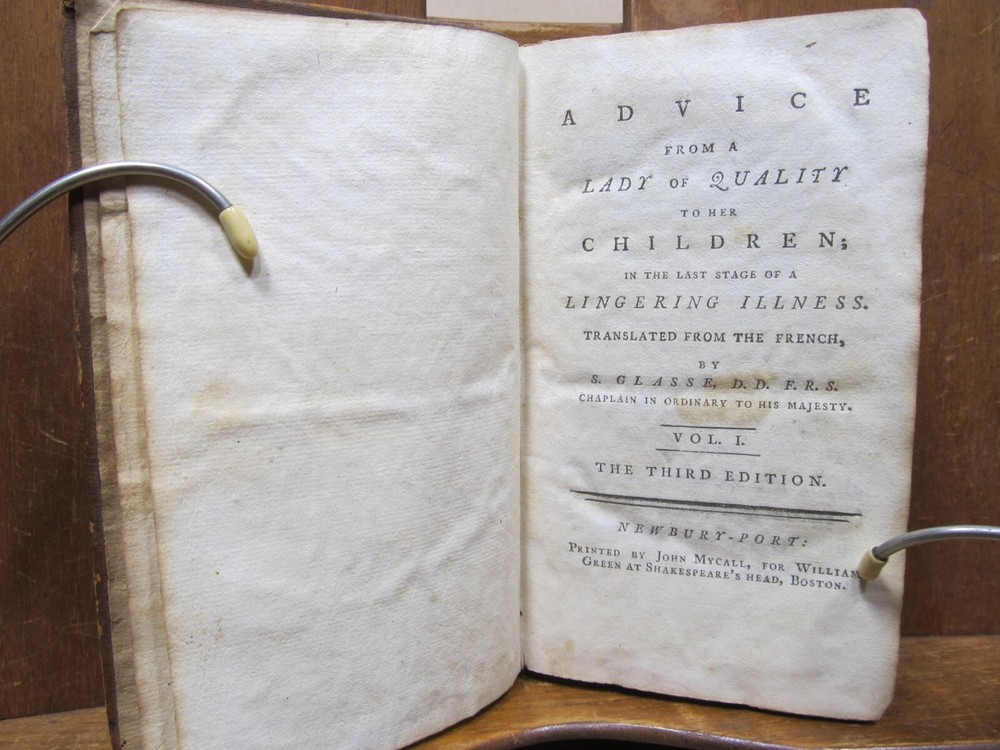 ADVICE FROM A LADY OF QUALITY TO HER CHILDREN IN THE LAST STAGE OF A LINGERING ILLNESS. Translated from the French by S. GLASSE. Two volumes in one. Publisher: John Mycall for William Green, Newbury-port, Boston. Third edition. Description: Contemporary leather binding with raised bands and red pastedown gilt label on spine. Dedication to the Queen, Translator's Preface and advertisement proceeds text. Condition: Good. Covers show 200+ year wear. Chip from top edge of spine, hole on upper spine on back cover. Previous owner names on inside cover and free endpaper. Pages are browned and foxed, but tight to the spine. Back endpaper and cover have moisture stain and holes from separating free endpaper from back cover. Not insect damage. (see photos) Pages: Vol I: 191, Vol II: 196 Size: 3.75" x 6" Weight: 8 ozs Unusual Newbury-port imprint; this work first published in Boston in 1804. A book of conduct, sometimes attributed to Louis Antoine de Caraccioli, translated by Samuel Glasse and very popular in America. Consists of a series of "conferences", most addressed to two sons, but with one addressed to a daughter, "Your sex requires the utmost circumspection; what among men is reputed a venial fault is an absolute crime with us". Check out my other current book listings. I will combine shipping for the best rate. Ask if you have questions. No reserve. You bid, it sells! This book is from the estate of Caroline (Caro) Weir Ely (1884 - 1974). She was an accomplished bookbinder, printmaker, etcher, and painter. She was educated in both New York and Paris and continued to work, maintaining a studio, even after she married and became a mother, a rare occurrence in the early 1900s. She settled in Old Lyme, Connecticut, a town known for its art colony. Like her father Julian Alden Weir a noted American Impressionist painter, she often painted near her home. Following her father's death, she sometimes printed his etched plates, producing posthumous editions of his landscape prints. Wikipedia
