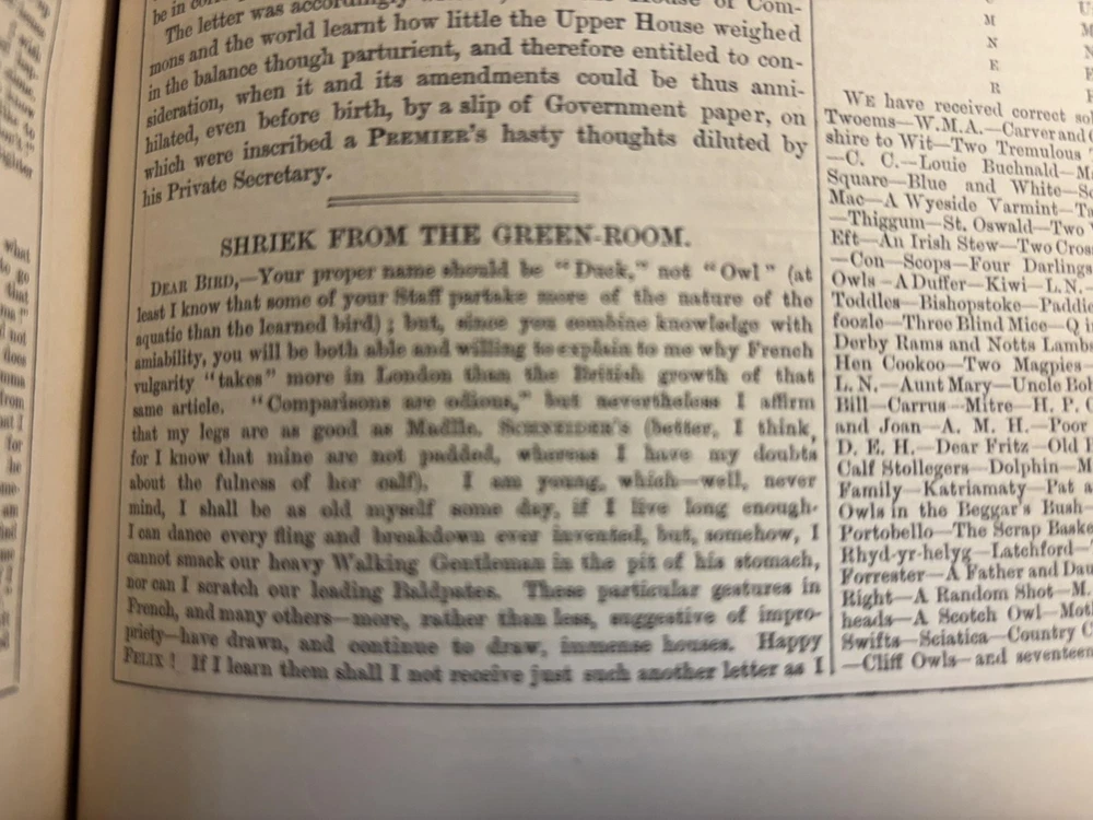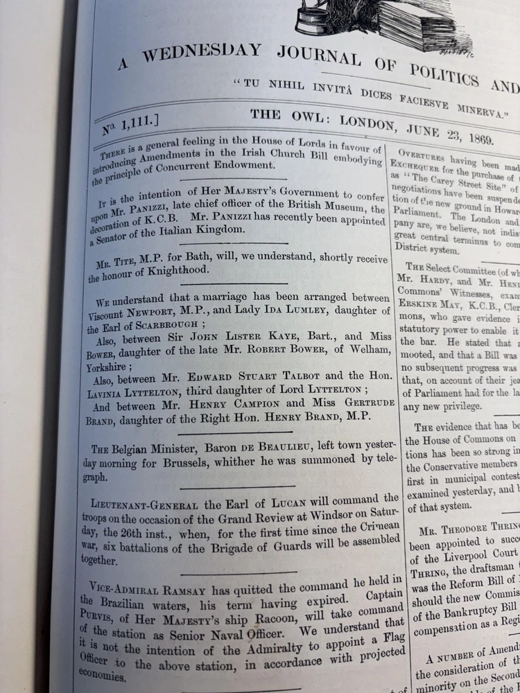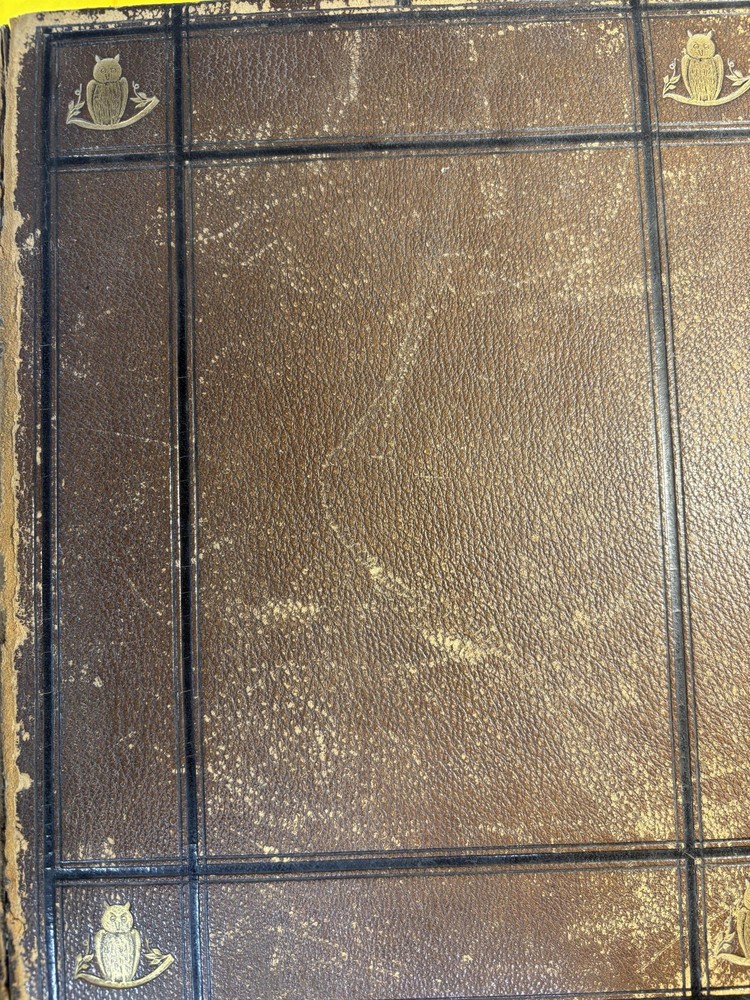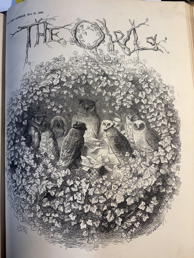 THE OWL: A WEDNESDAY JOURNAL OF POLITICS AND SOCIETY Author: Borthwick, Algernon, Evelyn Ashley Title: THE OWL: A WEDNESDAY JOURNAL OF POLITICS AND SOCIETY Publication: London, England: 1867 - 1869 Description: Leather-bound. Quarto. Bound issues. Front and rear boards both cross-ruled in black with owl motifs to each corner compartment. Beveled edges, very scuffed. Inner dentelles. Scuffing to boards and front board almost entirely detached. Marbled endpapers in the nonpareil style of burgundy, buff, eccru, turquoise and white. Bookplate to front free endpaper of Edward Montagu Stuart Granville, Earl of Wharncliffe, who was apparently one of the founders and principals.This bound gathering of 65 separate numbers of the admittedly irregularly-issued magazine covers February 13, 1867 to July 28, 1869. First issue was said to have been purposely numbered #1000 This publication seems comprised of parliamentary commentary, long barely attributed poems, general gossip, satire, double acrostics, advertisements,biting humor *usually at someone else's expense). and general Snooty Omniscience, Covers Fair: Text Block: Very Good. Wikipedia's compendium of information states: ""a satirical society newspaper published in London from 1864 to 1870. Irregularly published, but sometimes fortnightly, it cost 6d., was Tory in politics and consisted of a mix of satire and London society gossip. The Owl was founded by Morning Post editor Algernon Borthwick, together with Evelyn Ashley, Lord Wharncliffe (1827–99) and James Archibald Stuart-Wortley.[The Conservative MP Alexander Baillie-Cochrane, 1st Baron Lamington was joint editor of the paper from 1864 to 1868. Contributors included the architect Arthur Ashpitel (1807–69), Disraeli's private secretary Montagu Corry, Laurence Oliphant, and Henry Drummond Wolff.[2] They also included Mortimer Collins, Lord Houghton, Ralph Bernal Osborne, George Otto Trevelyan, and Thomas Gibson Bowles." Seller ID: 88377 Subject: Humor Aardvark Rare Books Eugene, OR We work hard to make your Bookbuying Experience safe, easy and fun. Aardvark Books is a proud member of the ABAA (Antiquarian Booksellers Association of America) and IOBA, Independent Online Booksellers Association. Ezra is also an accredited and Qualified Appraiser of Books and Manuscripts, with a designation from the ASA (American Society of Appraisers), with considerable Archive experience as well. Shipping All books shipped to US destinations are sent via the US Postal Service. Faster shipping is available, please ask before paying. We will combine shipping on items purchased at the same time in order to help reduce costs. International shipping is also available. Please inquire for a shipping quote before ordering. This listing was created by Bibliopolis.