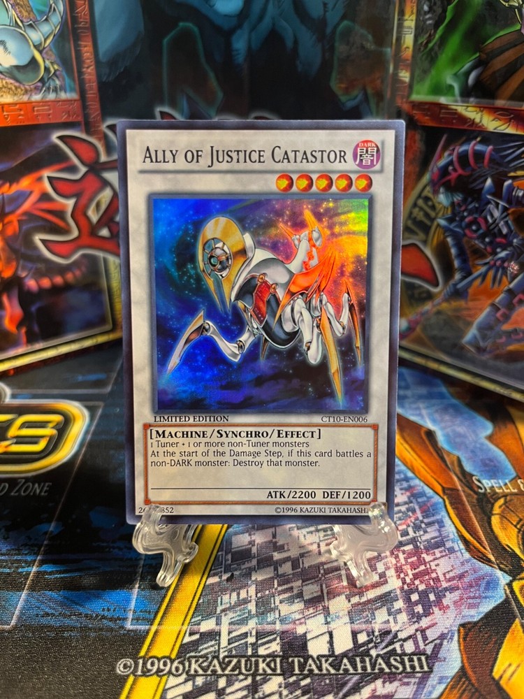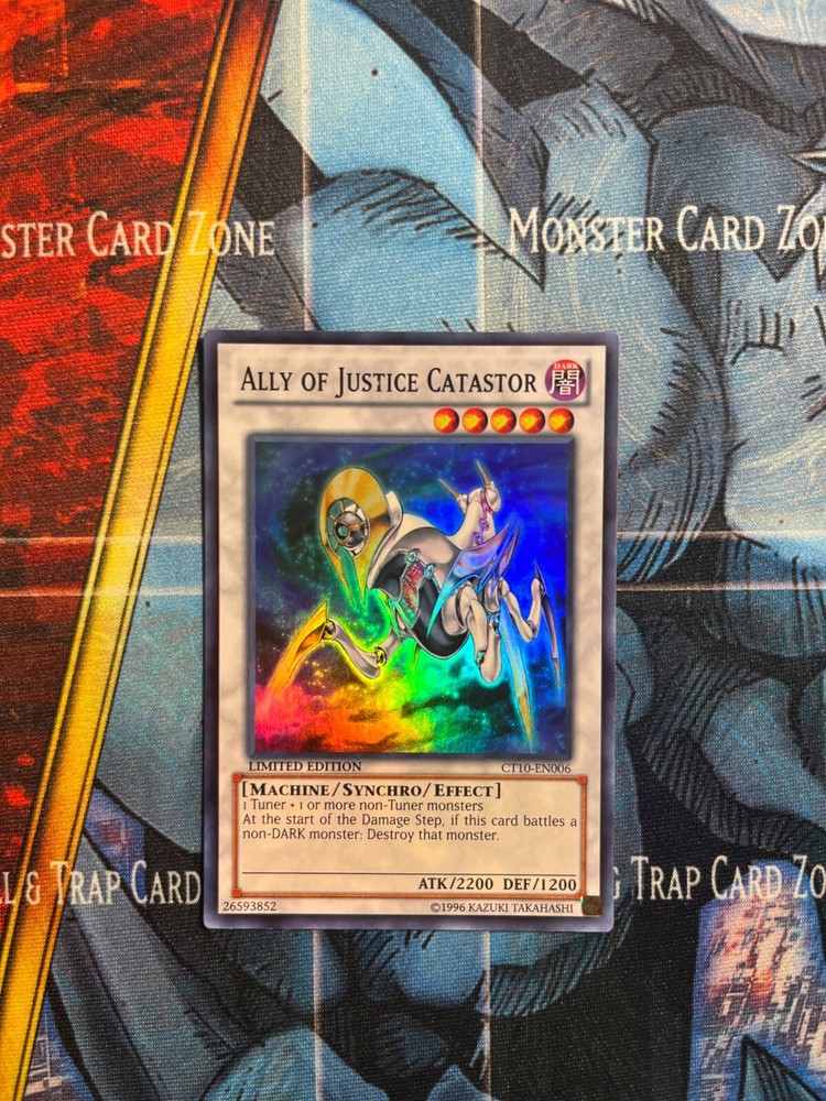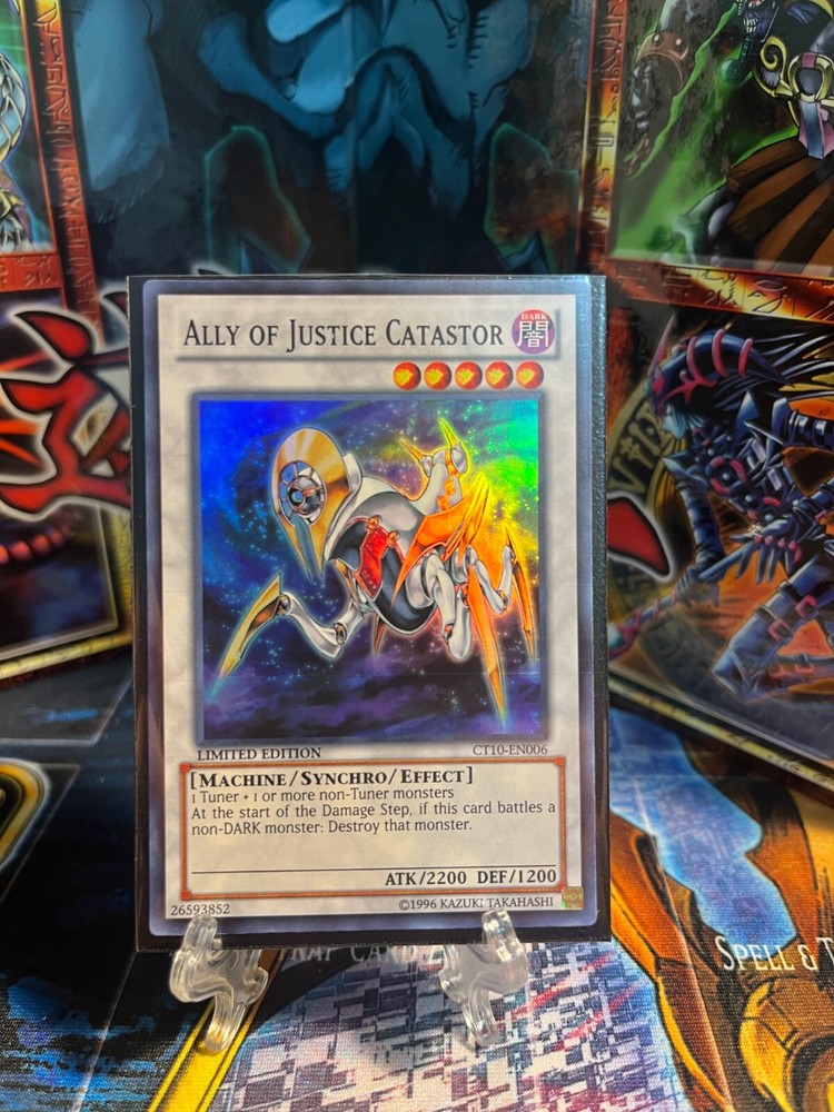 This limited edition Ally of Justice Catastor card is a must-have for any Yu-Gi-Oh! TCG collector. With its Super Rare rarity and Synchro/Effect Monster card type, this card is sure to be a valuable addition to your collection. The card comes from the 2013 Collectors Tins set and features the card number CT10-EN006. The card is in great shape, with no visible damage or wear, and is ready to be added to your collection. Don't miss out on the opportunity to own this amazing card.