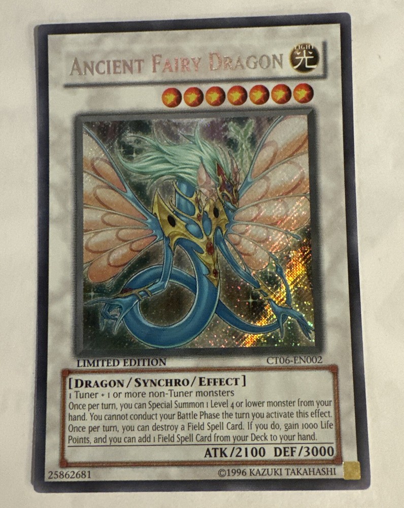 Ancient Fairy Dragon Secret Rare Limited Edition Yugioh Card CT06-EN002 VLP. Few light scratches on back. ***I will consider REASONABLE offers. If you offer 50% off or more I will not consider that a reasonable offer, and will be less likely to consider a lower price. Please do not ask me for a best price and counter with something way lower. I do combine shipping but do not ask for a shipping discount on a single item. We calculate shipping based on weight, size, and location.