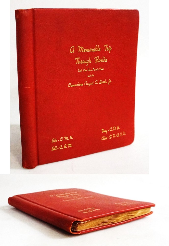 Building Your Great Collection; One Fine Book at a Time Anheuser-Bush Photo Journal. [Early Construction of Bush Gardens] 'A Memorable Trip Through Florida with our Own Private Fleet and the Commodore August A. Busch, Jr.' [late 1950s] [August A. Busch, Jr.] Photo album in red leather with title in gilt. Contains 83 - 5 by 5-inch photographs on 25 leaves of fine stiff stock. Photos have evenly aged, Two of the photos show the Pink Elephant Restaurant of Boca Grande, Florida, a renowned restaurant and gathering spot with a rich history. Established in 1947 it quickly became a popular venue for both locals and visitors. By 1950, it was a bustling establishment, especially favored by charter fishing guides and their clients. Several photos show construction. It is likely that these are photos of the early construction of Busch Gardens, Tampa . The construction of Busch Gardens Tampa Bay began in 1959, with the park opening to the public in March 1959 as a part of the Anheuser-Busch brewery complex. Initially called Tampa's Bird Gardens, it was a combination of a botanical garden and a bird sanctuary. Two photos show mushroom like structures with gnomes which became part of the Leprechaun Village. Additional photos show the Regal Beer distribution center. Regal Beer was a notable regional beer brand in Florida, particularly in the Miami area, established in 1934. In 1958, Anheuser-Busch acquired the Regal Brewery, continuing to produce Regal Beer for a few years before eventually discontinuing the brand. Photos also show the family in residence, and scenes of the local area Fine / No Dust Jacket, As Issued. From the estate of Elene B. Roberson, the daughter of August A. Busch Jr., who was the president of Anheuser-Busch. And Check out our other items ! Member of ABAA [American Booksellers Antiquarian Association] FABA [Florida Antiquarian Booksellers Association] IOBA [International Online Booksellers Association] The Ephemera Society of America Terms Guarantee We tend to be conservative in our grading, but even the best booksellers make an occasional mistake. Our books, and ephemera are described using AB Bookman standards. Our Guarantee: All items will be received as advertised and in the condition described. Any item is returnable for any reason within 30 days of receipt (prior notice appreciated). If you have questions regarding our description of any item, we encourage you to contact us prior to buying. We are members of the ABAA (Antiquarian Booksellers Association of America) and the Independent Online Booksellers Association (IOBA), and we adhere to these associations' strict ethical guidelines and conditions of sale. Shipping Standard shipping is by USPS Media Mail. Delivery typically takes 4 – 8 days (and sometimes longer) depending upon destination. We are happy to upgrade shipping to Priority Mail or to arrange overseas shipping to most foreign countries. Please choose that at checkout. Feedback We leave feedback for buyers once they have posted feedback for us. If you are unhappy with any aspect of a transaction with us, please contact us immediately. Our priority is to make customers happy and to resolve problems as promptly as possible. This listing was created by Bibliopolis.
