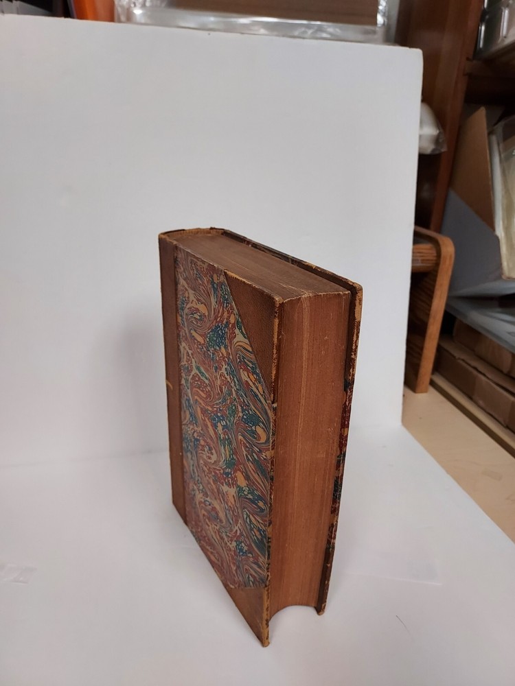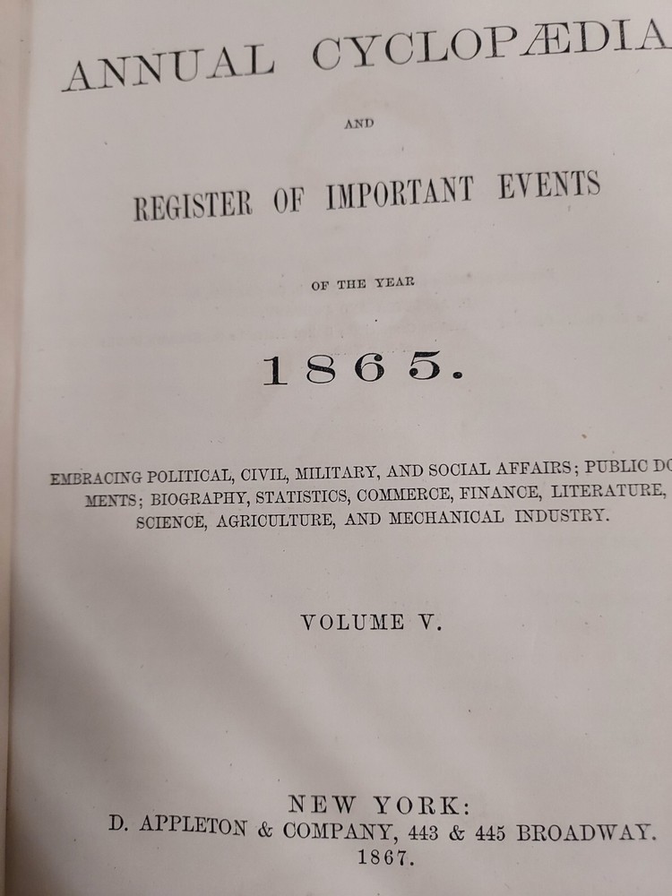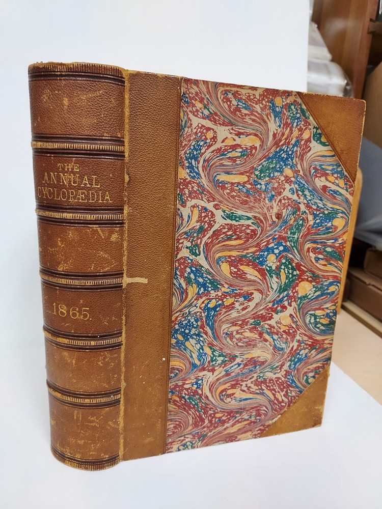 Antique 1867 printing of , "The American Annual Cyclopedia and Register of Important Events of the Year 1865." Very good hardcover in leather quarter spine and tips. Colorful marbled boards. Five band leather spine with clear gilt text. Straight, secure spines and clean interiors. Tight text block with gilt edges. This volume contains information pertaining to the Civil War including Army operations, Abraham Lincoln, the Confederate Army, etc, along with a variety of other information for the year. This book measures approximately 10 1/8 inches by 7 inches and is 850 pages long. It is illustrated with 3 engraved portraits & 2 maps. Excellent condition.
