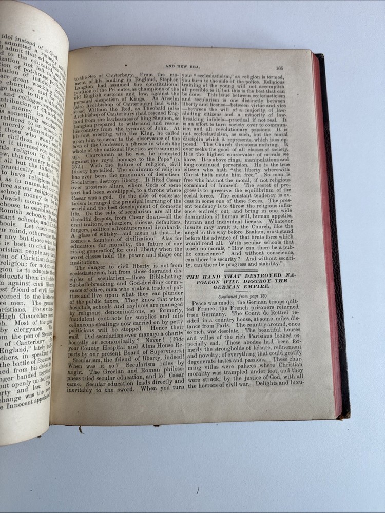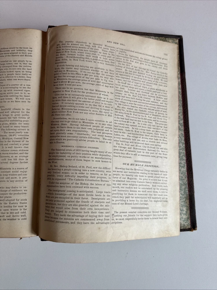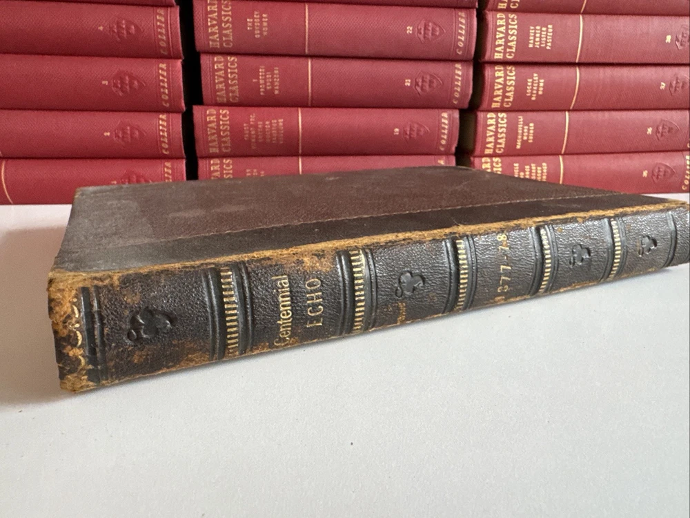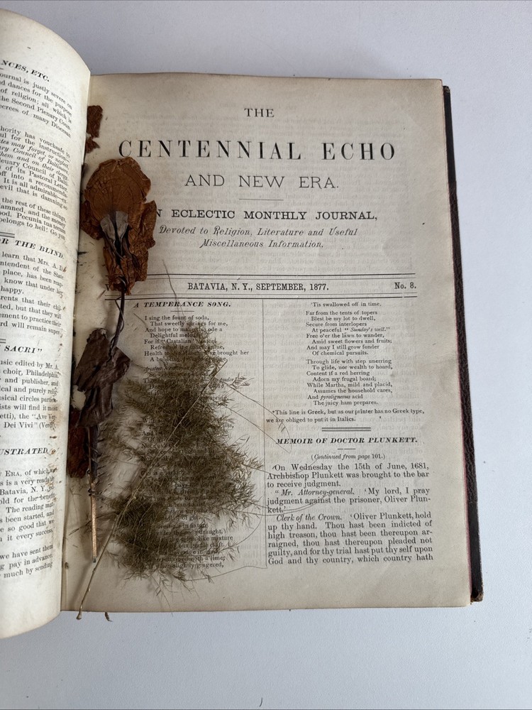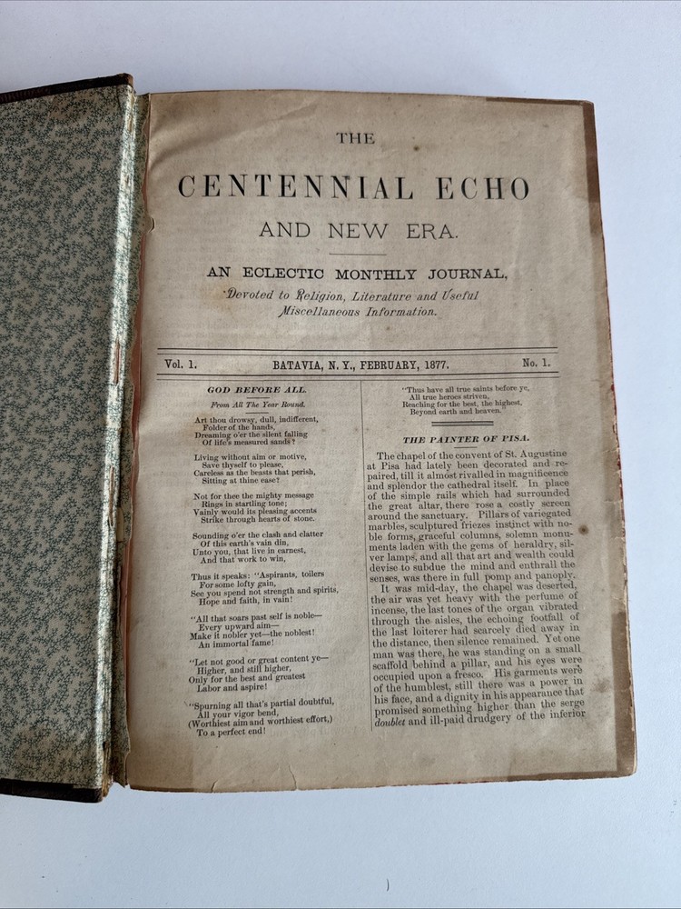 Offered for sale is a rare copy of an antique bound monthly journal spanning February 1877 to early 1879. ‘The Centennial Echo and New Era’ “An Eclectic Monthly Journal Devoted to Religion, Literature and Useful Miscellaneous Information” Published in Batavia, New York. Hardcover. Partial leather binding. Well over 200 total pages. Interesting mix of content. Good condition overall. Some general shelf and age wear. A few leaves being pressed inside. Some dirt, age coloring. Binding remains intact.