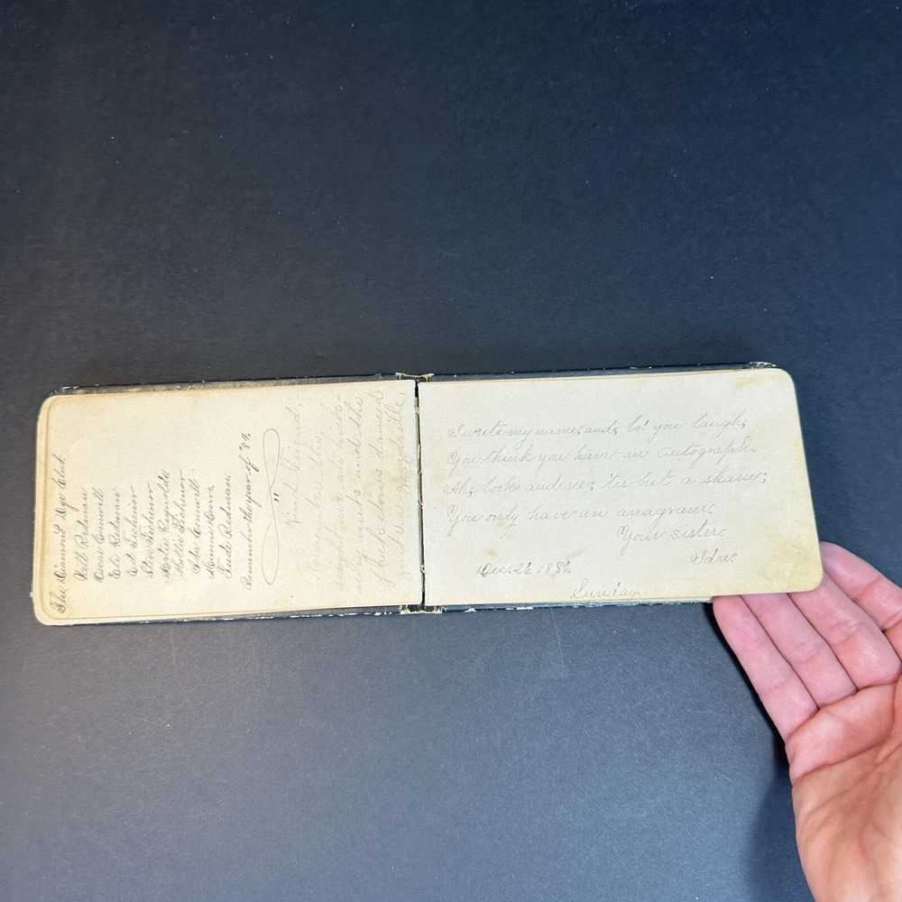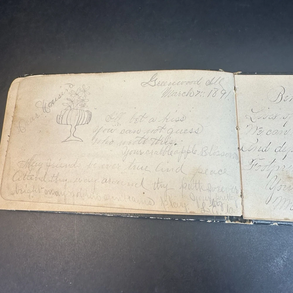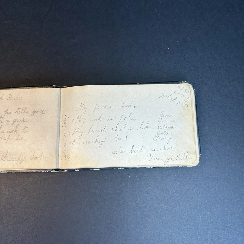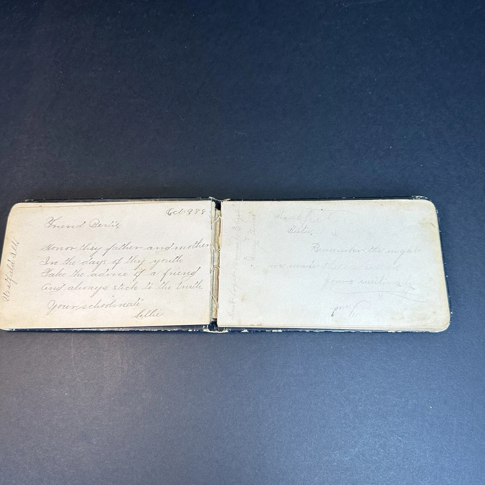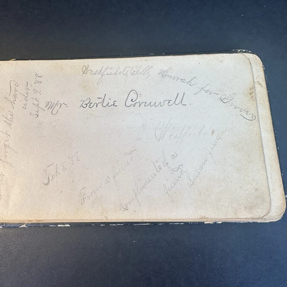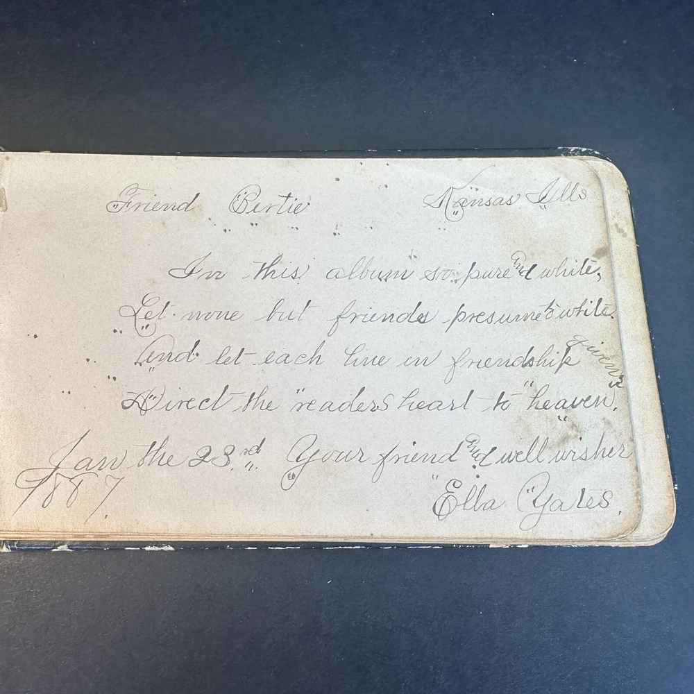 Antique 1880’s autograph book belonging to a Mr. Bertie ? Rodgers of the Kansas Illinois area . This was presented to her from . This was signed by schoolmates, friends etc. these are almost all dated and location noted . 1885-1890? See photos for details and conditions I sold an almost identical one recently that would have belonged to what I’m assuming would have belonged to his sister. I wish I would have found this one at the time so they could have been kept together! Leather bound Showing wear commensurate to this piece. Measurements are 4”x 6” Any questions please ask . Thanks and have a great day!