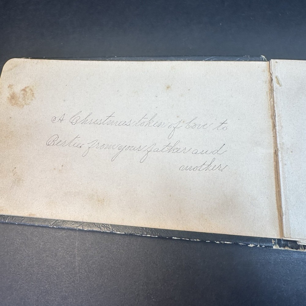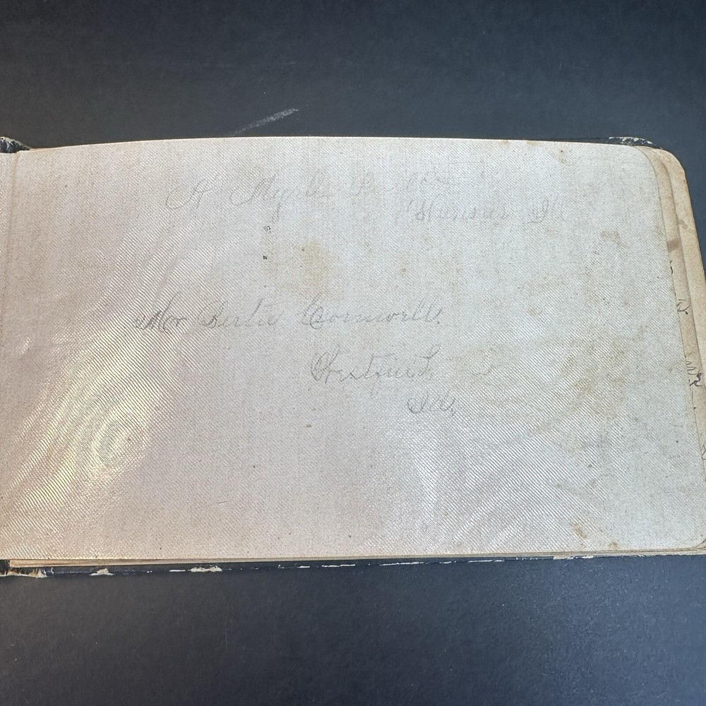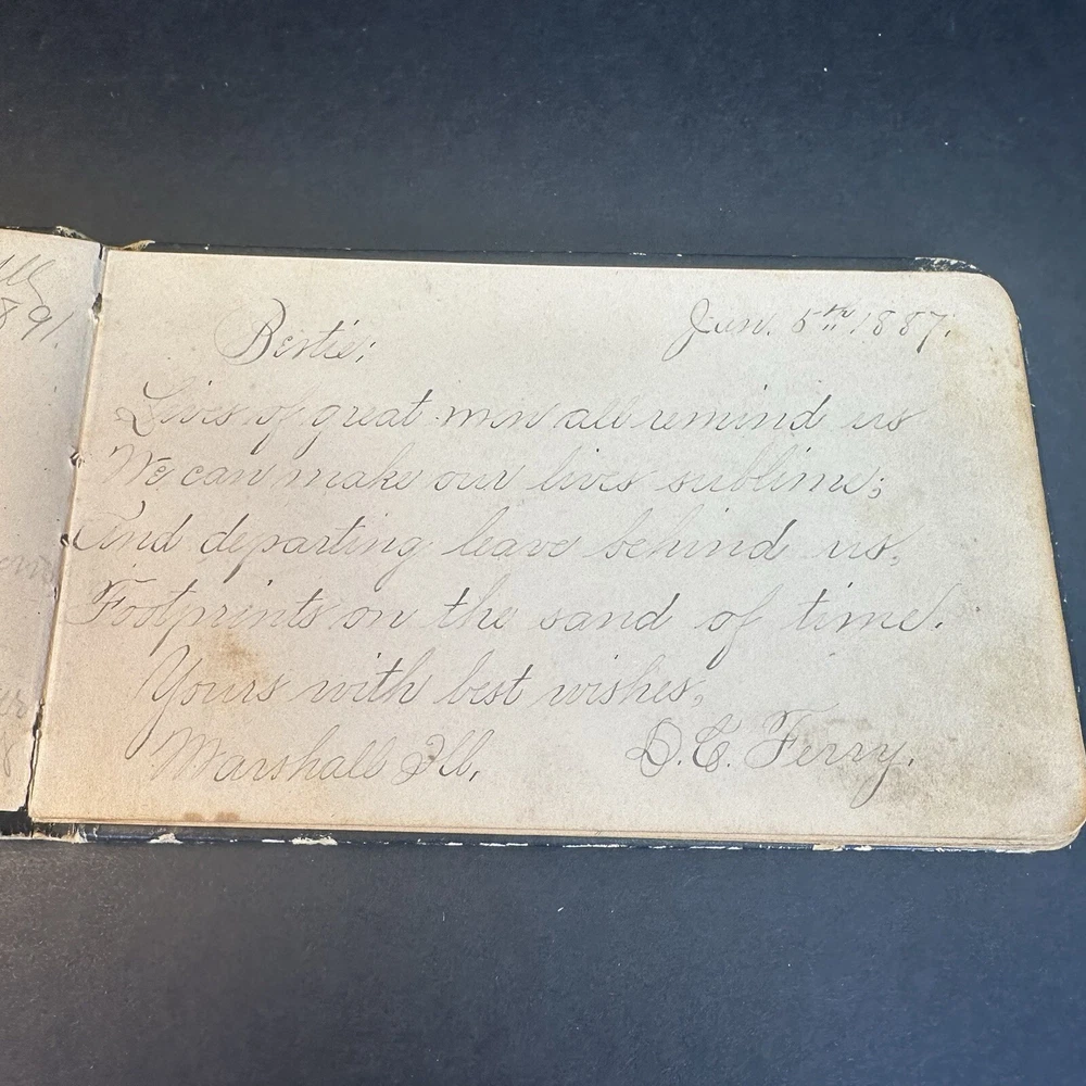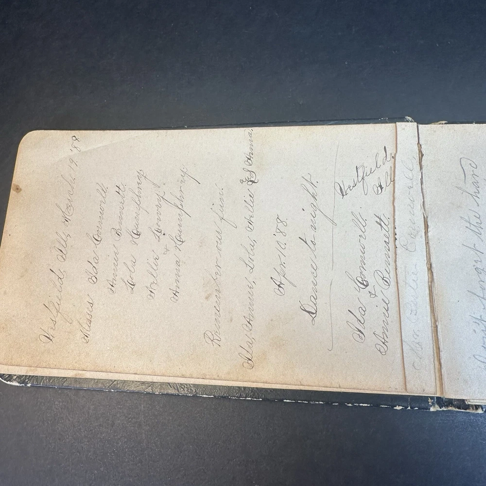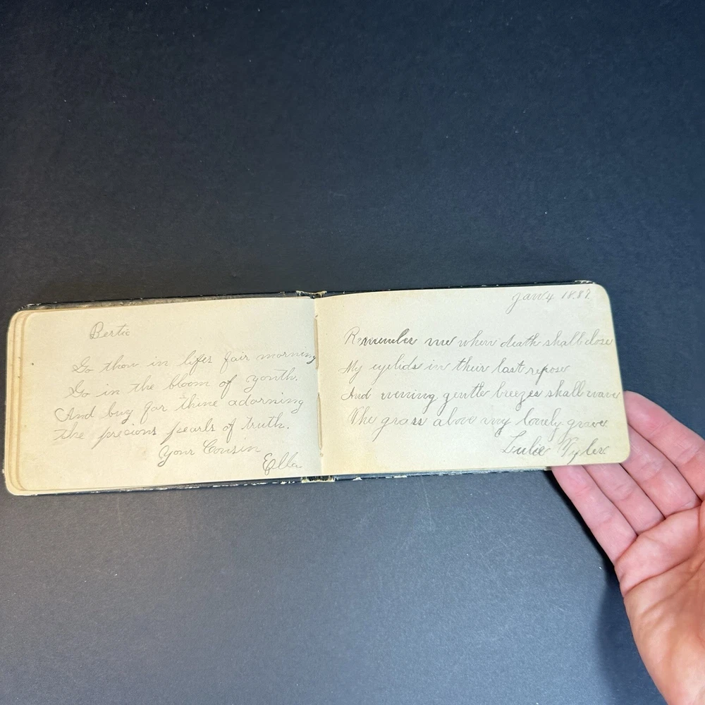 Antique 1880’s autograph book belonging to a Mr. Bertie ? Rodgers of the Kansas Illinois area . This was presented to her from . This was signed by schoolmates, friends etc. these are almost all dated and location noted . 1885-1890? See photos for details and conditions I sold an almost identical one recently that would have belonged to what I’m assuming would have belonged to his sister. I wish I would have found this one at the time so they could have been kept together! Leather bound Showing wear commensurate to this piece. Measurements are 4”x 6” Any questions please ask . Thanks and have a great day!