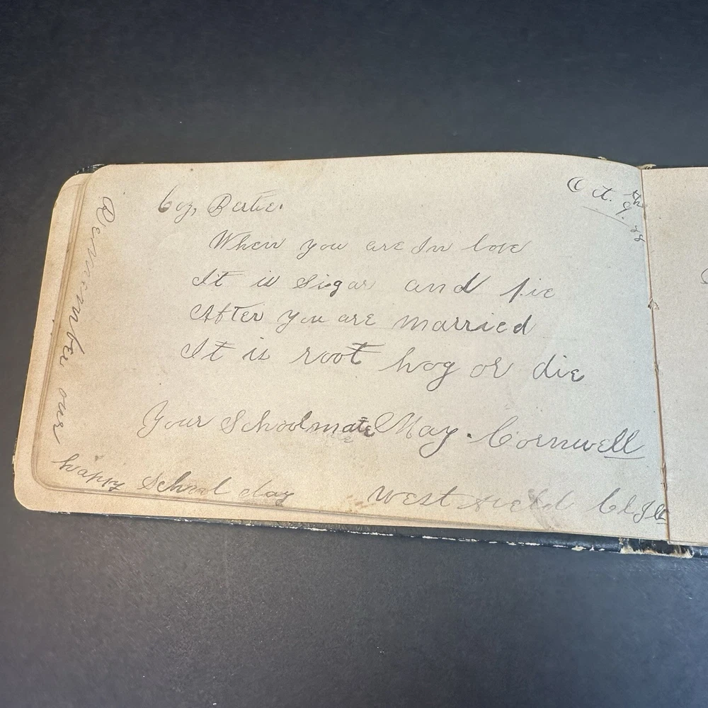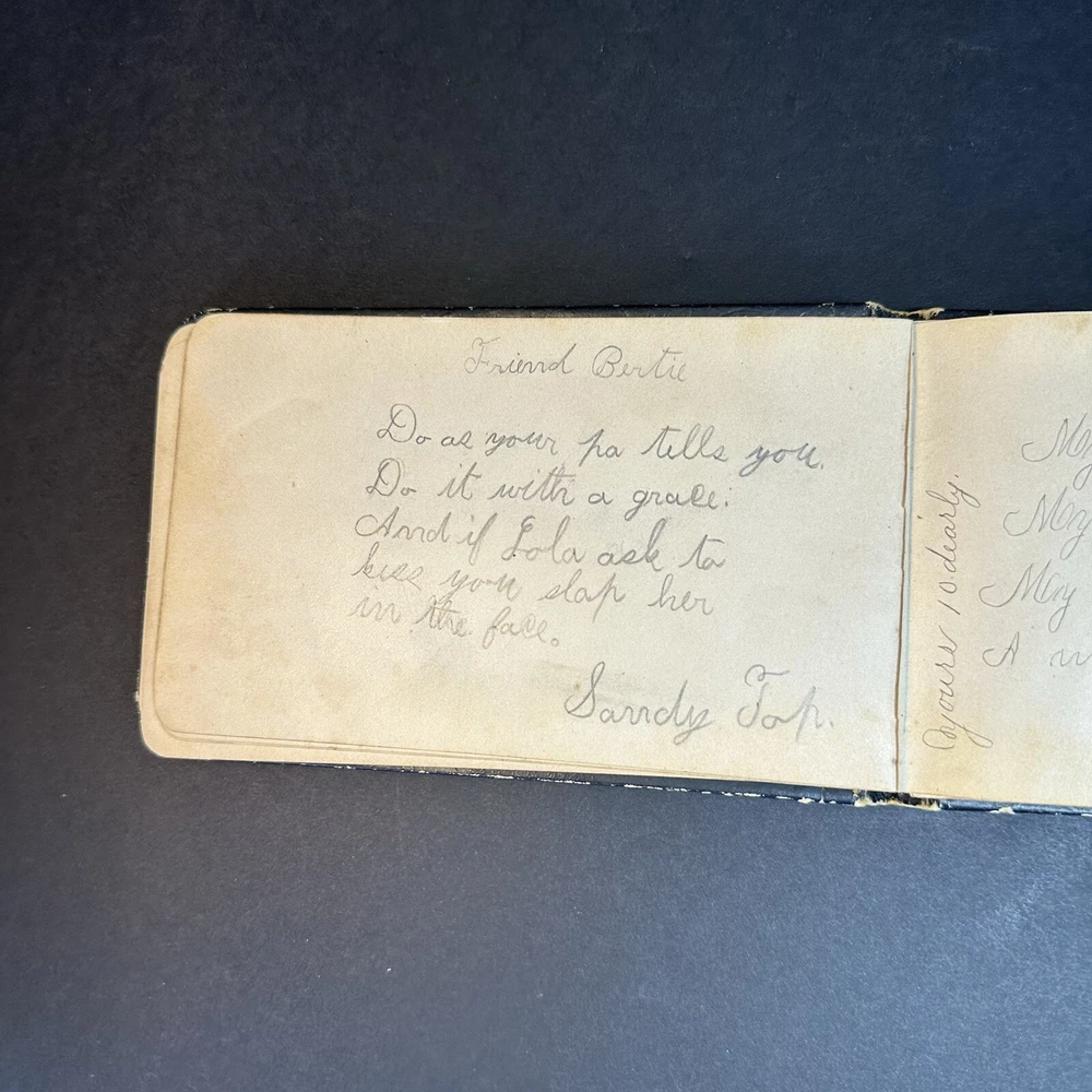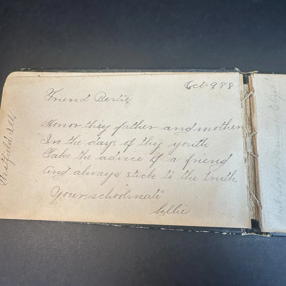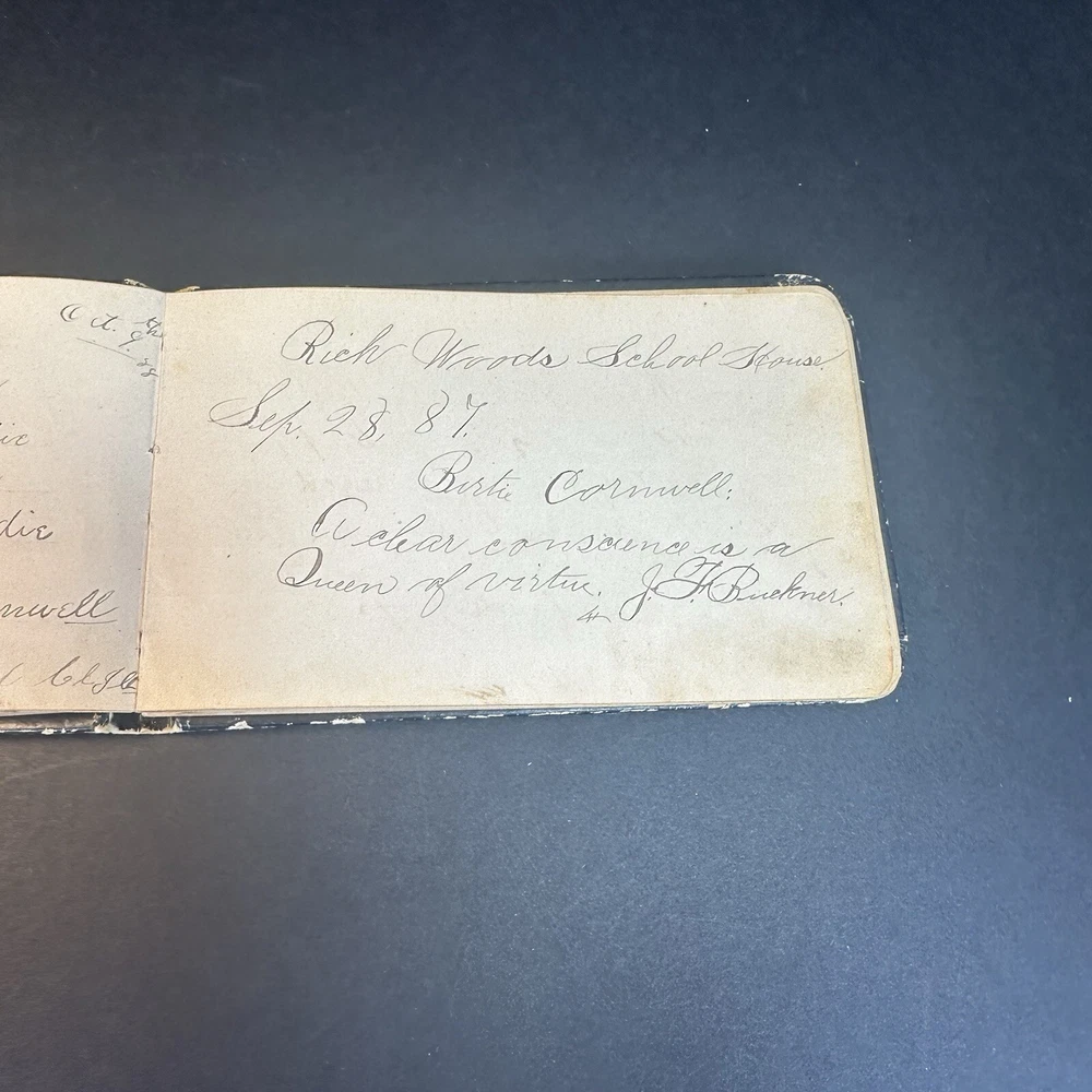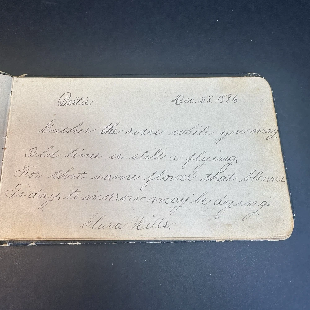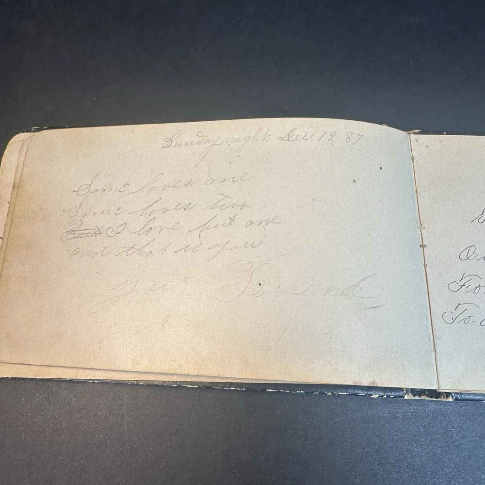 Antique 1880’s autograph book belonging to a Mr. Bertie ? Rodgers of the Kansas Illinois area . This was presented to her from . This was signed by schoolmates, friends etc. these are almost all dated and location noted . 1885-1890? See photos for details and conditions I sold an almost identical one recently that would have belonged to what I’m assuming would have belonged to his sister. I wish I would have found this one at the time so they could have been kept together! Leather bound Showing wear commensurate to this piece. Measurements are 4”x 6” Any questions please ask . Thanks and have a great day!