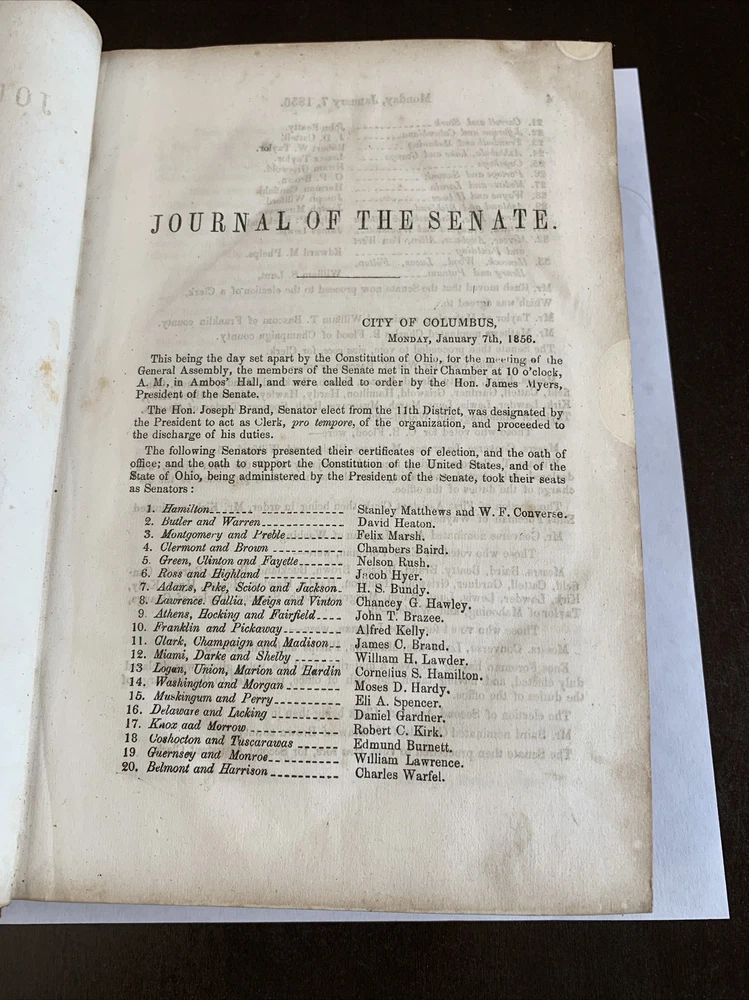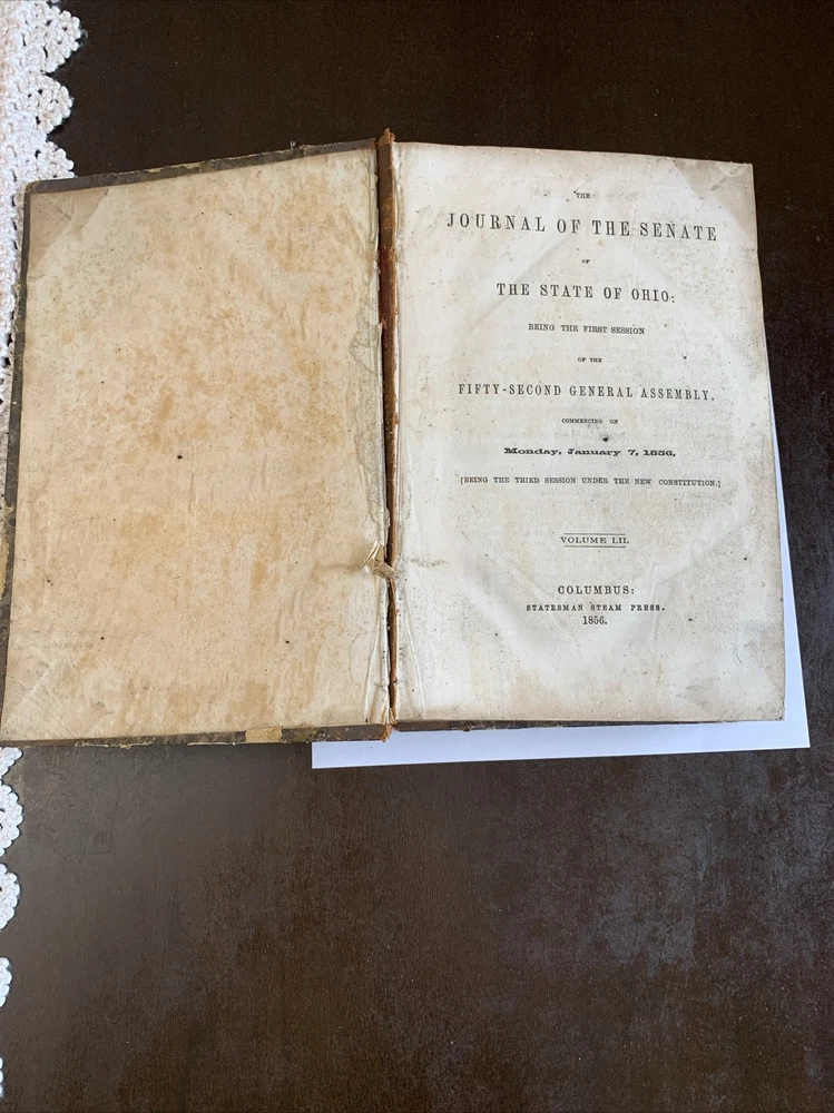 Very rare and scarce original printing. For sale is an antique journal from the Ohio Senate, published in 1856. This leather-bound volume, with a beautiful patina, contains a wealth of information on the political climate of the time. The publication is in its original form, making it a rare and valuable addition to any collection. Its pages are filled with articles on legal and political topics, offering a glimpse into the world of Ohio politics in the mid-19th century. The condition is still good considering the age, the front cover started to separate from the spine binding but still hanging on fine on a one sturdy sewn thread. The pages are secured in a secure binding.