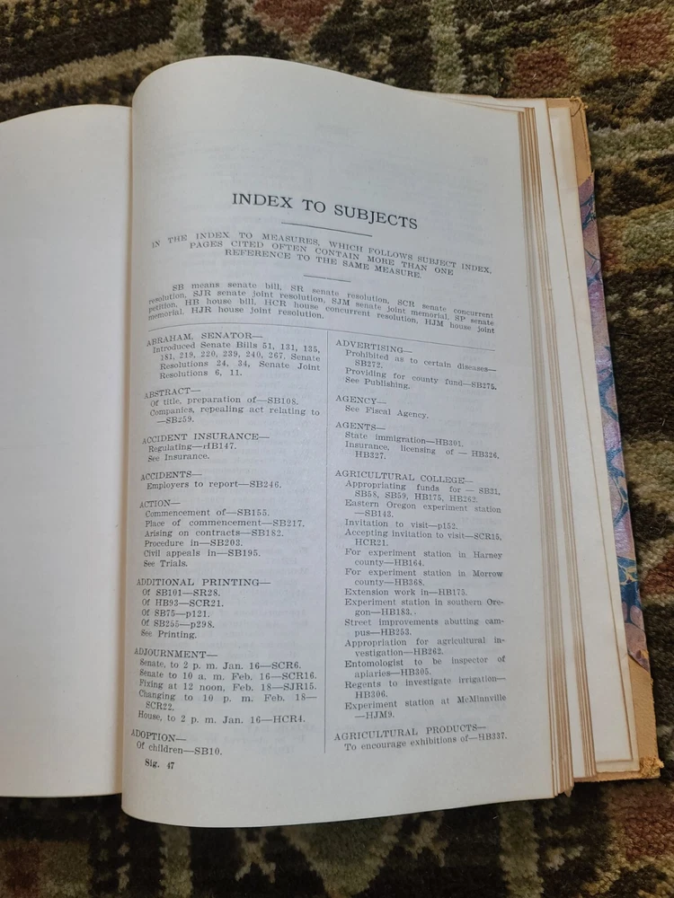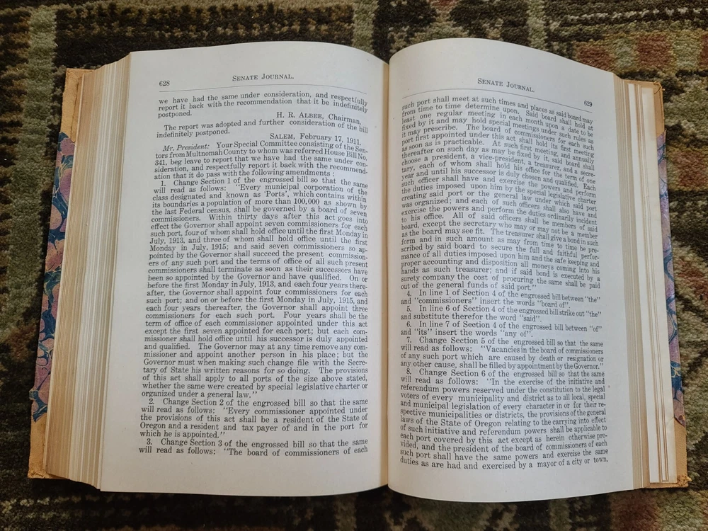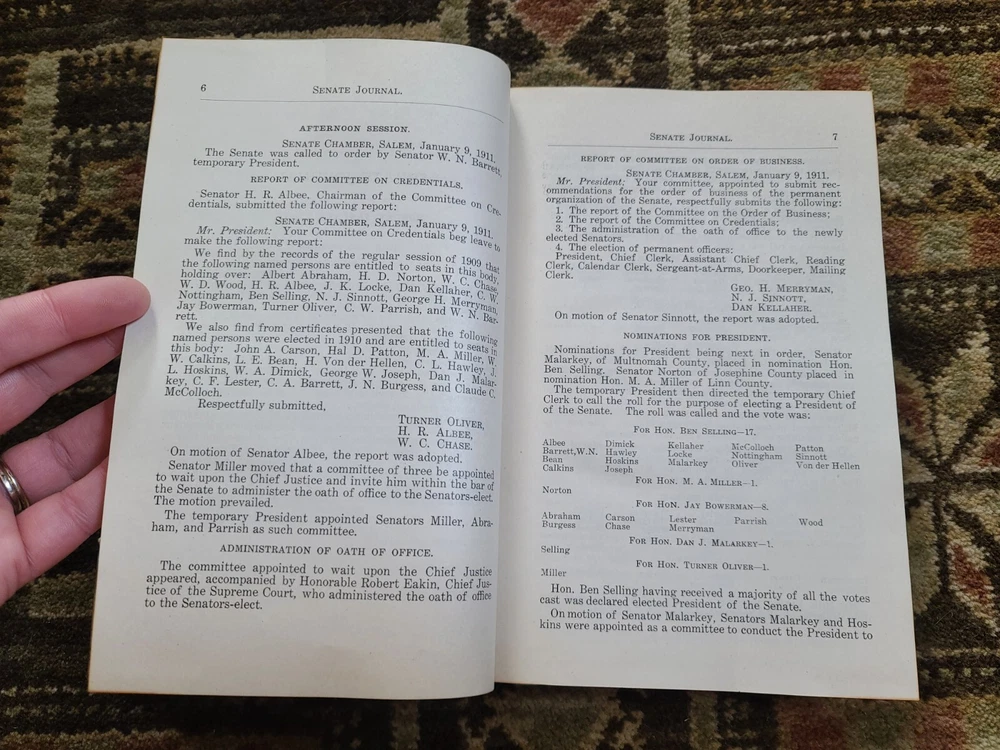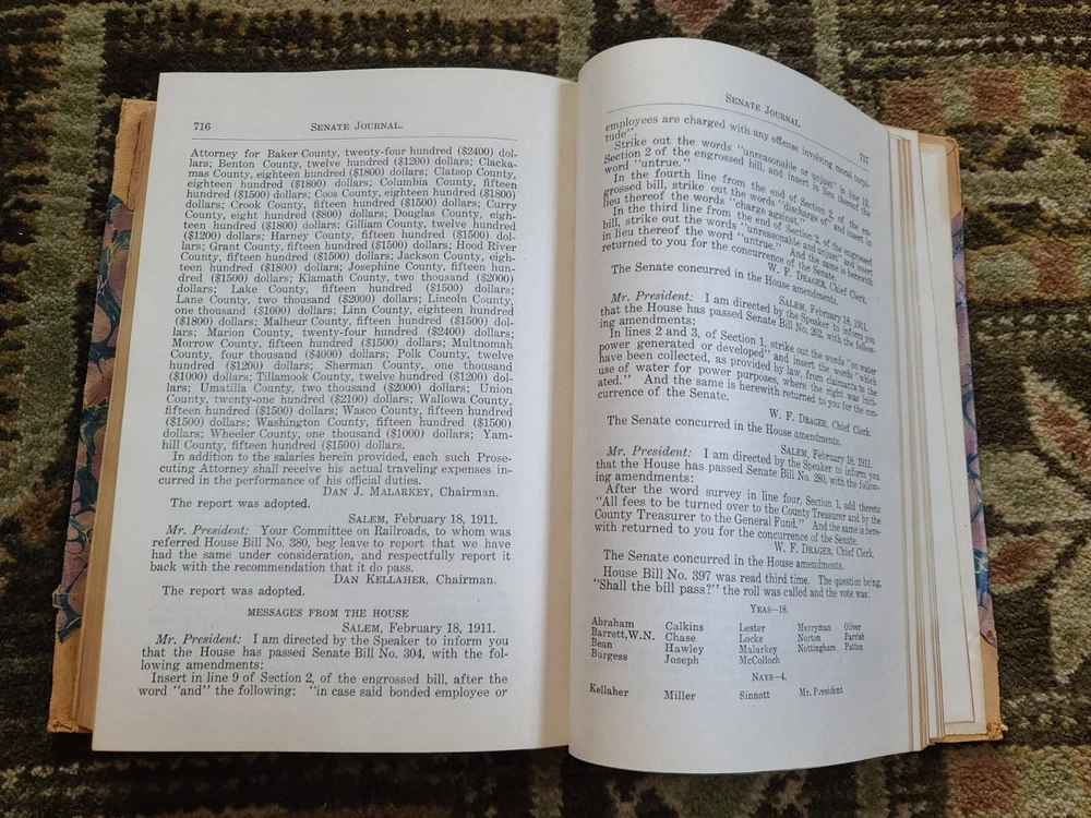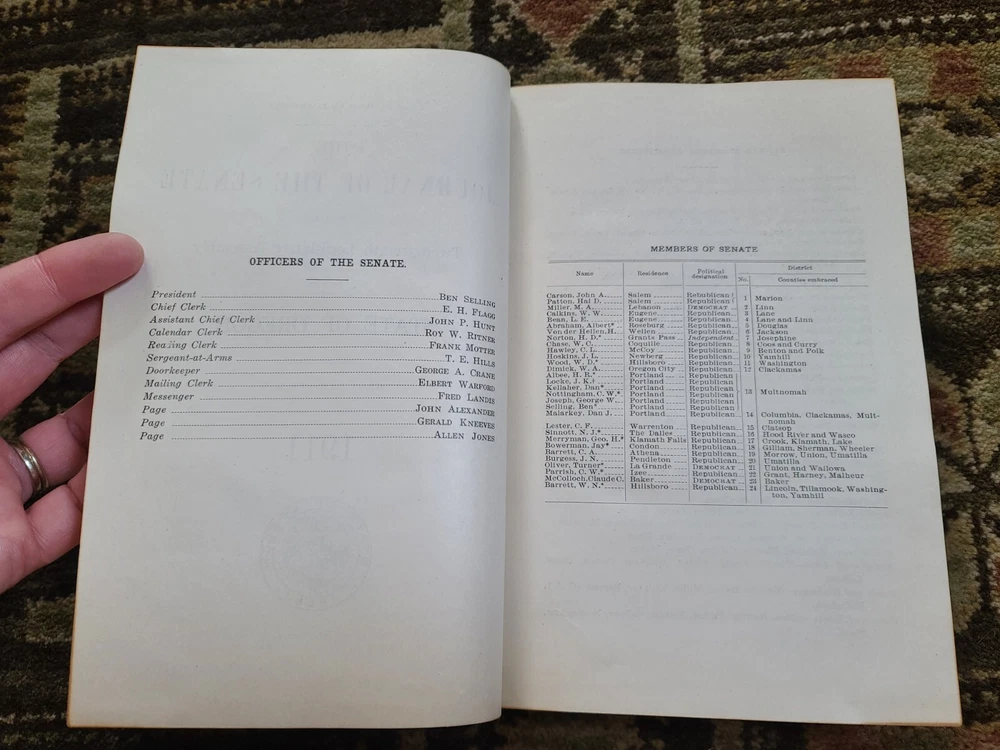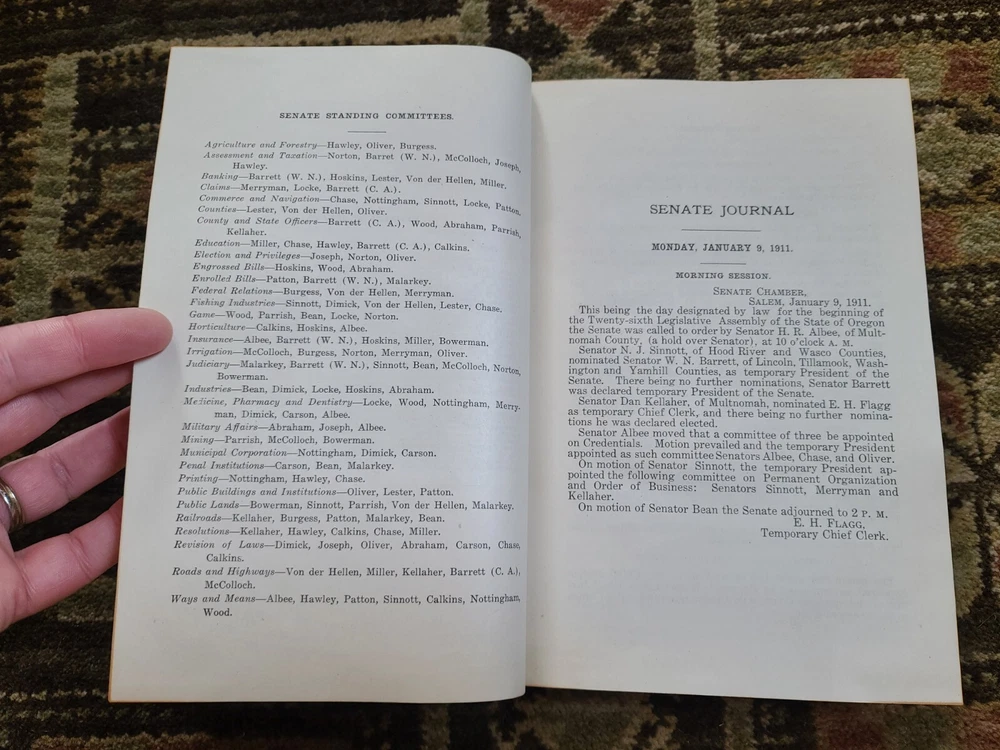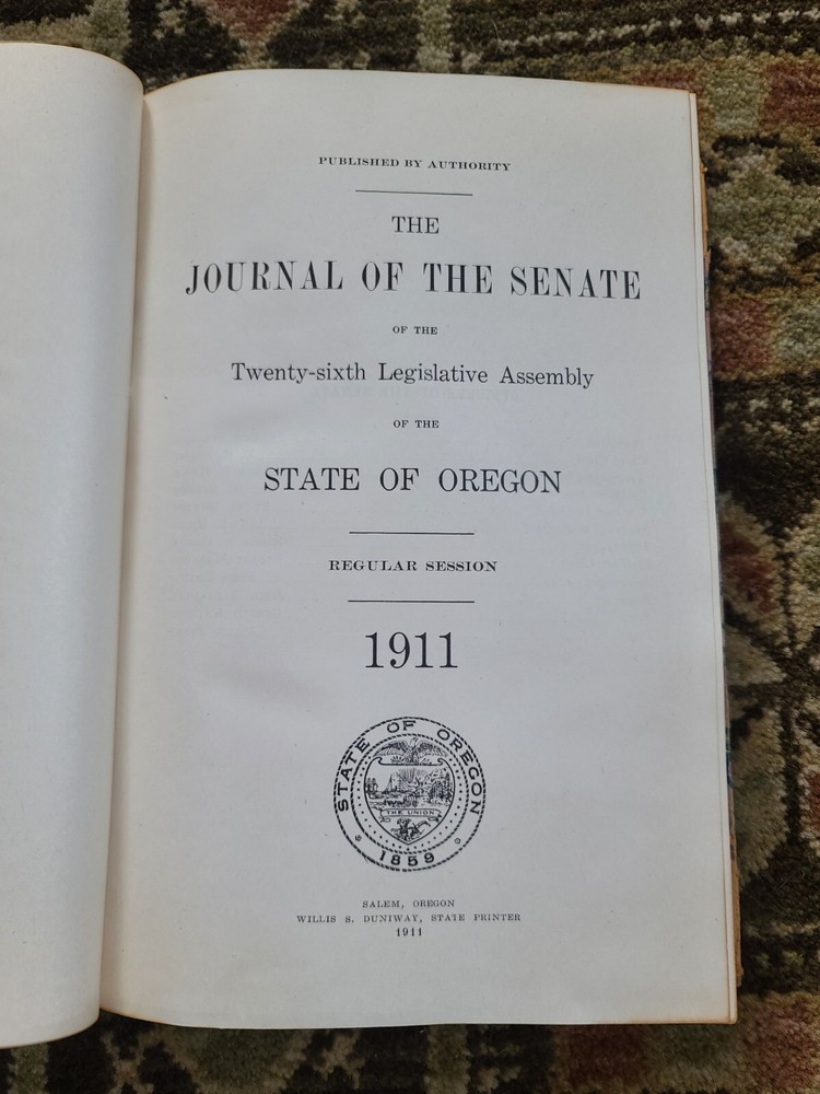 Antique SENATE JOURNAL Legislative Assembly STATE OF OREGON 1911 Book. Very neat old book! In ok used condition for its age. Moderate wear, yellowing, some frayed edges of pages, and damage to leather spine. The leather binding on the spine is totally gone (see pics). There's some writing on the 1st page. Measures approximately 6-1/4 x 8-3/4 x 1-1/4". Please see all pics for details and message with any questions. Thanks for looking!