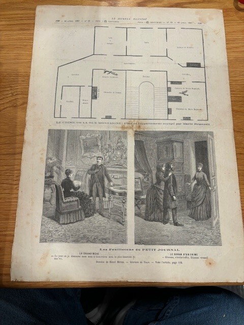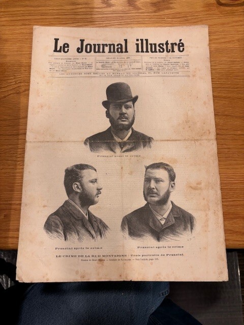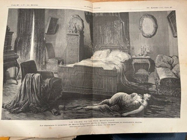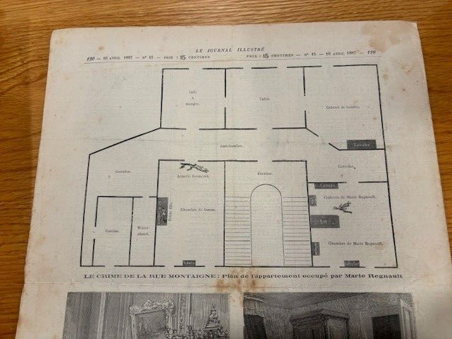 A RARE and ORIGINAL copy of this publication that has great content regarding a triple murder, and the suspect. This was a very well known crime... and to some extent, still is. There is a fair amount of information regarding the crime to be found on the internet. A good source of general information comes from an internet piece, "The Killer and the Saint: Pranzini and Therese" An excerpt from that piece follows: Paris: March 17th A triple murder was discovered this morning in the Rue Montaigne. A courtesan named Monty, or Regnault, lay dead at the foot of her bed, with two gashes on her throat, while her servant-maid and her daughter, a girl of 12, had been murdered in their bed. The supposed murderer is a man who mounted the stair just as the concierge was putting out the gas. He had vainly attempted to force a safe containing jewels worth 200,000f., and is presumed to have taken the money from the victim’s pocket. She was about 30 years of age. There are no traces of any struggle, but the occupants of the flat below heard a slight noise at 10 o’clock this morning. The concierge appears to have been accustomed to pull the checkstring about sunrise to let out the woman’s visitors. On August 31, 1887, Pranzini was executed after being found guilty of the crime. He was beheaded. Prior to 1880, engravings were the way images were conveyed to people. this paper has the images of the murderer, a part of the crime scene, and the apartment layout. The paper is in very good condition, and will be placed in a hard mailer to make sure that you get what you see. NEAT PIECE! Please contact me with any questions at all.