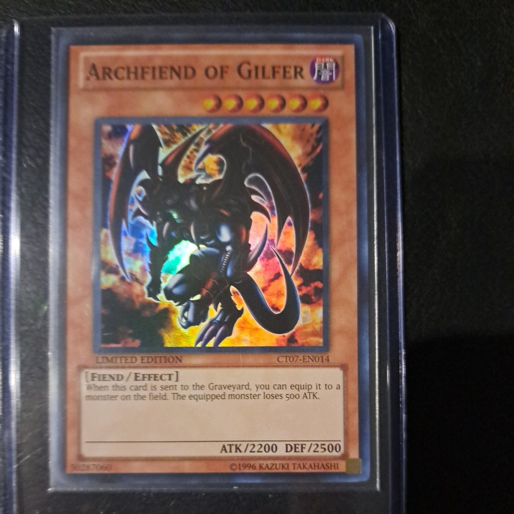 Delve into the world of Yu-Gi-Oh! TCG with the formidable Archfiend of Gilfer, a Super Rare card from the 2010 Collector’s Tins. This limited edition creature of pure darkness brings a blend of strategic advantage and raw power to the battlefield with its high attack and defence capabilities. The card, numbered CT07-EN014, is a must-have for any collector or player seeking to bolster their deck with an Effect-type Fiend. Crafted from premium card stock and presented in English, the Archfiend of Gilfer stands out with its unique attributes, including a strike power of 2200 and a defence toughness of 2500. It's a non-autographed card that maintains the allure and integrity of its original release. Enhance your game and collection with this exceptional piece from the 2010 Collectors Tins.