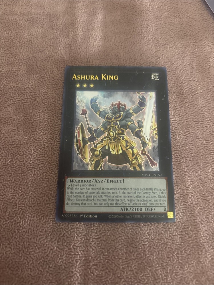 The Ashura King MP24-EN159 25th Anniversary Tin: Dueling Mirrors 1st Edition card is an ultra rare Yu-Gi-Oh! TCG card manufactured by Konami. This English-language card features an Earth attribute, Warrior creature type, and has an impressive 2100 attack power. As part of the 25th Anniversary Tin set, this Xyz and Effect card is a valuable addition to any collector's deck, especially for fans of Warrior-type monsters. With its unique features and rarity, this first edition card is sure to be a sought-after item for enthusiasts of the game.