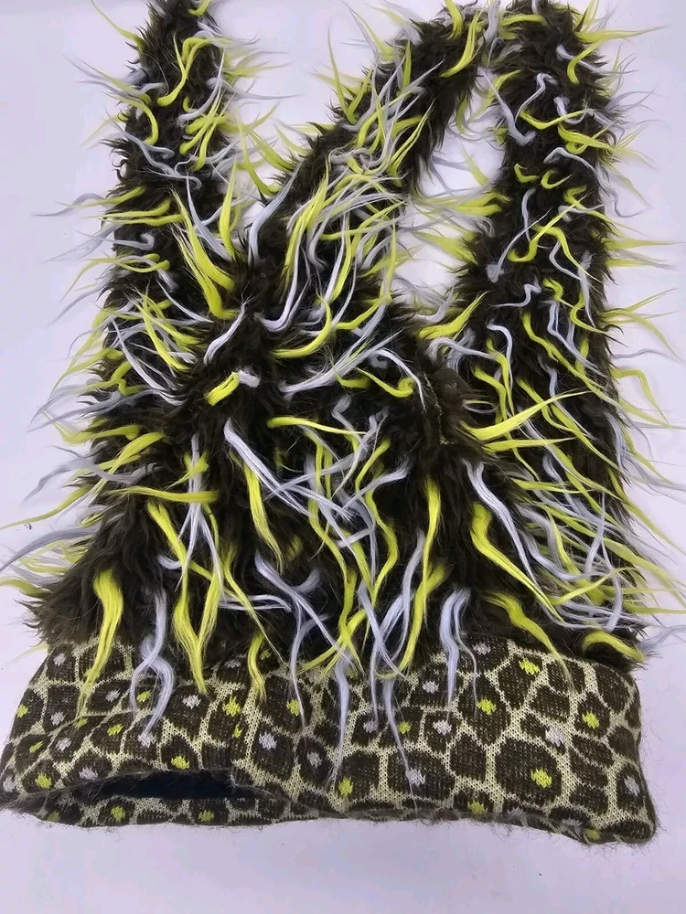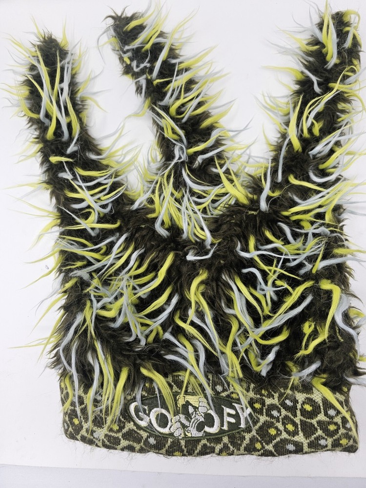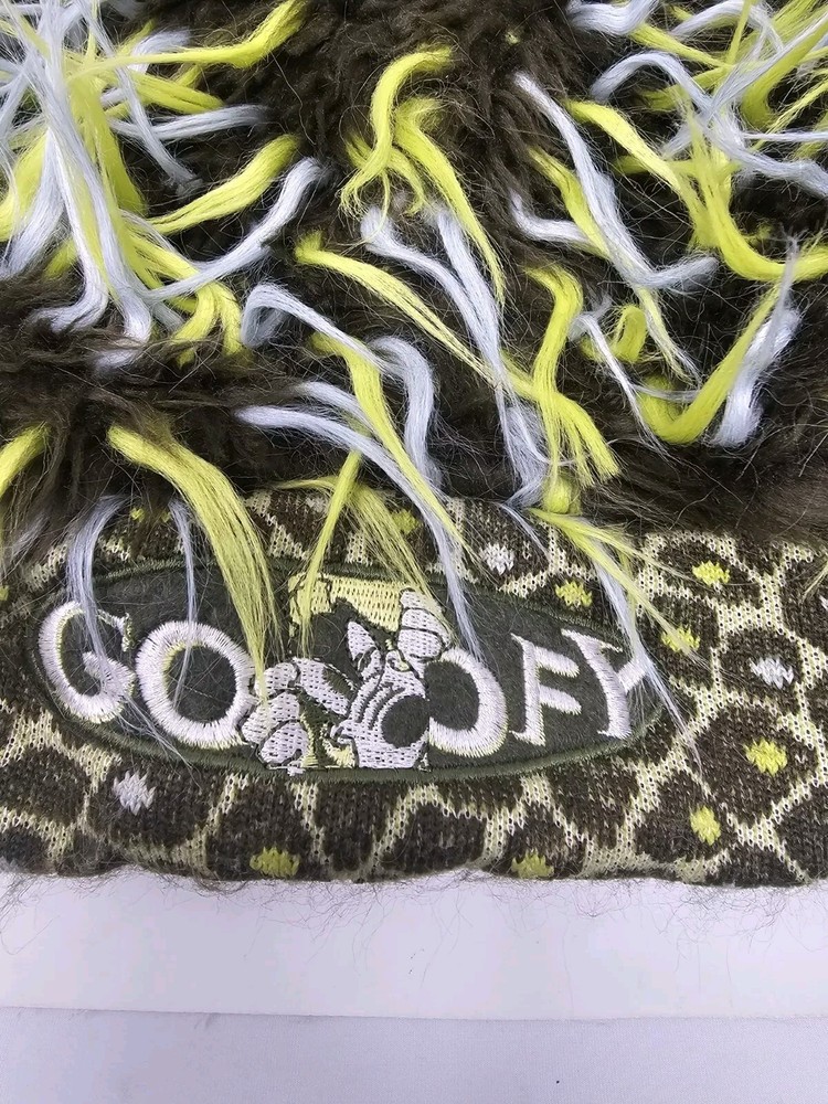 This is an authentic Disneyland Resort hat featuring Goofy from the Disney franchise. The hat is multicolored and designed to be fun and crazy with a fuzzy texture. It is suitable for both men and women, making it a unisex accessory. This rare item is a collectible piece of Disneyana that would appeal to fans of contemporary Disney merchandise.