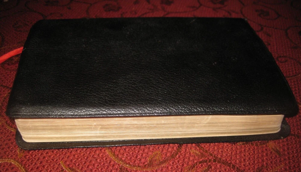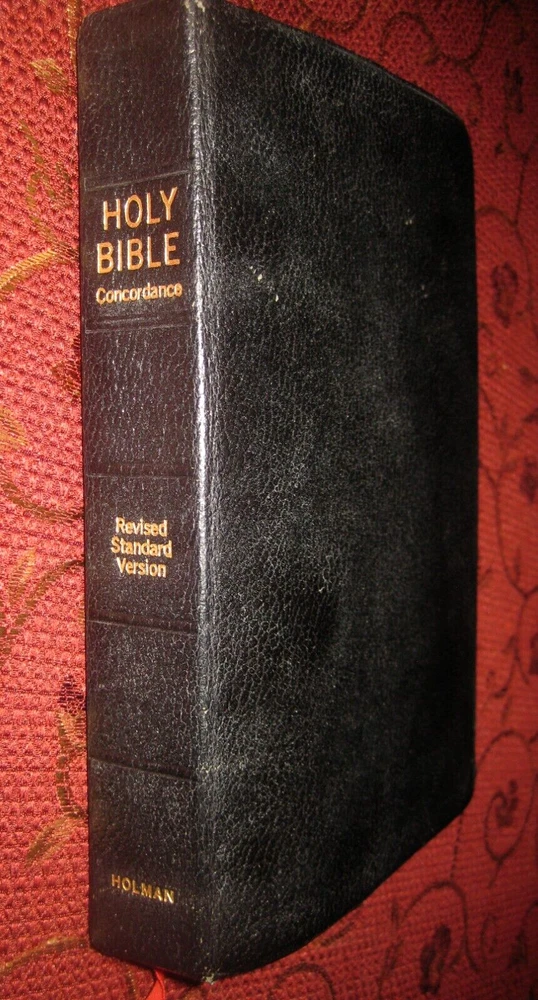 Being offered for your consideration is a Black - Genuine Leather copy of the "HOLY BIBLE - Revised Standard Version", Verse Reference Edition. Typed Key Scripture Notes tapes in the back. (photo 12) Red marks on (2) pages from the ribbon book mark. Light edge wear along the spine. No writing found. (Writing, highlighting and underlining are possible as this is a used item.) The pictures show the actual Bible that is being sold. Additional Information Published by Holman Copyright - 1962 Verse Reference Jewel Edition Pages - 1168 + Concordance Concordance One Red Ribbon Book Mark Gold Gilt Edge Paper (scuffs as pictured) 8-1/2 in. tall x 5-1/2 in. wide x 1-1/8 in. thick Smoke-free environment. Ships next business day Media Mail, Monday - Friday. Insurance available upon request for an additional charge. International shipping and paym ents are not available . Please e-mail any questions before bidding as this item is Not returnable. Once you receive an invoice from eBay, please post payment within (2) days or item is subject to being relisted. Thank you and we look forward to doing business with you.