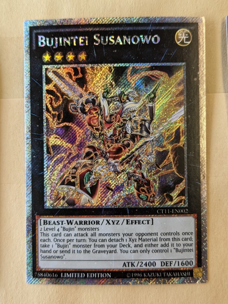 You are bidding on a YUGIOH-BUJINTEI SUSANOWO-LIMITED EDITION PLATINUM SECRET RARE-CT11-EN002 This card is not graded but in good condition. The front and back surfaces have slight scratches seen from certain angles. You get the card shown in the pictures. I will ship your card in a top loader, bubble wrap then cardboard mailer. I will combine shipping. My shipping price is $2.99 for up to 9 regular thickness cards and $3.99 and up for anything over 10 cards. Payment must be made within 3 days of purchase. I will ship 2 business days after receiving payment. I don't ship on Saturday or Sundays. To ALL my customers, please be patient as the mail has slowed down due to the VIRUS. THANK YOU for your patience and understanding. Be safe!! There is a delay at customs, my US customers, please note it could take up to 60 days to receive your cards. If you have any questions, please don't hesitate to contact me. Please check out my other items at Jethro's cards and collectibles. Have a great day, cheers!