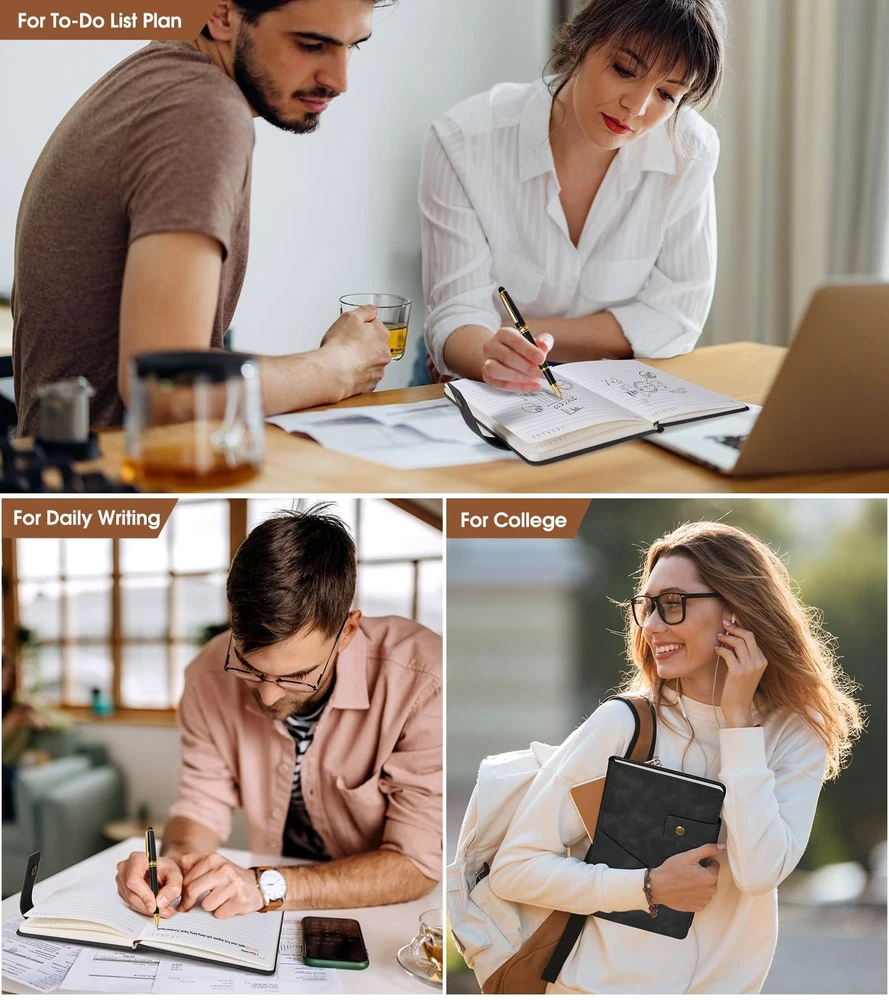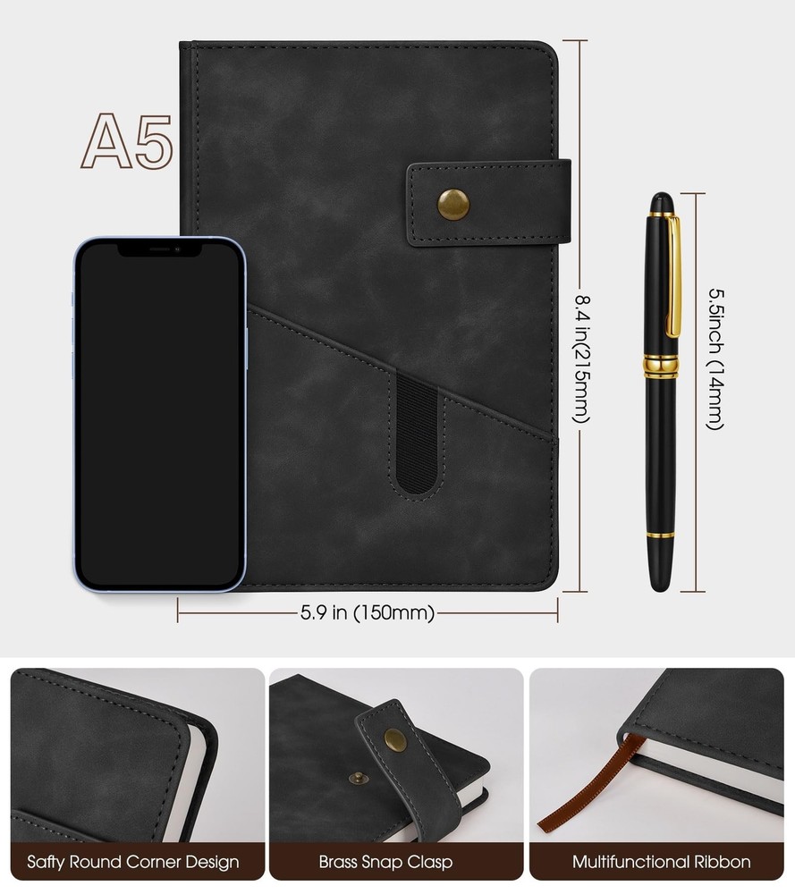 Black A5 Lined Leather Journal Notebook for Men Women,5.9" X 8.4" Personalized Hardcover Journal with Pen,200 Pages 100 Gsm Thick Ruled Paper Daily Diary for School,Travel,Work,Writing Product Details Color: Black Size: A5 Brand: vfaejll MPN: vfaejll155881 UPC: Does not apply EAN: Does not apply Brand: vfaejll Color: Black Theme: Book Sheet Size: A5 Pages: 200 Pages Cover Material: Faux Leather Style: minimalist Ruling Type: Ruled Special Feature: Hard Cover Product Dimensions: 8.2"L x 5.7"W x 0.78"Th Manufacturer: vfaejll Brand: vfaejll Item Weight: 13.7 ounces Product Dimensions: 8.2 x 5.5 x 0.78 inches Item model number: vfaejll155881 Color: Black Cover Material: Faux Leather Number of Items: 1 Size: A5 Ruling: Ruled Sheet Size: A5 Manufacturer Part Number: vfaejll155881 Date First Available: October 14, 2021 VALUE OF MONEY HARDCOVER JOURNAL SET: Classic grey ruled notebook, journals are elegant, quality crafted books available at a surprisingly competive price and quality. A huge choice for everyday use, provides plenty of space for notes, lists, musings, and more. And each notebook will give away a luxury pen, this is one of our best journal pens gifts. PREMIUM THICK PAPER:5.9 X 8.4 inch journal notebook with 200 pages 100 gsm lined paper, thicker 30% than normal, this black notebook is designed to avoid feathering and the paper is ink-proof, suit for most pens, but the wettest pen inks. Archival-quality pages made from acid-free paper-resists damage from light and air, the cream paper is easy on eyes.Let your creation more freedom on the wide ruled journal to write in. SOFT FAUX LEATHER JOURNAL NOTEBOOK:This elegant Journal notebook has suede hardcover but feel soft in hand, just like a baby's skin. Fashion but reliable cover adapts to the movements of body without damage. The notebook's hard cover protects the pages inside and doubles as a convenient writing surface. Great gift for any. GUSSETED DESIGN:Gusseted pocket design and cardboard bound cover,metal buckle helps keep notebook securely closed, making it easy to write in the notebook from just about anywhere. This notebook provide you a high quality writing experience. Expandable gusseted pocket for stashing loose notes, business cards, receipts, mobile phone, or other small items. GREAT USE & PERFECT JOURNAL GIFTS:Ideal for all office, school and home use,including for taking notes and keeping work in order,as a diary or journal for brainstorming ideas, creative writing or just doodling and drawing to your hearts content.This personalized journal notebook is a great birthday, mothers day, fathers day, children's day, graduation, christmas journal gifts. It is an ideal gift for mom,dad, teachers, wife, husband, friends, daughters, sons and granddaughter.