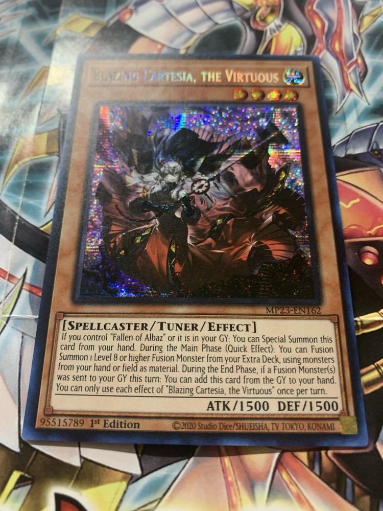 The Blazing Cartesia, the Virtuous MP23-EN162 25th Anniversary Tin: Dueling card is a highly sought after collectible in the Yu-Gi-Oh! TCG world. This card, from the Dueling Heroes Mega Pack set, features a spellcaster creature with a high defense and attack power of 1500, making it a powerful and versatile addition to any deck. As a prismatic secret rare card with an English language 1st edition print, it is a valuable and unique addition to any collector's arsenal.
