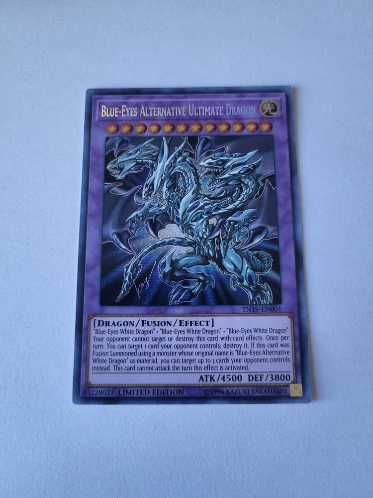 Unleash the power of legends with the Blue-Eyes Alternative Ultimate Dragon from the 2019 Gold Sarcophagus Tin. This card, numbered TN19-EN001, boasts an impressive 4500 attack power and 3800 defense toughness, making it a formidable force in your Yu-Gi-Oh! TCG arsenal. Its prismatic secret rare status ensures it stands out in any collection, and with its limited edition tag, owning this card is a special achievement for any duelist.Featuring the iconic Blue-Eyes Alternative dragon in stunning detail, this Effect and Fusion type card is a must-have for fans of strategic gameplay and collectors alike. Produced by Konami and presented in English, this card is a fusion of might and nostalgia, ready to elevate your game to new heights.