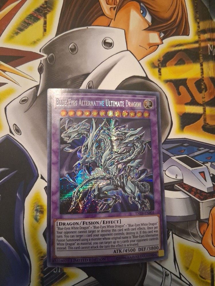 The Blue-Eyes Alternative Ultimate Dragon card is a highly sought after collectible within the Yu-Gi-Oh! trading card game community. Manufactured by Konami, this card is part of the TN19 set released in the Gold Sarcophagus Tin Promos. As a Prismatic Secret Rare, it carries a special rarity that makes it a valuable addition to any collector's deck. With its unique design and powerful abilities, this card is a must-have for fans of the game looking to enhance their gameplay experience.