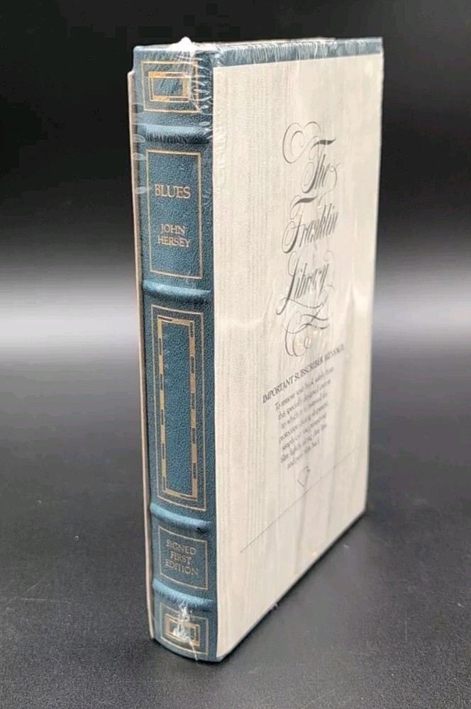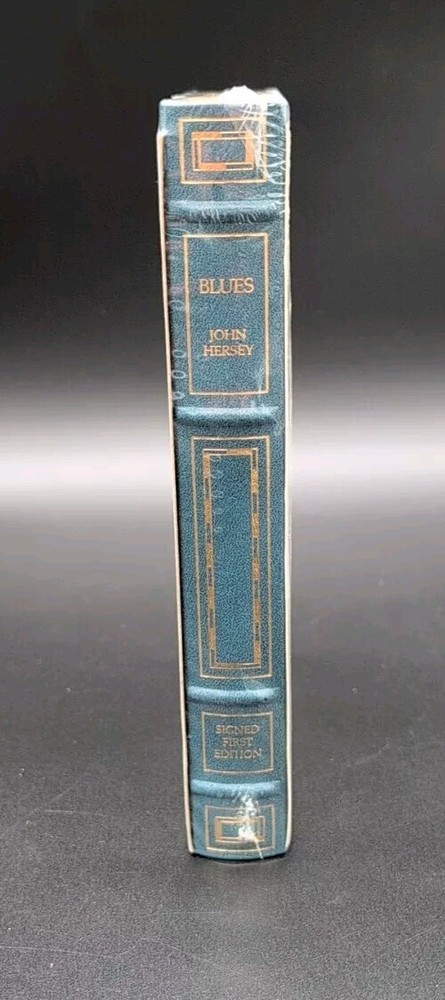 The product is a signed first edition of John Hersey's "Blues" from 1987, published by Franklin Library. This vintage hardcover book features a leather-bound cover with a dust jacket and a silk ribbon book mark, making it a special collector's item for fans of the author and the literary movement. The narrative explores themes of fishing and nature, making it an interesting read for adults with a taste for naturalism in literature. With its unique features and historical significance, this book would be a valuable addition to any book collection.