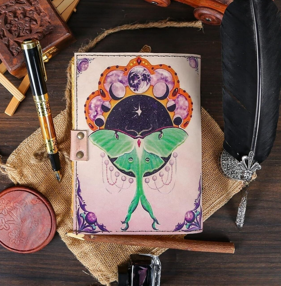 Luna Moth Printed Vintage Leather Journal - Capturing Nature's Elegance Perfect Leather Diary for men and women Introducing the Luna Moth Printed Vintage Leather Journal, a captivating and enchanting companion for your thoughts and musings. Immerse yourself in the allure of its 200 pages of Antique Paper, carefully crafted to resemble a relic from centuries past. Each page tells a story, with its distinctive handmade cotton paper that adds an extra layer of uniqueness to this vintage journal notebook. Bring out your inner creativity with the Antique Leather Writing Journal for Women and Men Luna Moth Print Stunning Luna Moth artwork printed on the cover, inspired by the elegance of nature. Each print is unique, adding a touch of individuality to every journal. Handmade with care using genuine vintage leather for a timeless and rustic appearance. Intricate stitching by skilled artisans enhances the journal's durability. 200-Page Deckle Edge Paper - A Canvas for Endless Creativity Embark on a journey of creative expression with our 200-Page Deckle Edge Vintage Leather Journal. Revel in the exquisite blend of vintage charm and artistic allure as you explore 200 pages of meticulously crafted deckle edge paper, providing you with an expansive canvas for your thoughts, sketches, and memories. A generous 200 pages of high-quality deckle edge paper. Each page is a unique work of art with its irregular edges, adding character to your creations. Swing Lock Clasp - Secure Your Memories in Style Unique swing lock clasp for a secure and stylish closure. Adds a vintage touch reminiscent of classic diaries and cherished keepsakes. Sturdy Binding - Where Durability Meets Elegance Robust binding ensures the journal withstands the test of time. Each page stays securely in place, providing a reliable canvas for your musings.