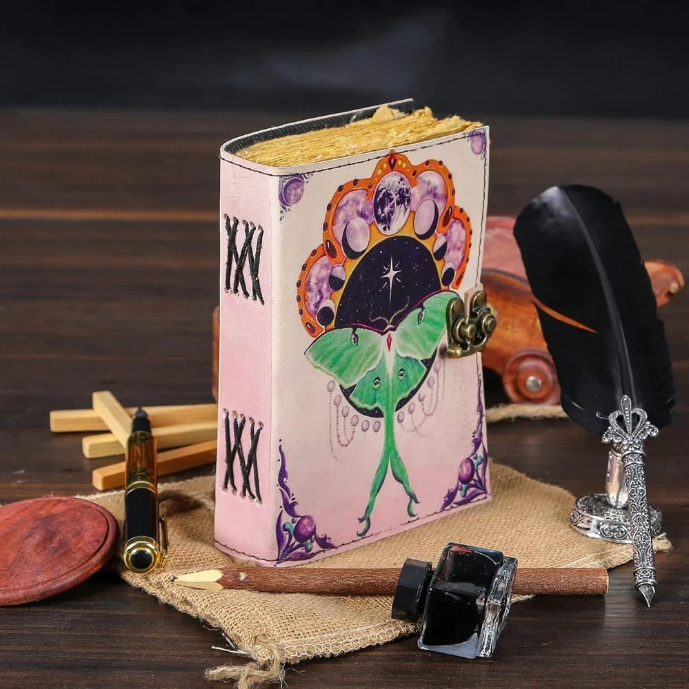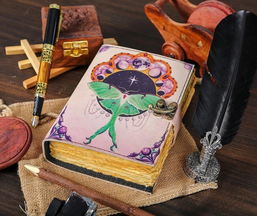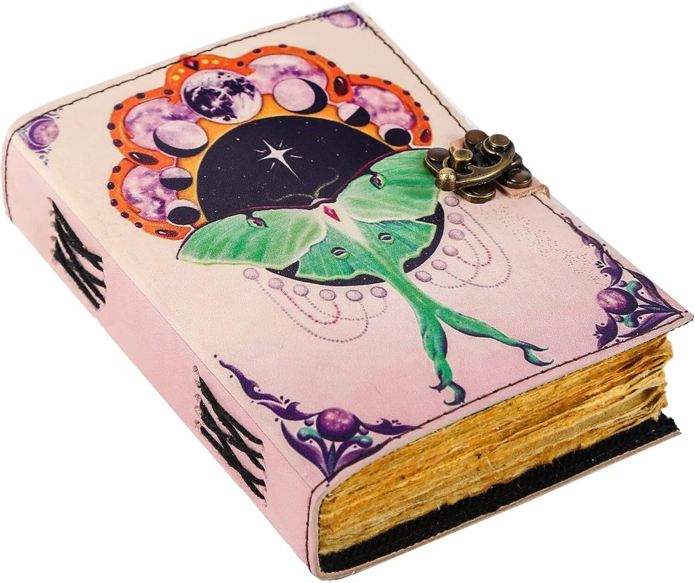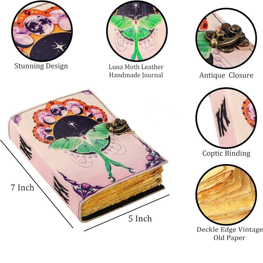 Luna Moth Printed Vintage Leather Journal - Capturing Nature's Elegance Perfect Leather Diary for men and women Introducing the Luna Moth Printed Vintage Leather Journal, a captivating and enchanting companion for your thoughts and musings. Immerse yourself in the allure of its 200 pages of Antique Paper, carefully crafted to resemble a relic from centuries past. Each page tells a story, with its distinctive handmade cotton paper that adds an extra layer of uniqueness to this vintage journal notebook. Bring out your inner creativity with the Antique Leather Writing Journal for Women and Men Luna Moth Print Stunning Luna Moth artwork printed on the cover, inspired by the elegance of nature. Each print is unique, adding a touch of individuality to every journal. Handmade with care using genuine vintage leather for a timeless and rustic appearance. Intricate stitching by skilled artisans enhances the journal's durability. 200-Page Deckle Edge Paper - A Canvas for Endless Creativity Embark on a journey of creative expression with our 200-Page Deckle Edge Vintage Leather Journal. Revel in the exquisite blend of vintage charm and artistic allure as you explore 200 pages of meticulously crafted deckle edge paper, providing you with an expansive canvas for your thoughts, sketches, and memories. A generous 200 pages of high-quality deckle edge paper. Each page is a unique work of art with its irregular edges, adding character to your creations. Swing Lock Clasp - Secure Your Memories in Style Unique swing lock clasp for a secure and stylish closure. Adds a vintage touch reminiscent of classic diaries and cherished keepsakes. Sturdy Binding - Where Durability Meets Elegance Robust binding ensures the journal withstands the test of time. Each page stays securely in place, providing a reliable canvas for your musings.