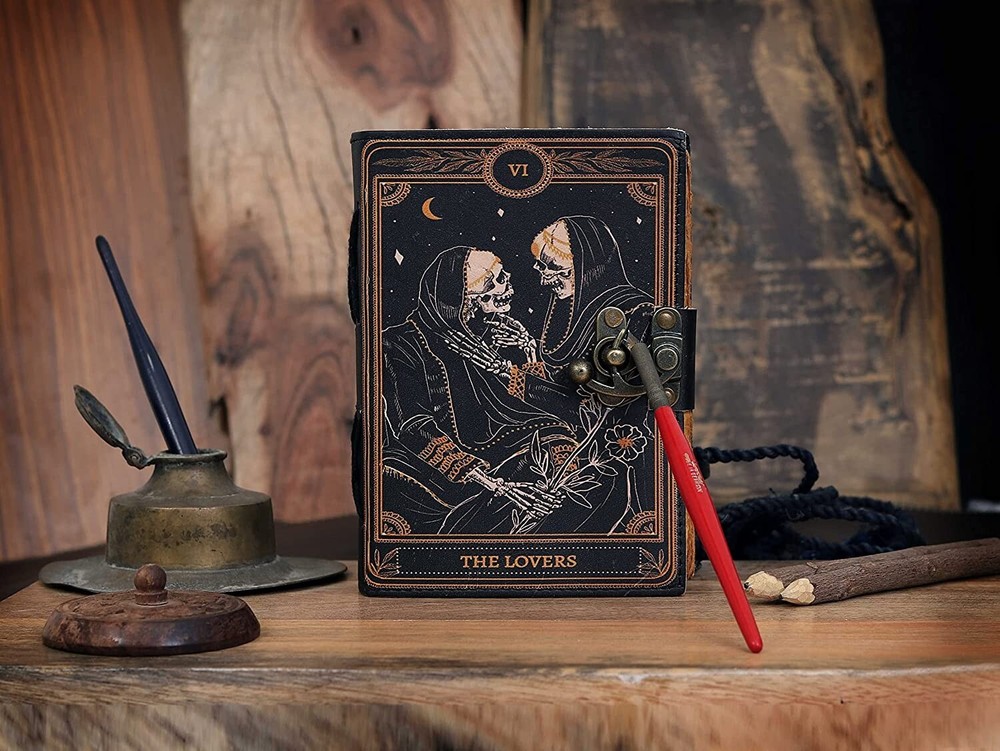 BEAUTIFULLY CRAFTED: Our handmade artisan leather-bound spellbook grimoire journals are crafted from genuine leather. The black coloring gives it a beautiful antique vintage feel. Being hand-made from natural leather. The cover features a beautiful gold designing.. USE ANY KIND OF PEN - Size: 5"X7" This Gothic gifts Sketch, Doodle, Write on your Book with a Calligraphy Pen Fountain Pen, Brush Pen, Ball Pen, Acrylic Colours, Watercolor and many more. We guarantee no bleed through. SIZE - 5X7 Inch. VINTAGE LOCK AND STURDY BINDING - The vintage clasp lock will keep all your valuable writing locked inside. Sturdy hand stitched binding to make sure that no paper comes out loose from your Spell BOOK. MANY USES - This aesthetic Lovers Journal Can be used as a Hocus Pocus gifts , the lovers tarot journal, gothic notebook, skull journal, spell books Halloween decorations, book of spells Halloween décor. grimoire spell book, drawing or sketching and compact for carrying in your bag. Ideal for alternative Artist Sketchbooks, Photo Album, Traveling Notes, Business Executive, Logbook, hocus pocus spell book , Journalists, Food Planner, old spell notebook, antique handmade skull journal