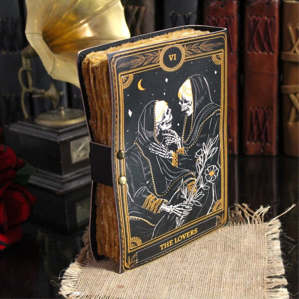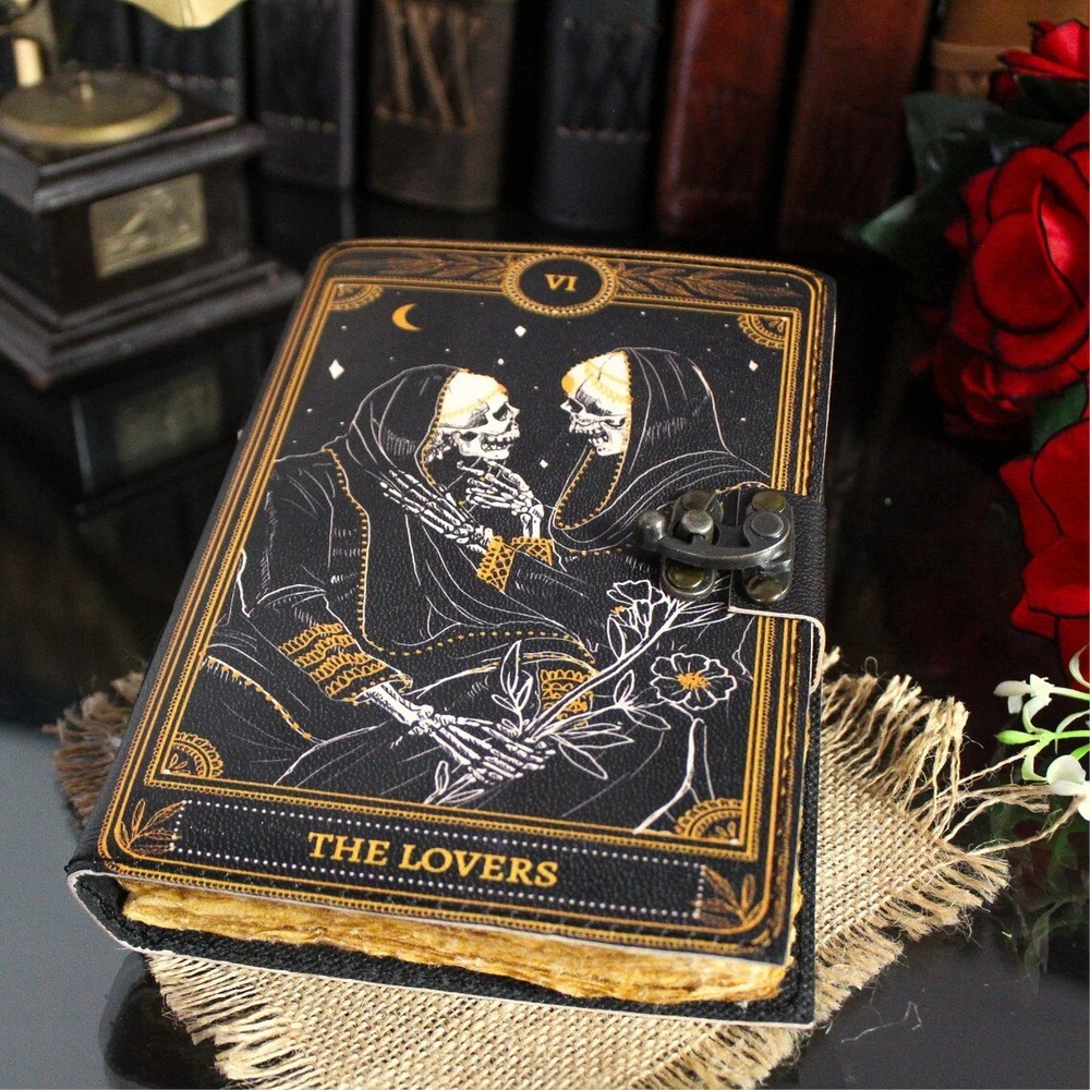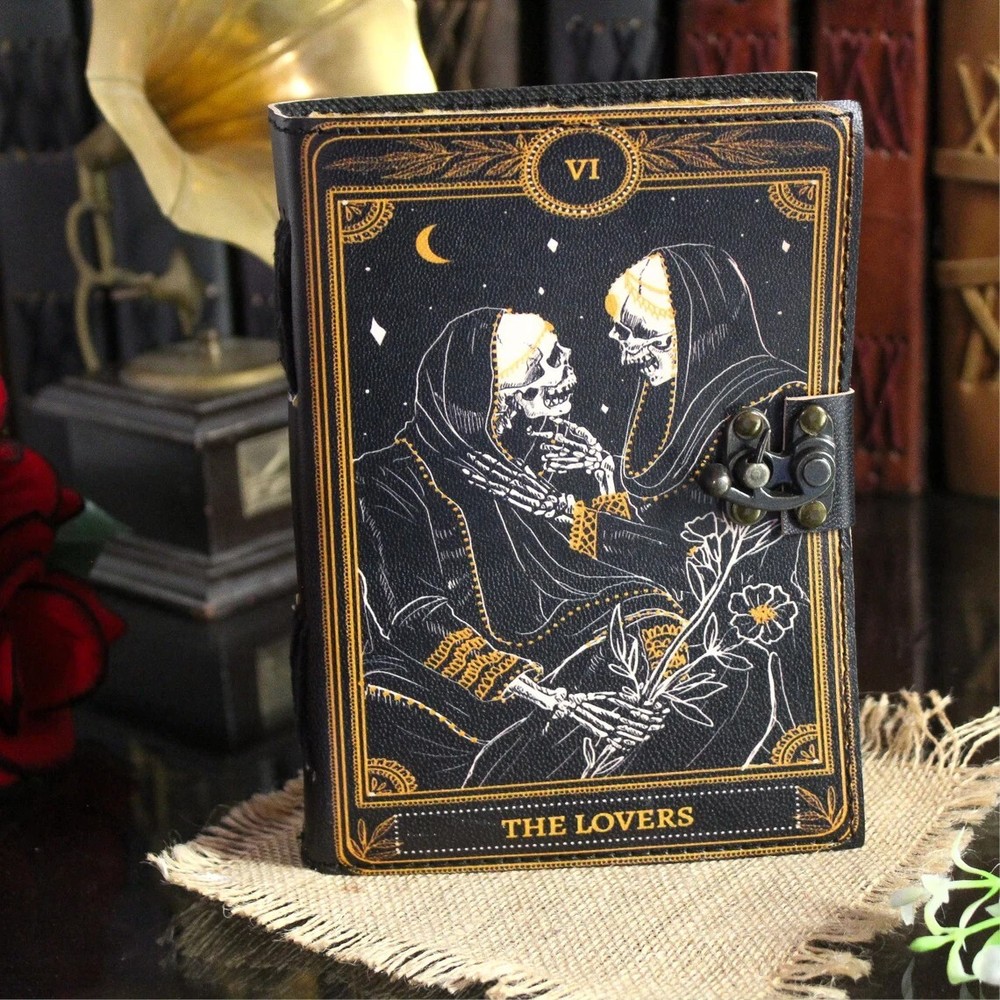 BEAUTIFULLY CRAFTED: Our handmade artisan leatherbound spellbook grimoire journals are crafted from genuine leather. The black colouring gives it a beautiful antique vintage feel. Being hand-made from natural leather. The cover features a beautiful gold designing. VINTAGE LOCK AND STURDY BINDING - The vintage clasp lock will keep all your valuable writing locked inside. Sturdy hand stitched binding to make sure that no paper comes out loose from your Spell BOOK. PERFECT FOR GIVING: Suitable for both men or women to write in, this locking diary daily travelers notebook is perfect for an avid writer, or Harry Potter fan looking for a magic spell book. Ideal to give as a birthday gift, valentines, halloween, graduation or wedding anniversary present. Spell Book Tarot Journal Merchandise Popsocket Grimoire Wiccan Witch Prop Spells Decor Skull Lovers Blank Notebook Gift Props Spellbook Blanks With Clasp Coloring Books For Men Women Adult and you can keep this journal at your bedside as like memory of your loved ones. USE ANY KIND OF PEN - Size: 6"X8" This Gothic gifts Sketch, Doodle, Write on your Book with a Calligraphy Pen Fountain Pen, Brush Pen, Ball Pen, Acrylic Colours, Watercolor and many more. We guarantee no bleed through. SIZE - 6X8 Inch. OUR PROMISE: We are positive you will love our products, but if you don't for any quality reason, we will replace or refund for up to 30 days after purchase. Our friendly customer service team are always available to answer any questions you might have. MANY USES - This aesthetic Lovers Journal Can be used as a Hocus Pocus gifts , the lovers tarot journal, gothic notebook, skull journal, spell books halloween decorations, book of spells halloween decor. grimoire spell book, drawing or sketching and compact for carrying in your bag. Ideal for alternative Artist Sketchbooks, Photo Album, Traveling Notes, Business Executive, Logbook, hocus pocus spell book , Journalists, Food Planner, old spell notebook, antique handmade skull journal