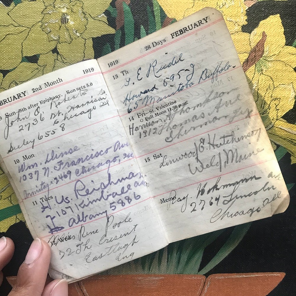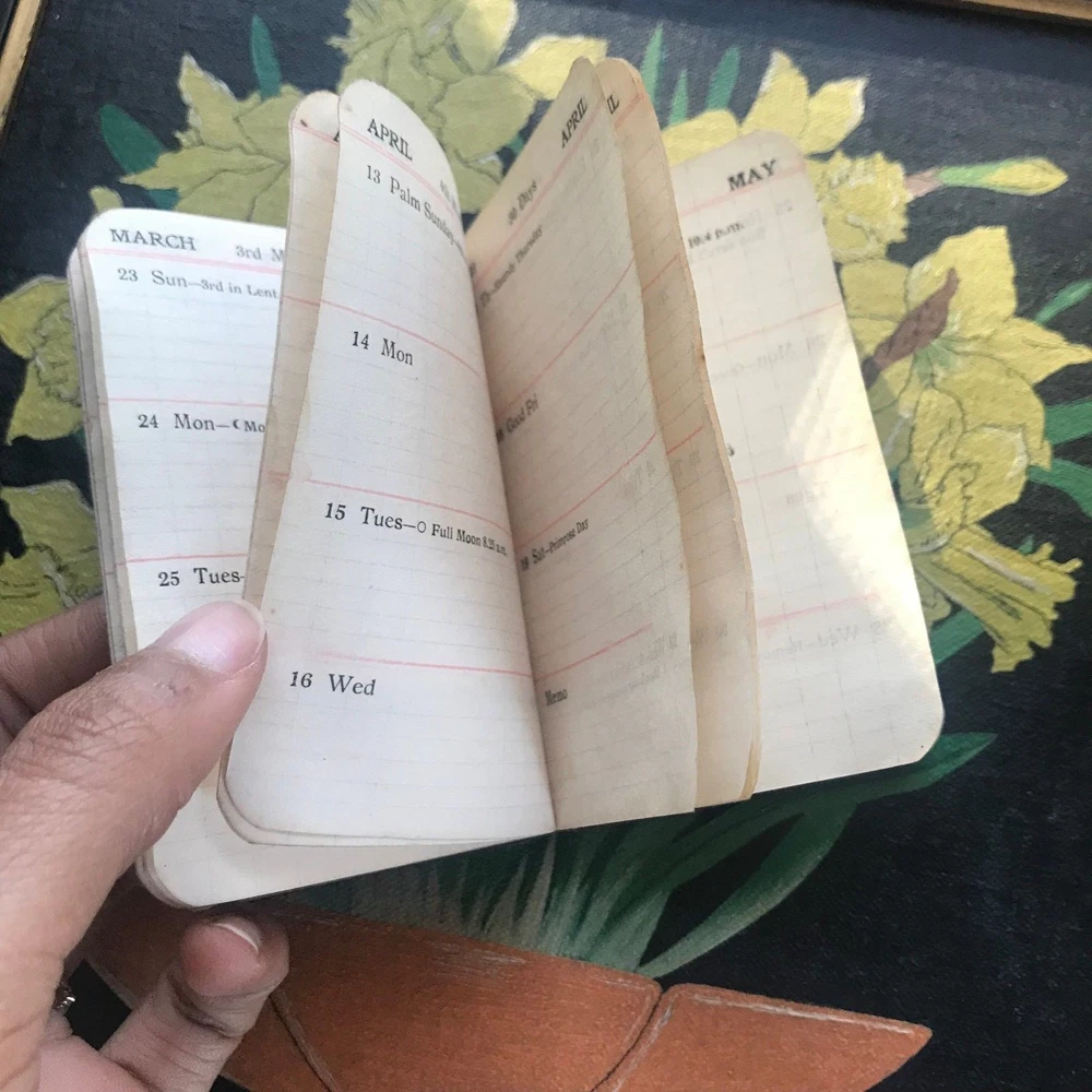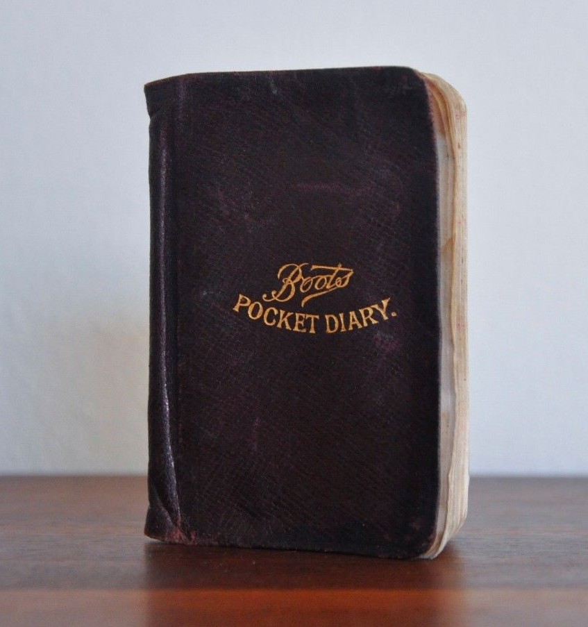 Brief History: “Boots” (also known as The Boots Chemists”) was originally an herbal medicine shop in Nottingham, England, founded in 1849 by John Boot. Boots diversified into the research and manufacturing of drugs during the 1960’s with its development of the Ibuprofen painkiller, invented by John Nicholson and Stewart Adams. The Boots pharmacy is still in business today, although under fire for accusations and concerns that the once family company dedicated to serving society, is now putting profit before the public and its safety. Details: This Boots pocket diary is from the year 1919 and was mainly used for addresses and random notes. Leather and binding are intact, although loose. Over half of the pages are blank. One page has been ripped out. Half of the front page has also been ripped out. This diary was found at a beautiful historic estate on the North Shore of Chicago. Addresses range from Chicago to Europe. Diary measures: 4" H x 2.5" W Please message us should you have any questions.
