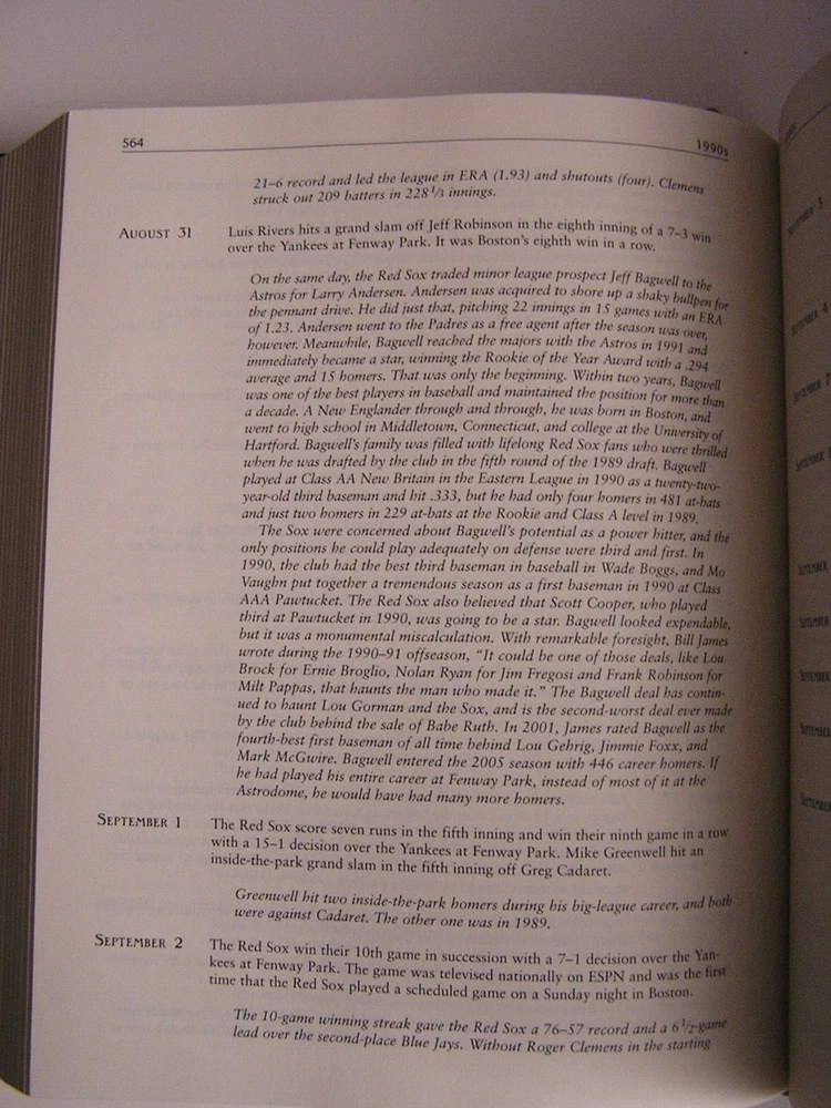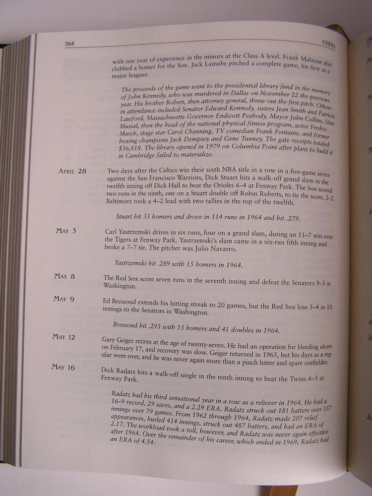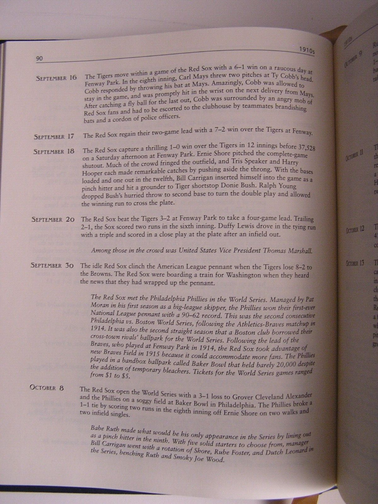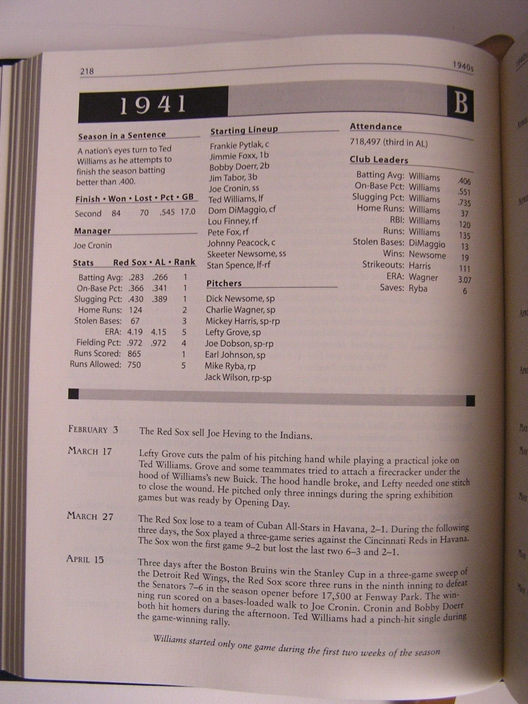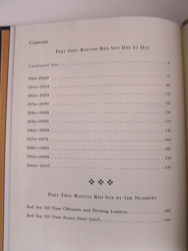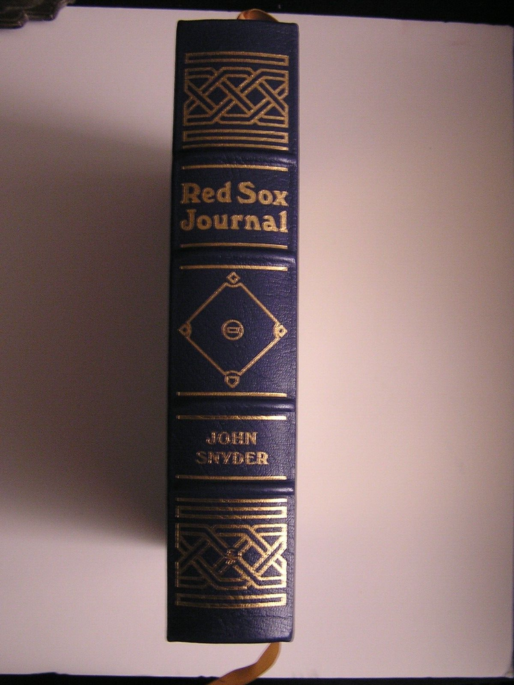 RED SOX JOURNAL Year by Year & Day by Day with the Boston Red Sox Since 1901 John Snyder Easton Press, 2006 Leather All edges gilt Raised spine bands Silk Moire endpapers Ribbon bookmark 8.25" X 10.25" 716 pages sparsely illustrated by b/w photos Content pages in photos above Condition: Straight, clean and tight. No ownership, no writing, no marks. Unused Easton Press bookplate is laid in. Gilt edges shows some light scuffs/scratches. Bubble wrapped and shipped in a box.