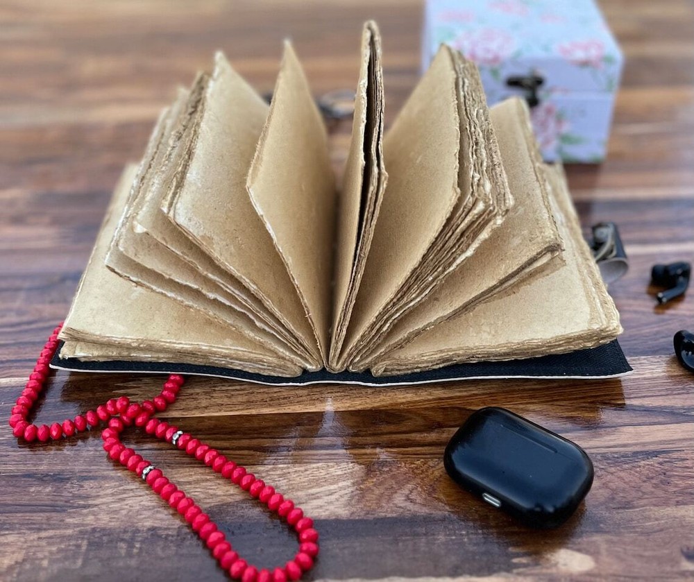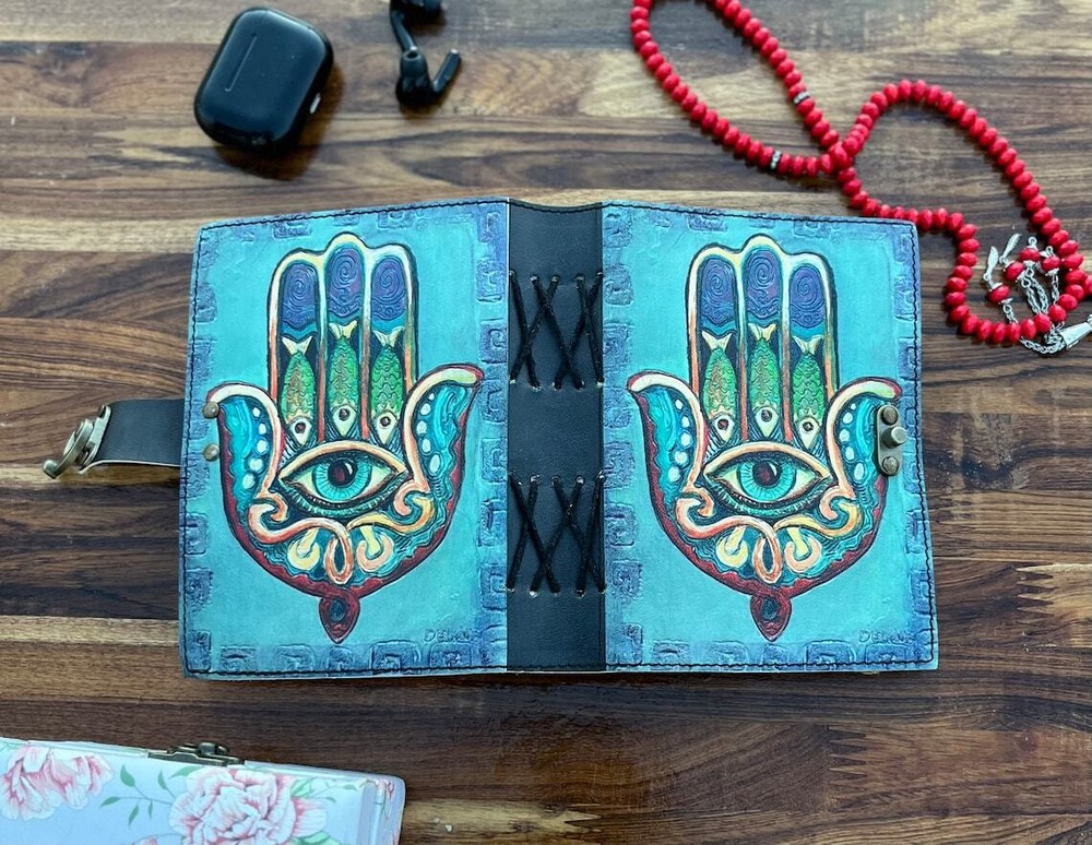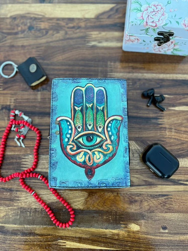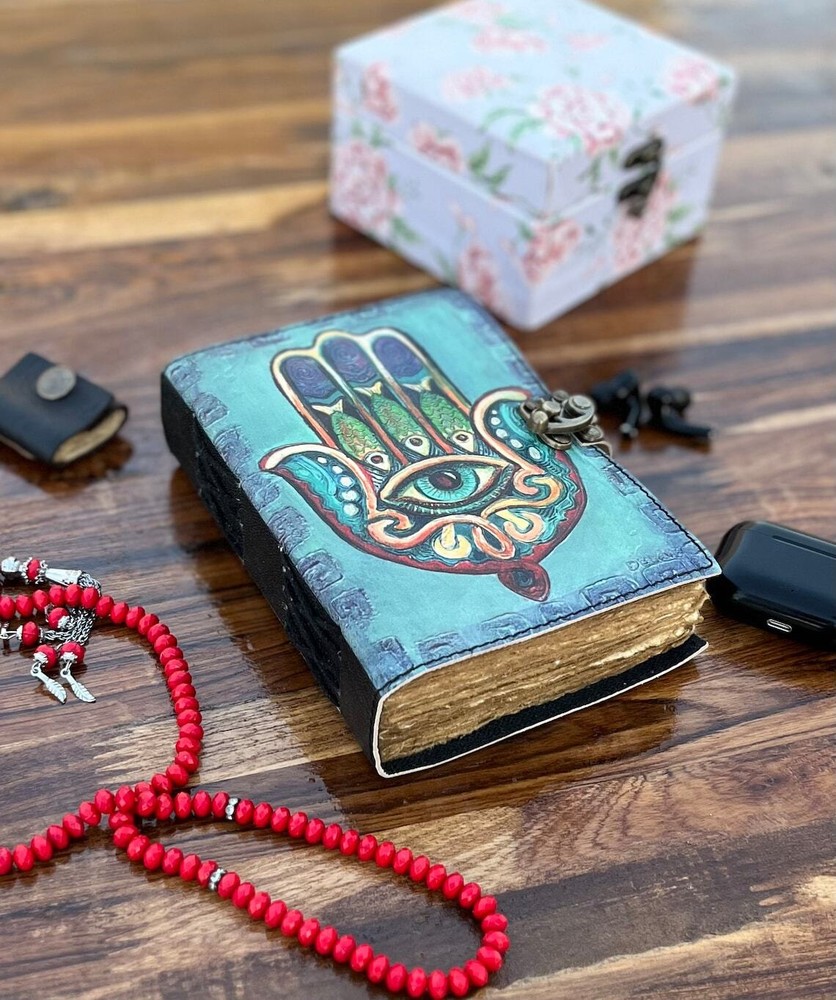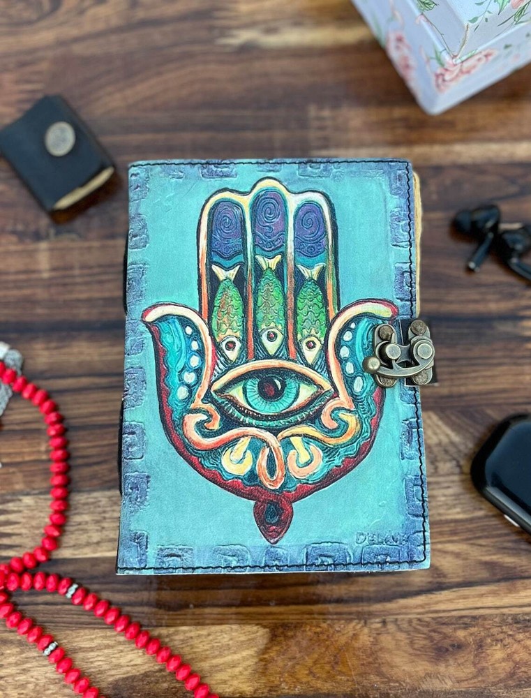 HAMSA LEATHER PRINTED DESIGN - Perfectly print with the Book of Shadows designs, this journal makes a thoughtful gift to anyone of different cultures. UNIQUE HANDMADE VINTAGE PAPER - V 11 Handicrafts. Vintage Journal is made with 200 pages of Antique Paper which looks like it was pulled from history. You will fall in love with the the antique handmade cotton paper which is unique to our Vintage Journal Notebook EXQUISITE & UNIQUE SEMI PRECIOUS STONE: The vintage journal is antique color embossed with a special stone called “lapis lazuli” which helps to reveal inner truth within yourself and encourage self-awareness and self expression. We have taken extra to make sure that the emboss is perfect in every piece. VINTAGE LOCK AND STURDY BINDING - The vintage lock will keep all your valuable writing locked inside.Sturdy hand stitched binding to make sure that no paper comes out loose from your vintage notebook. USE ANY KIND OF PEN - Sketch, Doodle, Write on your Leather Bound Journal with a Calligraphy Pen Fountain Pen, Brush Pen, Ball Pen, Acrylic Colours, Watercolor and many more. We guarantee no bleed through. MANY USES - Can be used as a notepad, journal, writing notebook, sketch book. 1.25 inch thickness, easy for handwriting, drawing or sketching and compact for carrying in your bag. Ideal for alternative Artist Sketchbooks, Photo Album, Traveling Notes, Business Executive, Logbook, Poetry Work, Journalists, Food Planner, Instagram Scrapbook and Bible Journaling.